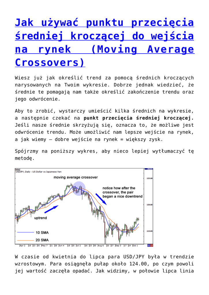 Jak używać punktu przecięcia średniej kroczącej do wejścia na rynek (Moving Average Crossovers) Wiesz już jak określić trend za pomocą średnich kroczących narysowanych na Twoim wykresie. Dobrze jednak wiedzieć, że średnie te pomagają nam także określić zakończenie trendu oraz jego odwrócenie. Aby to zrobić, wystarczy umieścić kilka średnich na wykresie, a następnie czekać na punkt przecięcia średniej kroczącej. Jeśli nasze średnie skrzyżują się, oznacza to, że możliwe jest odwrócenie trendu. Może umożliwić nam lepsze wejście na rynek, a jak wiemy – dobre wejście na rynek = większy zysk. Spójrzmy na poniższy wykres, aby nieco lepiej wytłumaczyć tę metodę. W czasie od kwietnia do lipca para USD/JPY była w trendzie wzrostowym. Para osiągnęła pułap około 124.00, po czym powoli jej wartość zaczęła opadać. Jak widzimy, w połowie lipca linia 10 SMA przecięła linię 20 SMA. Co stało się dalej? Po przecięciu średniej kroczącej nastąpił trend spadkowy. Jeśli miałeś zlecenie krótkiej pozycji w czasie przecięcia średniej, prawdopodobnie miałbyś teraz w kieszeni bardzo dużą ilość pipsów. Oczywiście na każda taka sytuacja przyniesie takie zyski. Może się okazać, że źle wejdziesz na rynek. Trzeba wziąć pod uwagę gdzie i kiedy umieścić swoje zlecenia Stop Loss żeby nie ponieść strat. Nie można tak po prostu wchodzić na rynek bez żadnego planu. Niektórzy inwestorzy zamykają swoje pozycje w momencie przecięcia lub w momencie, gdy cena przekracza wcześniej określoną ilość pipsów. Podczas tej metody musimy brać pod uwagę, że działa ona gdy cena posiada swój trend lub jest po prostu zmienna, lecz gorzej gdy cena utrzymuje się w jednej pozycji. W swojej karierze inwestora przecięcia średnich dosięgną Cię niejednokrotnie, tak samo jak niejednokrotnie zostaniesz zatrzymany ze swoimi planami, zanim na nowo złapiesz trend. Źródło:http://www.babypips.com/school/elementary/moving-averag es/moving-average-crossover-trading.html