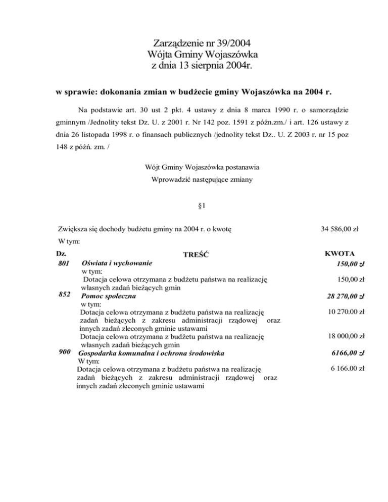 Zarządzenie nr 39/2004 Wójta Gminy Wojaszówka z dnia 13