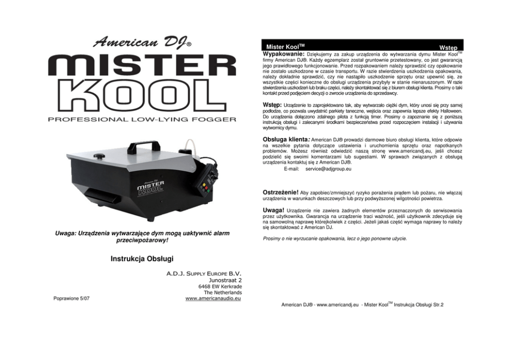 Mister KoolTM Wstęp Wypakowanie: Dziękujemy za zakup urządzenia do wytwarzania dymu Mister KoolTM firmy American DJ®. KaŜdy egzemplarz został gruntownie przetestowany, co jest gwarancją jego prawidłowego funkcjonowanie. Przed rozpakowaniem naleŜy sprawdzić czy opakowanie nie zostało uszkodzone w czasie transportu. W razie stwierdzenia uszkodzenia opakowania, naleŜy dokładnie sprawdzić, czy nie nastąpiło uszkodzenie sprzętu oraz upewnić się, ze wszystkie części konieczne do obsługi urządzenia przybyły w stanie nienaruszonym. W razie stwierdzenia uszkodzeń lub braku części, naleŜy skontaktować się z biurem obsługi klienta. Prosimy o taki kontakt przed podjęciem decyzji o zwrocie urządzenia do sprzedawcy. Wstęp: Urządzenie to zaprojektowano tak, aby wytwarzało cięŜki dym, który unosi się przy samej podłodze, co pozwala uwydatnić parkiety taneczne, wejścia oraz zapewnia lepsze efekty Halloween. Do urządzenia dołączono zdalnego pilota z funkcją timer. Prosimy o zapoznanie się z poniŜszą instrukcją obsługi i zalecanymi środkami bezpieczeństwa przed rozpoczęciem instalacji i uŜywania wytwornicy dymu. Obsługa klienta: American DJ® prowadzi darmowe biuro obsługi klienta, które odpowie na wszelkie pytania dotyczące ustawienia i uruchomienia sprzętu oraz napotkanych problemów. MoŜesz równieŜ odwiedzić naszą stronę www.americandj.eu, jeśli chcesz podzielić się swoimi komentarzami lub sugestiami. W sprawach związanych z obsługą urządzenia kontaktuj się z American DJ®. E-mail: [email protected] OstrzeŜenie! Aby zapobiec/zmniejszyć ryzyko poraŜenia prądem lub poŜaru, nie włączaj urządzenia w warunkach deszczowych lub przy podwyŜszonej wilgotności powietrza. Uwaga! Urządzenie nie zawiera Ŝadnych elementów przeznaczonych do serwisowania przez uŜytkownika. Gwarancja na urządzenie traci waŜność, jeśli uŜytkownik zdecyduje się na samowolną naprawę którejkolwiek z części. JeŜeli jakaś część wymaga naprawy to naleŜy się skontaktować z American DJ. Uwaga: Urządzenia wytwarzające dym mogą uaktywnić alarm przeciwpoŜarowy! Prosimy o nie wyrzucanie opakowania, lecz o jego ponowne uŜycie. Instrukcja Obsługi A.D.J. SUPPLY EUROPE B.V. Junostraat 2 Poprawione 5/07 6468 EW Kerkrade The Netherlands www.americanaudio.eu American DJ® - www.americandj.eu - Mister KoolTM Instrukcja Obsługi Str.2 TM Mister Kool • • • • • • • • • • • • • • • • • Środki Bezpieczeństwa Zachowaj opakowanie na wypadek konieczności odesłania urządzenia do naprawy. Trzymaj urządzenie z dala od wody lub innych płynów. Upewnij się, Ŝe cały płyn do wytwarzania mgły znajduje się w pojemniku do tego przeznaczonym. Upewnij się, Ŝe napięcie pobierane przez maszynę jest takie samo jak napięcie w sieci. Pod Ŝadnym pozorem nie ściągaj wierzchniej obudowy. Urządzenie nie zawiera Ŝadnych elementów przeznaczonych do serwisowania przez uŜytkownika. Wyłącz urządzenie z sieci, jeśli nie korzystasz z niego przez dłuŜszy czas. Nie podłączaj urządzenia Mister KoolTM do zestawu ściemniaczy dimmer pack. Nie uŜywaj urządzenia, jeśli jakikolwiek jego element uległ uszkodzeniu. Nie uruchamiaj urządzenia, jeśli pokrywa obudowy jest zdjęta. Aby zmniejszyć ryzyko poraŜenia prądem lub poŜaru, nie włączaj urządzenia w warunkach deszczowych lub przy podwyŜszonej wilgotności powietrza. Nie uruchamiaj urządzenia, jeśli przewód zasilający jest uszkodzony. Nie próbuj usunąć lub wyłamać bolca uziemienia z wtyczki. Jego zadaniem jest zabezpieczenie przed poraŜeniem prądem i poŜarem w wypadku zwarcia wewnątrz urządzenia. Wyciągnij wtyczkę z kontaktu zanim włączysz Mister KoolTM do obwodu zawierającego inne urządzenia elektroniczne. Nie zasłaniaj otworów wentylacyjnych. Instaluj urządzenie tylko w miejscach zapewniających dobrą wentylację. Odstęp pomiędzy urządzeniem i ścianą nie powinien być mniejszy niŜ 15cm. Urządzenie jest przeznaczone tylko do uŜytku wewnątrz budynku. Gwarancja na urządzenie straci waŜność, jeśli zostanie ono uŜyte na dworze. Instaluj urządzenie tak, aby było ono stabilne i bezpieczne. Przewód zasilania ułóŜ tak, aby nikt po nim nie chodził ani teŜ niczego na nim nie stawiał. Urządzenie powinno być serwisowane przez wykwalifikowany personel w przypadku, gdy: A. Przewód zasilania lub wtyczka są uszkodzone. B. Coś spadło na urządzenie lub zostało ono zalane wodą lub innym płynem. C. Urządzenie nie zostało schowane przed deszczem. D. Urządzenie nie działa normalnie. American DJ® - www.americandj.eu - Mister KoolTM Instrukcja Obsługi Str.3 TM Mister Kool 1. 2. 3. 4. 5. 6. 7. 8. Podłączenie Otwórz opakowanie i ostroŜnie wyjmij urządzenie. Upewnij się, Ŝe usunąłeś wszystkie elementy opakowania, szczególnie wokół dyszy. Ustaw maszynę do mgły na płaskiej, suchej powierzchni i odkręć gałkę znajdującą się na górnej pokrywie. Otwórz pokrywę i napełnij wnętrze urządzenia lodem. Zdejmij nakrętkę pojemnika umieszczonego u góry urządzenia. Napełnij pojemnik płynem do wytwarzania dymu firmy American DJ® a następnie włóŜ nakrętkę na miejsce. Umieść rurkę w pojemniku na wodę (water bag). Gdy lód stopi się, woda z niego powstała napełni pojemnik na wodę. Podłącz urządzenie do odpowiedniego źródła zasilania i ustaw włącznik w pozycji ON. Postępuj zgodnie z zamieszczonymi na następnej stronie instrukcjami. Zawsze upewnij się, ze w zbiorniku jest wystarczająca ilość płynu firmowego American DJ® Brand Fog JuiceTM. Uruchomienie maszyny bez płynu w zbiorniku spowoduje uszkodzenie pompy i/lub zatkanie urządzenia. Jest to główną przyczyną awarii tego typu urządzeń. American DJ® - www.americandj.eu - Mister KoolTM Instrukcja Obsługi Str.4 Mister KoolTM Instrukcja Obsługi Czas nagrzewania urządzenia wynosi 5 minut. Gdy urządzenie jest rozgrzane 