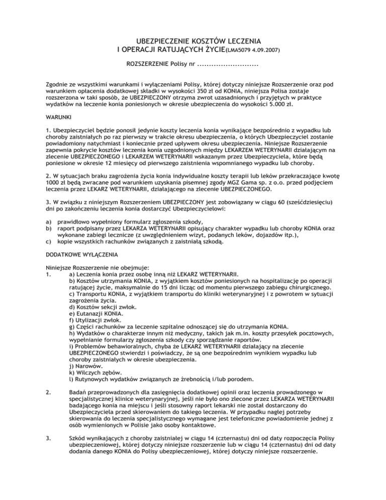 UBEZPIECZENIE KOSZTÓW LECZENIA I OPERACJI RATUJĄCYCH ŻYCIE(LMA5079 4.09.2007) ROZSZERZENIE Polisy nr .......................... Zgodnie ze wszystkimi warunkami i wyłączeniami Polisy, której dotyczy niniejsze Rozszerzenie oraz pod warunkiem opłacenia dodatkowej składki w wysokości 350 zł od KONIA, niniejsza Polisa zostaje rozszerzona w taki sposób, że UBEZPIECZONY otrzyma zwrot uzasadnionych i przyjętych w praktyce wydatków na leczenie konia poniesionych w okresie ubezpieczenia do wysokości 5.000 zł. WARUNKI 1. Ubezpieczyciel będzie ponosił jedynie koszty leczenia konia wynikające bezpośrednio z wypadku lub choroby zaistniałych po raz pierwszy w trakcie okresu ubezpieczenia, o których Ubezpieczyciel zostanie powiadomiony natychmiast i koniecznie przed upływem okresu ubezpieczenia. Niniejsze Rozszerzenie zapewnia pokrycie kosztów leczenia konia uzgodnionych między LEKARZEM WETERYNARII działającym na zlecenie UBEZPIECZONEGO i LEKARZEM WETERYNARII wskazanym przez Ubezpieczyciela, które będą poniesione w okresie 12 miesięcy od pierwszego zaistnienia wspomnianego wypadku lub choroby. 2. W sytuacjach braku zagrożenia życia konia indywidualne koszty terapii lub leków przekraczające kwotę 1000 zł będą zwracane pod warunkiem uzyskania pisemnej zgody MGZ Gama sp. z o.o. przed podjęciem leczenia przez LEKARZ WETERYNARII, działającego na zlecenie UBEZPIECZONEGO. 3. W związku z niniejszym Rozszerzeniem UBEZPIECZONY jest zobowiązany w ciągu 60 (sześćdziesięciu) dni po zakończeniu leczenia konia dostarczyć Ubezpieczycielowi: a) prawidłowo wypełniony formularz zgłoszenia szkody, b) raport podpisany przez LEKARZA WETERYNARII opisujący charakter wypadku lub choroby KONIA oraz wykonane zabiegi lecznicze (z uwzględnieniem wizyt, podanych leków, dojazdów itp.), c) kopie wszystkich rachunków związanych z zaistniałą szkodą. DODATKOWE WYŁĄCZENIA Niniejsze Rozszerzenie nie obejmuje: 1. a) Leczenia konia przez osobę inną niż LEKARZ WETERYNARII. b) Kosztów utrzymania KONIA, z wyjątkiem kosztów poniesionych na hospitalizację po operacji ratującej życie, maksymalnie do 15 dni licząc od momentu pierwszego zabiegu chirurgicznego. c) Transportu KONIA, z wyjątkiem transportu do kliniki weterynaryjnej i z powrotem w sytuacji zagrożenia życia. d) Kosztów sekcji zwłok. e) Eutanazji KONIA. f) Utylizacji zwłok. g) Części rachunków za leczenie szpitalne odnoszącej się do utrzymania KONIA. h) Wydatków o charakterze innym niż medyczny, takich jak m.in. koszty przesyłek pocztowych, wypełnianie formularzy zgłoszenia szkody czy sporządzanie raportów. i) Problemów behawioralnych, chyba że LEKARZ WETERYNARII działający na zlecenie UBEZPIECZONEGO stwierdzi i poświadczy, że są one bezpośrednim wynikiem wypadku lub choroby zaistniałych w okresie ubezpieczenia. j) Narowów. k) Wilczych zębów. l) Rutynowych wydatków związanych ze źrebnością i/lub porodem. 2. Badań przeprowadzonych dla zasięgnięcia dodatkowej opinii oraz leczenia prowadzonego w specjalistycznej klinice weterynaryjnej, jeśli nie było ono zlecone przez LEKARZA WETERYNARII badającego konia na miejscu i jeśli stosowny raport lekarski nie został dostarczony do Ubezpieczyciela przed skierowaniem do takiego leczenia. W przypadku nagłej potrzeby skierowania do leczenia specjalistycznego wymagane jest telefoniczne powiadomienie jednej z osób wymienionych w Polisie jako osoby kontaktowe. 3. Szkód wynikających z choroby zaistniałej w ciągu 14 (czternastu) dni od daty rozpoczęcia Polisy ubezpieczeniowej, której dotyczy niniejsze rozszerzenie lub w ciągu 14 (czternastu) dni od daty dodania danego KONIA do Polisy ubezpieczeniowej, której dotyczy niniejsze rozszerzenie. 4. Kosztów leczenia alternatywnego metodami takimi jak m.in. osteopatia, fizjoterapia, akupunktura, hydroterapia i inne tym podobne, chyba że LEKARZ WETERYNARII wskazany przez Ubezpieczyciela wyrazi na nie zgodę na piśmie przed rozpoczęciem leczenia. UDZIAŁ WŁASNY Ubezpieczyciel nie wypłaci z każdej pojedynczej szkody sumy 500 zł lub 15% szkody (wybierając w każdym przypadku większą z tych sum). Dodatkowo po odjęciu wyżej opisanego UDZIAŁU WŁASNEGO, Ubezpieczyciel nie wypłaci 50% kosztów związanych z tomografią lub scyntygrafią. DEFINICJE (dotyczące niniejszego Rozszerzenia): UDZIAŁ WŁASNY oznacza koszt ponoszony przez UBEZPIECZONEGO w wypadku szkody lub szkód objętych niniejszym ubezpieczeniem. Słowa i wyrażenia zapisane wielkimi literami (z wyjątkiem tytułów paragrafów) są opisane w DEFINICJACH powyżej lub w Polisie ubezpieczeniowej, której częścią jest niniejsze Rozszerzenie. Piastów, dnia Podpisano przez MGZ Gama Sp. z o.o. w imieniu Catlin at Lloyd’s