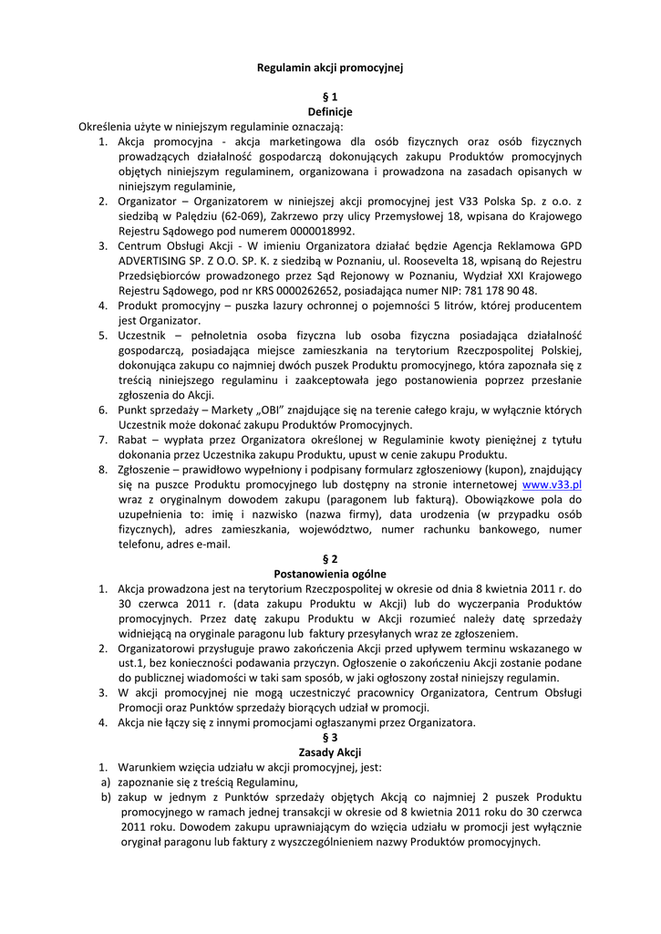 Regulamin akcji promocyjnej §1 Definicje Określenia użyte w niniejszym regulaminie oznaczają: 1. Akcja promocyjna - akcja marketingowa dla osób fizycznych oraz osób fizycznych prowadzących działalność gospodarczą dokonujących zakupu Produktów promocyjnych objętych niniejszym regulaminem, organizowana i prowadzona na zasadach opisanych w niniejszym regulaminie, 2. Organizator – Organizatorem w niniejszej akcji promocyjnej jest V33 Polska Sp. z o.o. z siedzibą w Palędziu (62-069), Zakrzewo przy ulicy Przemysłowej 18, wpisana do Krajowego Rejestru Sądowego pod numerem 0000018992. 3. Centrum Obsługi Akcji - W imieniu Organizatora działać będzie Agencja Reklamowa GPD ADVERTISING SP. Z O.O. SP. K. z siedzibą w Poznaniu, ul. Roosevelta 18, wpisaną do Rejestru Przedsiębiorców prowadzonego przez Sąd Rejonowy w Poznaniu, Wydział XXI Krajowego Rejestru Sądowego, pod nr KRS 0000262652, posiadająca numer NIP: 781 178 90 48. 4. Produkt promocyjny – puszka lazury ochronnej o pojemności 5 litrów, której producentem jest Organizator. 5. Uczestnik – pełnoletnia osoba fizyczna lub osoba fizyczna posiadająca działalność gospodarczą, posiadająca miejsce zamieszkania na terytorium Rzeczpospolitej Polskiej, dokonująca zakupu co najmniej dwóch puszek Produktu promocyjnego, która zapoznała się z treścią niniejszego regulaminu i zaakceptowała jego postanowienia poprzez przesłanie zgłoszenia do Akcji. 6. Punkt sprzedaży – Markety „OBI” znajdujące się na terenie całego kraju, w wyłącznie których Uczestnik może dokonać zakupu Produktów Promocyjnych. 7. Rabat – wypłata przez Organizatora określonej w Regulaminie kwoty pieniężnej z tytułu dokonania przez Uczestnika zakupu Produktu, upust w cenie zakupu Produktu. 8. Zgłoszenie – prawidłowo wypełniony i podpisany formularz zgłoszeniowy (kupon), znajdujący się na puszce Produktu promocyjnego lub dostępny na stronie internetowej www.v33.pl wraz z oryginalnym dowodem zakupu (paragonem lub fakturą). Obowiązkowe pola do uzupełnienia to: imię i nazwisko (nazwa firmy), data urodzenia (w przypadku osób fizycznych), adres zamieszkania, województwo, numer rachunku bankowego, numer telefonu, adres e-mail. §2 Postanowienia ogólne 1. Akcja prowadzona jest na terytorium Rzeczpospolitej w okresie od dnia 8 kwietnia 2011 r. do 30 czerwca 2011 r. (data zakupu Produktu w Akcji) lub do wyczerpania Produktów promocyjnych. Przez datę zakupu Produktu w Akcji rozumieć należy datę sprzedaży widniejącą na oryginale paragonu lub faktury przesyłanych wraz ze zgłoszeniem. 2. Organizatorowi przysługuje prawo zakończenia Akcji przed upływem terminu wskazanego w ust.1, bez konieczności podawania przyczyn. Ogłoszenie o zakończeniu Akcji zostanie podane do publicznej wiadomości w taki sam sposób, w jaki ogłoszony został niniejszy regulamin. 3. W akcji promocyjnej nie mogą uczestniczyć pracownicy Organizatora, Centrum Obsługi Promocji oraz Punktów sprzedaży biorących udział w promocji. 4. Akcja nie łączy się z innymi promocjami ogłaszanymi przez Organizatora. §3 Zasady Akcji 1. Warunkiem wzięcia udziału w akcji promocyjnej, jest: a) zapoznanie się z treścią Regulaminu, b) zakup w jednym z Punktów sprzedaży objętych Akcją co najmniej 2 puszek Produktu promocyjnego w ramach jednej transakcji w okresie od 8 kwietnia 2011 roku do 30 czerwca 2011 roku. Dowodem zakupu uprawniającym do wzięcia udziału w promocji jest wyłącznie oryginał paragonu lub faktury z wyszczególnieniem nazwy Produktów promocyjnych. 2. Uczestnikowi, który dokonał zakupu dwóch puszek produktu promocyjnego w ramach jednej transakcji zgodnie z punktem 1 przysługuje Rabat w wysokości 40 zł brutto. 3. Jeden Uczestnik ma prawo do uzyskania maksymalnie 5 Rabatów w trakcie trwania całej Akcji. Każde kolejne zgłoszenia nie będą uwzględniane. 4. Celem uzyskania Rabatu Uczestnik powinien z przesłać listem poleconym na adres: Skrytka pocztowa nr 173, 60-697 Poznań 9, z dopiskiem PROMOCJA LAZURA V33, prawidłowo wypełnione i podpisane zgłoszenie wraz oryginalnym dowodem zakupu (paragonem lub fakturą), potwierdzającym zakup co najmniej dwóch puszek Produktu promocyjnego. 5. Wielokrotność zakupu dwóch puszek Produktu promocyjnego w ramach jednej transakcji upoważnia Uczestnika do otrzymania odpowiedniej ilości Rabatów z zastrzeżeniem punku 3 niniejszego paragrafu. 6. W przypadku, gdy Uczestnik dokonał zakupu większej liczby produktów na jednym dowodzie zakupu, niż te objęte Akcją promocyjną a nie chce pozbywać się dowodu zakupu na pozostałe produkty, zobowiązany jest pozyskać oryginalną fakturę na zakup Produktów promocyjnych w odpowiednim dziale obsługi danego Punktu sprzedaży, poprzez odpowiednią korektę pierwotnego dowodu zakupu (paragonu lub faktury) oraz wystawienie nowego dowodu zakupu wyłącznie na Produkty promocyjne. 7. Zgłoszenia należy przesyłać w terminie od 8 kwietnia 2011 roku do 7 lipca 2011 roku (decyduje data stempla pocztowego). Jeżeli Uczestnik wysłał zgłoszenie w wyżej wymienionym terminie a nie dotarła do Centrum Obsługi Akcji do 21 lipca 2011 roku, zgłoszenie takie nie będzie uwzględniane. 8. Organizator za pośrednictwem Centrum Obsługi Akcji dokona weryfikacji zgłoszeń nadsyłanych przez Uczestników pod kątem ich prawdziwości, poprawności oraz kompletności według założeń niniejszego Regulaminu. 9. Nie będą uwzględniane zgłoszenia, które a) zostały wysłane po 7 lipca 2011 roku, b) nie dotarły do Centrum Obsługi Akcji do 21 lipca 2011 roku, c) zawierają paragon lub fakturę gdzie data dokonania zakupu Produktów promocyjnych nie jest z okresu od 1 kwietnia 2011 roku do 30 czerwca 2011 roku, d) nie zawierają wcale lub nie zawierają oryginalnych dowodów zakupu Produktów promocyjnych, e) zawierają dowody zakupu Produktów promocyjnych, które są nieczytelne, zniszczone w stopniu utrudniającym identyfik