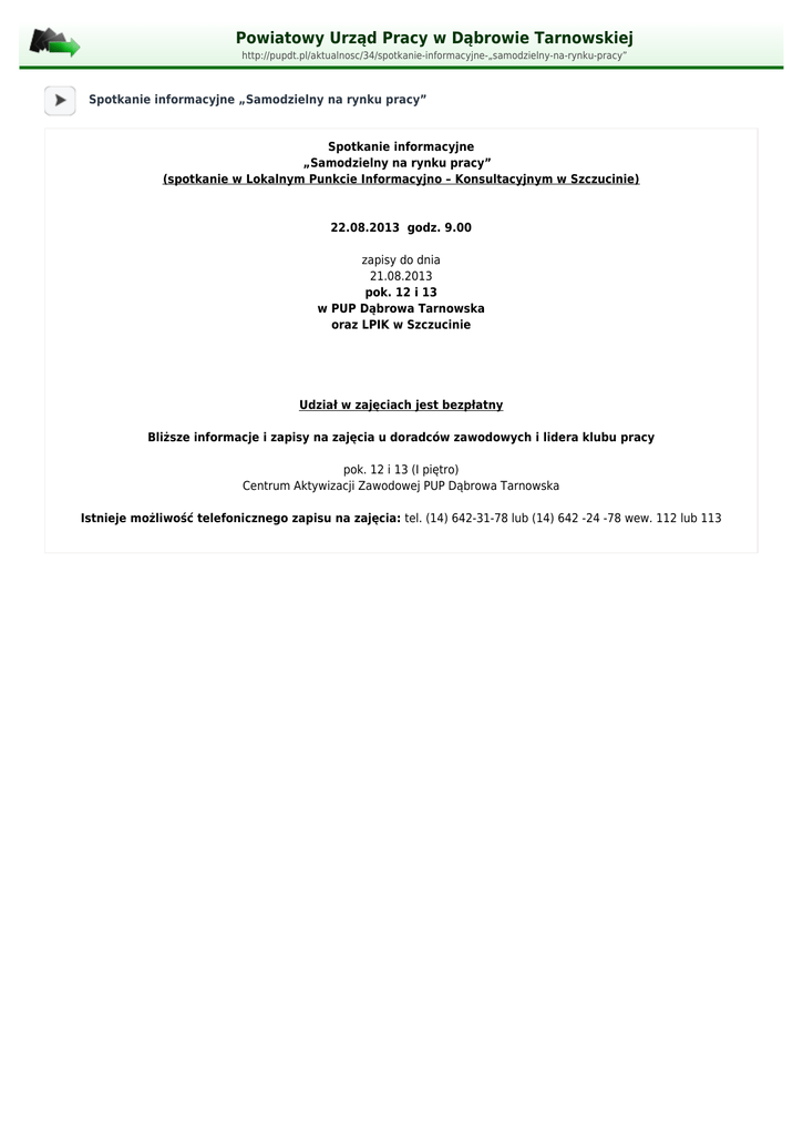Powiatowy Urząd Pracy w Dąbrowie Tarnowskiej http://pupdt.pl/aktualnosc/34/spotkanie-informacyjne-„samodzielny-na-rynku-pracy” Spotkanie informacyjne „Samodzielny na rynku pracy” Spotkanie informacyjne „Samodzielny na rynku pracy” (spotkanie w Lokalnym Punkcie Informacyjno – Konsultacyjnym w Szczucinie) 22.08.2013 godz. 9.00 zapisy do dnia 21.08.2013 pok. 12 i 13 w PUP Dąbrowa Tarnowska oraz LPIK w Szczucinie Udział w zajęciach jest bezpłatny Bliższe informacje i zapisy na zajęcia u doradców zawodowych i lidera klubu pracy pok. 12 i 13 (I piętro) Centrum Aktywizacji Zawodowej PUP Dąbrowa Tarnowska Istnieje możliwość telefonicznego zapisu na zajęcia: tel. (14) 642-31-78 lub (14) 642 -24 -78 wew. 112 lub 113
