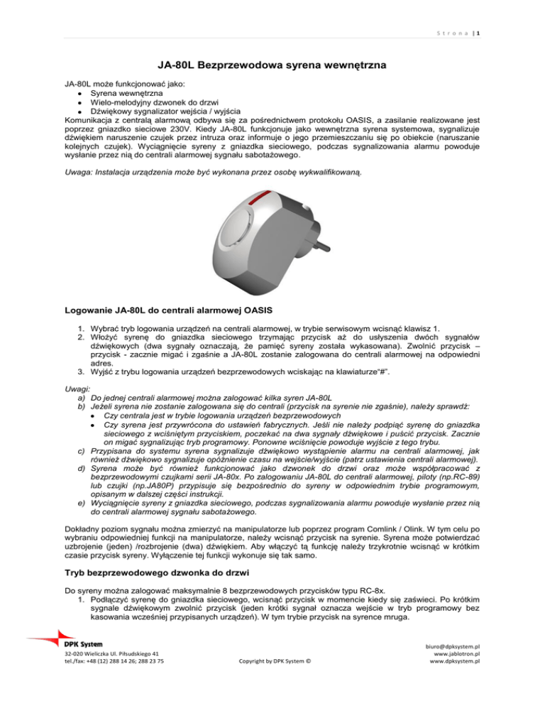 S t r o n a |1 JA-80L Bezprzewodowa syrena wewnętrzna JA-80L może funkcjonować jako: Syrena wewnętrzna Wielo-melodyjny dzwonek do drzwi Dźwiękowy sygnalizator wejścia / wyjścia Komunikacja z centralą alarmową odbywa się za pośrednictwem protokołu OASIS, a zasilanie realizowane jest poprzez gniazdko sieciowe 230V. Kiedy JA-80L funkcjonuje jako wewnętrzna syrena systemowa, sygnalizuje dźwiękiem naruszenie czujek przez intruza oraz informuje o jego przemieszczaniu się po obiekcie (naruszanie kolejnych czujek). Wyciągnięcie syreny z gniazdka sieciowego, podczas sygnalizowania alarmu powoduje wysłanie przez nią do centrali alarmowej sygnału sabotażowego. Uwaga: Instalacja urządzenia może być wykonana przez osobę wykwalifikowaną. Logowanie JA-80L do centrali alarmowej OASIS 1. Wybrać tryb logowania urządzeń na centrali alarmowej, w trybie serwisowym wcisnąć klawisz 1. 2. Włożyć syrenę do gniazdka sieciowego trzymając przycisk aż do usłyszenia dwóch sygnałów dźwiękowych (dwa sygnały oznaczają, że pamięć syreny została wykasowana). Zwolnić przycisk – przycisk - zacznie migać i zgaśnie a JA-80L zostanie zalogowana do centrali alarmowej na odpowiedni adres. 3. Wyjść z trybu logowania urządzeń bezprzewodowych wciskając na klawiaturze“#”. Uwagi: a) Do jednej centrali alarmowej można zalogować kilka syren JA-80L b) Jeżeli syrena nie zostanie zalogowana się do centrali (przycisk na syrenie nie zgaśnie), należy sprawdź: Czy centrala jest w trybie logowania urządzeń bezprzewodowych Czy syrena jest przywrócona do ustawień fabrycznych. Jeśli nie należy podpiąć syrenę do gniazdka sieciowego z wciśniętym przyciskiem, poczekać na dwa sygnały dźwiękowe i puścić przycisk. Zacznie on migać sygnalizując tryb programowy. Ponowne wciśnięcie powoduje wyjście z tego trybu. c) Przypisana do systemu syrena sygnalizuje dźwiękowo wystąpienie alarmu na centrali alarmowej, jak również dźwiękowo sygnalizuje opóźnienie czasu na wejście/wyjście (patrz ustawienia centrali alarmowej). d) Syrena może być również funkcjonować jako dzwonek do drzwi oraz może współpracować z bezprzewodowymi czujkami serii JA-80x. Po zalogowaniu JA-80L do centrali alarmowej, piloty (np.RC-89) lub czujki (np.JA80P) przypisuje się bezpośrednio do syreny w odpowiednim trybie programowym, opisanym w dalszej części instrukcji. e) Wyciągnięcie syreny z gniazdka sieciowego, podczas sygnalizowania alarmu powoduje wysłanie przez nią do centrali alarmowej sygnału sabotażowego. Dokładny poziom sygnału można zmierzyć na manipulatorze lub poprzez program Comlink / Olink. W tym celu po wybraniu odpowiedniej funkcji na manipulatorze, należy wcisnąć przycisk na syrenie. Syrena może potwierdzać uzbrojenie (jeden) /rozbrojenie (dwa) dźwiękiem. Aby włączyć tą funkcję należy trzykrotnie wcisnąć w krótkim czasie przycisk syreny. Wyłączenie tej funkcji wykonuje się tak samo. Tryb bezprzewodowego dzwonka do drzwi Do syreny można zalogować maksymalnie 8 bezprzewodowych przycisków typu RC-8x. 1. Podłączyć syrenę do gniazdka sieciowego, wcisnąć przycisk w momencie kiedy się zaświeci. Po krótkim sygnale dźwiękowym zwolnić przycisk (jeden krótki sygnał oznacza wejście w tryb programowy bez kasowania wcześniej przypisanych urządzeń). W tym trybie przycisk na syrence mruga. 32-020 Wieliczka Ul. Piłsudskiego 41 tel./fax: +48 (12) 288 14 26; 288 23 75 Copyright by DPK System © [email protected] www.jablotron.pl www.dpksystem.pl S t r o n a |2 2. Logowanie przycisku dzwonkowego/pilota do syreny następuje po jego aktywowaniu przez wciśnięcie (syrena zagra melodyjkę). Wielokrotne naciśnięcie przycisku dzwonkowego/pilota, pozwala na wybór odpowiedniej melodii. 3. Wyjście z trybu logowania urządzeń następuje przez wciśnięcie na syrenie JA-80L przycisku. Dźwiękowy sygnalizator wejścia/wyjścia Do syreny można zalogować maksymalnie 8 bezprzewodowych czujek typu JA-8x: 1. Podłączyć syrenę do gniazdka sieciowego, wcisnąć przycisk w momencie kiedy się zaświeci. Po krótkim sygnale dźwiękowym zwolnić przycisk (jeden krótki sygnał oznacza wejście w tryb programowy bez kasowania wcześniej przypisanych urządzeń). W tym trybie przycisk na syrence mruga. 2. Logowanie czujki do syreny następuje przez wciśnięcie i puszczenie na czujce przycisku sabotażowego. Ponowne wciśnięcie powoduje zmianę odgrywanej melodii. 3. Wyjście z trybu logowania urządzeń następuje przez wciśnięcie na syrenie JA-80L przycisku. Uwaga: Sygnalizacja dźwiękowa na syrenie następuje po wzbudzeniu/aktywowaniu zalogowanego do niej czujki. Maksymalna liczba logowanych urządzeń Do syreny JA-80L można przypisać maksymalnie 8 urządzeń bezprzewodowych (sterowniki/piloty) oraz jedną centralę serii JA-8x OASIS. Kasowanie zalogowanych urządzeń Aby wykasować zalogowane do syreny urządzenia należy: 1. Podłączyć syrenkę z gniazdka sieciowego. 2. Nacisnąć i przytrzymać przycisk na syrenie podczas wkładania do gniazdka 3. Po usłyszeniu dwóch sygnałów dźwiękowych, wszystkie urządzenia włącznie z centralą alarmową zostaną wykasowane z pamięci, a syrena wejdzie do trybu logowania urządzeń. Logowanie nowych urządzeń odbywa się tak jak było to opisane wcześniej. 4. Wyjście z trybu dodawania logowania następuje przez wciśnięcie na syrenie JA-80L przycisku. Uwaga: Jeżeli pamięć syreny zostanie wykasowana, ale JA-80L będzie nadal zalogowana do centrali, centrala będzie pokazywać ten stan jako odłączenie syreny od zasilania, a JA-80L nie będzie reagować na sygnały wysłane z centrali. Ustawienie poziomu głośności Syrena JA-80L powinna być włączona do zasilania Wcisnąć i przytrzymać przycisk na syrenie Po ok. 2 sekundach usłyszysz melodię o innym natężeniu dźwięku Zwolnić przycisk Ustawienie głośności dotyczy pracy syreny jako bezprzewodowy dzwonek, lub jako s