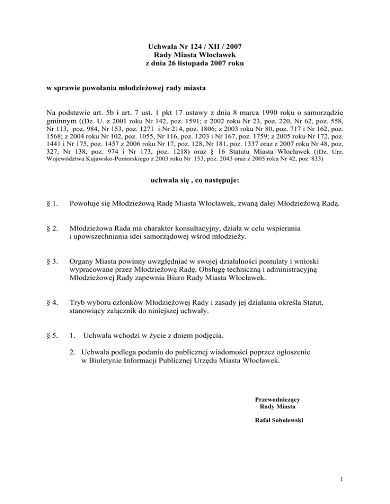 Uchwała Nr 124 / XII / 2007 Rady Miasta Włocławek z dnia 26