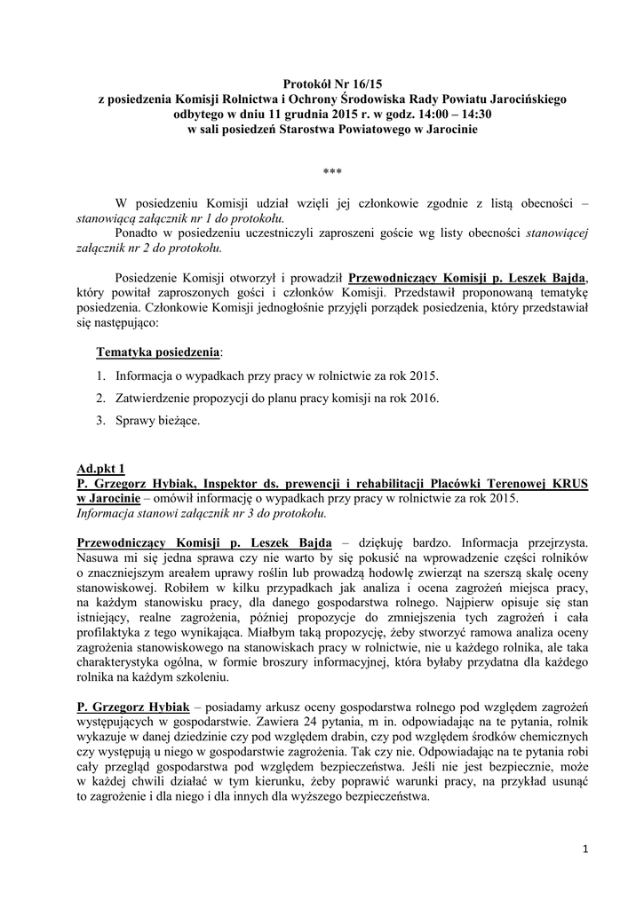 Protokół Nr 16/15 z posiedzenia Komisji Rolnictwa i Ochrony Środowiska Rady Powiatu Jarocińskiego odbytego w dniu 11 grudnia 2015 r. w godz. 14:00 – 14:30 w sali posiedzeń Starostwa Powiatowego w Jarocinie *** W posiedzeniu Komisji udział wzięli jej członkowie zgodnie z listą obecności – stanowiącą załącznik nr 1 do protokołu. Ponadto w posiedzeniu uczestniczyli zaproszeni goście wg listy obecności stanowiącej załącznik nr 2 do protokołu. Posiedzenie Komisji otworzył i prowadził Przewodniczący Komisji p. Leszek Bajda, który powitał zaproszonych gości i członków Komisji. Przedstawił proponowaną tematykę posiedzenia. Członkowie Komisji jednogłośnie przyjęli porządek posiedzenia, który przedstawiał się następująco: Tematyka posiedzenia: 1. Informacja o wypadkach przy pracy w rolnictwie za rok 2015. 2. Zatwierdzenie propozycji do planu pracy komisji na rok 2016. 3. Sprawy bieżące. Ad.pkt 1 P. Grzegorz Hybiak, Inspektor ds. prewencji i rehabilitacji Placówki Terenowej KRUS w Jarocinie – omówił informację o wypadkach przy pracy w rolnictwie za rok 2015. Informacja stanowi załącznik nr 3 do protokołu. Przewodniczący Komisji p. Leszek Bajda – dziękuję bardzo. Informacja przejrzysta. Nasuwa mi się jedna sprawa czy nie warto by się pokusić na wprowadzenie części rolników o znaczniejszym areałem uprawy roślin lub prowadzą hodowlę zwierząt na szerszą skalę oceny stanowiskowej. Robiłem w kilku przypadkach jak analiza i ocena zagrożeń miejsca pracy, na każdym stanowisku pracy, dla danego gospodarstwa rolnego. Najpierw opisuje się stan istniejący, realne zagrożenia, później propozycje do zmniejszenia tych zagrożeń i cała profilaktyka z tego wynikająca. Miałbym taką propozycję, żeby stworzyć ramowa analiza oceny zagrożenia stanowiskowego na stanowiskach pracy w rolnictwie, nie u każdego rolnika, ale taka charakterystyka ogólna, w formie broszury informacyjnej, która byłaby przydatna dla każdego rolnika na każdym szkoleniu. P. Grzegorz Hybiak – posiadamy arkusz oceny gospodarstwa rolnego pod względem zagrożeń występujących w gospodarstwie. Zawiera 24 pytania, m in. odpowiadając na te pytania, rolnik wykazuje w danej dziedzinie czy pod względem drabin, czy pod względem środków chemicznych czy występują u niego w gospodarstwie zagrożenia. Tak czy nie. Odpowiadając na te pytania robi cały przegląd gospodarstwa pod względem bezpieczeństwa. Jeśli nie jest bezpiecznie, może w każdej chwili działać w tym kierunku, żeby poprawić warunki pracy, na przykład usunąć to zagrożenie i dla niego i dla innych dla wyższego bezpieczeństwa. 1 Przewodniczący Komisji p. Leszek Bajda – częściowo rozwiązuje to na pewno. Upadek na śliskiej, nierównej powierzchni. Jest to dobry początek, tylko mogę proponować, nie wolno mi rządzić firmie ubezpieczeniowej, co ma robić P. Grzegorz Hybiak – oceny gospodarstwa rolnego, podzielone pytania są grupy tematyczne: maszyny rolnicze, budynki inwentarskie. Wykazują wszystkie zagrożenia. Organizujemy do poprawy bezpieczeństwa poszerzenia świadomości zagrożenia, co rocznie konkurs „Bezpieczne Gospodarstwo Rolne”. Jest komisja, która ocenia dane gospodarstwo, stwierdza zagrożenia, dla zwycięzców w konkursie ogólnokrajowym jest ciągnik rolniczy. Radny K. Matuszak – za chwilę mamy konkurs Zasłużeni dla Powiatu, po raz pierwszy jest kategoria rolnik roku. Myślę, że kwestie związane z bhp podkreślić, brać pod uwagę przy wyborze, żeby podkreślić, że pod kątem higieny pracy jest wybór odpowiedni. Przewodniczący Komisji p. Leszek Bajda – było spotkanie w Wielkopolskiej Izbie Rolniczej i mówiliśmy, że kategoria została uruchomiona. Poszerzenie o sprawy ubezpieczeniowe, o ochronę zdrowia i życia byłyby mile widziane. Zgłoszenia są do końca grudnia. Ad.pkt.2 Przewodniczący Komisji p. Leszek Bajda – przedstawił propozycje do planu pracy Komisji Rolnictwa na 2016 rok. Projekt planu pracy komisji stanowi załącznik nr 4 do protokołu. Propozycje żadne dodatkowe nie wpłynęły do Biura Rady. Następnie poddał projekt uchwały pod głosowanie. W głosowaniu wzięło udział 7 członków Komisji i wszyscy głosowali „za” zatwierdzeniem propozycji planu pracy Komisji na 2016 rok. Ad.pkt.3 Przewodniczący Komisji p. Leszek Bajda – przedstawił do zaopiniowania projekt uchwały w sprawie planu pracy Rady Powiatu Jarocińskiego na 2016 rok. Projekt uchwały stanowi załącznik nr 5 do protokołu. Dyskusji nie było. Następnie poddał pod głosowanie w/w plan pracy. W głosowaniu wzięło udział 7 członków Komisji i wszyscy głosowali „za”. Projekt uchwały został zaopiniowany pozytywnie. Przewodniczący Komisji p. Leszek Bajda - przedkładam do rozpatrzenia projekt uchwały Rady Powiatu Jarocińskiego w sprawie zmian w budżecie powiatu na 2015 rok. Projekt uchwały stanowi załącznik nr 6 do protokołu. P. Sł. Frydryszak, Starostwo Powiatowe w Jarocinie – omówił zmiany w budżecie na 2015 rok. Przewodniczący Komisji Rolnictwa i Ochrony Środowiska p. Leszek Bajda – dziękuję bardzo otwieram dyskusję? Czy ktoś chciałby zabrać głos? Nie widzę. Przechodzimy do głosowania. 2 Kto z członków komisji jest „za” przyjęciem proponowanych zmian w zakresie działania Komisji? Głosujemy. Dziękuję. Kto jest „przeciwny”? Nie ma. Kto się „wstrzymał”? Nie ma. W głosowaniu wzięło udział 7 członków Komisji Rolnictwa i Ochrony Środowiska, wszyscy głosowali „za”. Projekt uchwały został pozytywnie zaopiniowany Przewodniczący Komisji p. Leszek Bajda – odczytał odpowiedzi z zarządu Powiatu na wnioski Komisji. Kopie pism stanowią załącznik nr 7 do protokołu. Z uwagi na wyczerpanie porządku posiedzenia p. Przewodniczący Komisji zakończył obrady. Przewodniczący Komisji Leszek Bajda Protokołowała: A. Przymusińska 3