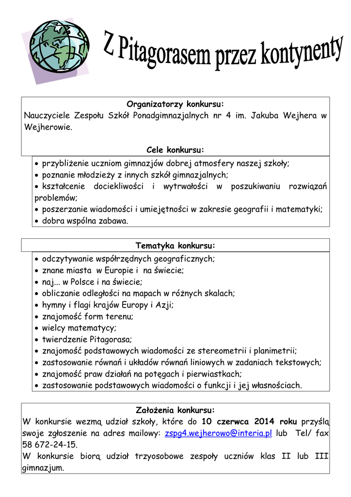 Organizatorzy konkursu: Nauczyciele Zespołu Szkół Ponadgimnazjalnych nr 4 im. Jakuba Wejhera w Wejherowie. Cele konkursu: przybliżenie uczniom gimnazjów dobrej atmosfery naszej szkoły; poznanie młodzieży z innych szkół gimnazjalnych; kształcenie dociekliwości i wytrwałości w poszukiwaniu rozwiązań problemów; poszerzanie wiadomości i umiejętności w zakresie geografii i matematyki; dobra wspólna zabawa. Tematyka konkursu: odczytywanie współrzędnych geograficznych; znane miasta w Europie i na świecie; naj... w Polsce i na świecie; obliczanie odległości na mapach w różnych skalach; hymny i flagi krajów Europy i Azji; znajomość form terenu; wielcy matematycy; twierdzenie Pitagorasa; znajomość podstawowych wiadomości ze stereometrii i planimetrii; zastosowanie równań i układów równań liniowych w zadaniach tekstowych; znajomość praw działań na potęgach i pierwiastkach; zastosowanie podstawowych wiadomości o funkcji i jej własnościach. Założenia konkursu: W konkursie wezmą udział szkoły, które do 10 czerwca 2014 roku przyślą swoje zgłoszenie na adres mailowy: [email protected] lub Tel/ fax 58 672-24-15. W konkursie biorą udział trzyosobowe zespoły uczniów klas II lub III gimnazjum. Zapraszamy również pięcioosobowe zespoły kibiców. Termin konkursu: 16 czerwca 2014 r. (poniedziałek) godz. 10.00 Miejsce konkursu: Zespół Szkół Ponadgimnazjalnych nr 4 im. J. Wejhera ul. Sobieskiego 344; 84-220 Wejherowo Ze swojej strony obiecujemy dołożyć wszelkich starań, aby zapewnić wszystkim dobrą zabawę i wyśmienitą atmosferę.