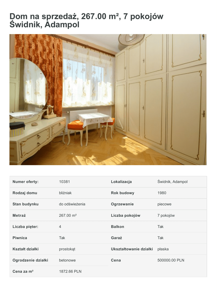 Dom na sprzedaż, 267.00 m², 7 pokojów Świdnik, Adampol Numer oferty: 10381 Lokalizacja Świdnik, Adampol Rodzaj domu bliźniak Rok budowy 1980 Stan budynku do odświeżenia Ogrzewanie piecowe Metraż 267.00 m² Liczba pokojów 7 pokojów Liczba pięter: 4 Balkon Tak Piwnica Tak Garaż Tak Kształt działki prostokąt Ukształtowanie działki płaska Ogrodzenie działki betonowe Cena 500000.00 PLN Cena za m² 1872.66 PLN Bliżniak w Świdniku, os. Adampol 7 pokoi, 185m2 powierzchni użytkowej, piwnica, garaż oraz zaadoptowany strych. Działka o powierzchni 407m2 Ogrzewanie węglowe - możliwość przerobienia na gaz. Woda podgrzewana z systemu paneli słonecznych. Wymieniona elewacja, dach, część pomieszczeń po remoncie. Oprócz świetnej lokalizacji przy Centrum w domu jak i na podwórku jest bardzo cicho, nie słychać ulicy. Na poddaszu w najwyższym punkcie 2,40m (kuchnia, pokój) w najniższym 1,40m (sypialnia) Możliwość zaadoptowania dodatkowej łazienki. Stan prawny: własność z Księgą Wieczystą Powierzchnia poszczególnych kondygnacji: piwnica: 78m2 (Garaż, kotłownia, WC, suszarnia, pomieszczenie użytkowe) parter: 83m2 (2P+K+WC+Wiatrołap) I piętro 53m2 (3P+Łaz+Taras) II piętro 53m2 (2P+K+WC) Zapraszam na prezentację Opiekun oferty Kamil Domański Kom.: 533991550 [email protected] Jestśmy do Państwa dyspozycji 7 dni w tygodniu, w godz. 8:00-22:00.