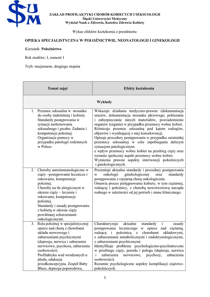 ZAKŁAD PROFILAKTYKI CHORÓB KOBIECYCH I SEKSUOLOGII Śląski Uniwersytet Medyczny Wydział Nauk o Zdrowiu, Katedra Zdrowia Kobiety Wykaz efektów kształcenia z przedmiotu: OPIEKA SPECJALISTYCZNA W POŁOŻNICTWIE, NEONATOLOGII I GINEKOLOGII Kierunek: Położnictwo Rok studiów: I, semestr I Tryb: stacjonarne, drugiego stopnia Temat zajęć Efekty kształcenia Wykłady 1. Przemoc seksualna w stosunku do osoby małoletniej i kobiety. Standardy postępowania w sytuacji molestowania seksualnego i gwałtu. Zadania i kompetencje położnej. Organizacja pomocy w przypadku patologii rodzinnych w Polsce 2. Choroby autoimmunologiczne w ciąży –postępowanie lecznicze i rokowanie, kompetencje położnej. Choroby na tle alergicznym w okresie ciąży – leczenie i rokowanie, kompetencje położnej. Standardy i zasady postępowania z kobietą w okresie ciąży powikłanej schorzeniami onkologicznymi. 3. Rola położnej w specjalistycznej opiece nad chorą z chorobami układu nerwowego i zaburzeniami psychicznymi (depresja, nerwica i zaburzenia nerwicowe, psychoza, zaburzenia osobowości). Profilaktyka wad wrodzonych u płodu, edukacja przedkoncepcyjna. Zespół Baby Blues, depresja poporodowa, Wskazuje działania medyczno-prawne (dokumentacja urazów, dokumentacja stosunku płciowego, pobieranie i zabezpieczanie innych materiałów, powiadomienie organów ścigania) w przypadku przemocy wobec kobiet. Różnicuje przemoc seksualną pod kątem rodzajów, objawów i wynikającej z niej konsekwencji, Opisuje procedury postępowania w przypadku zaistniałej przemocy seksualnej w celu zapobiegania dalszym sytuacjom patologicznym. e wpływ przemocy wobec kobiet na przebieg ciąży oraz rozumie społeczny aspekt przemocy wobec kobiet. Wymienia prawne aspekty interwencji położniczych i ginekologicznych. Prezentuje aktualne standardy i procedury postępowania w onkologii ginekologicznej oraz standardy postępowania z ciężarną chorą onkologicznie. Omawia proces pielęgnowania kobiety, w tym ciężarnej, rodzącej i położnicy, z chorobą nowotworową narządu rodnego w zależności od jej potrzeb i stanu klinicznego. Charakteryzuje aktualne standardy i zasady postępowania leczniczego w opiece nad ciężarną, rodzącą i położnicą z chorobami układowymi, z zaburzeniami metabolicznymi i endokrynologicznymi, z zaburzeniami psychicznymi. Identyfikuje problemy psychologiczno-psychiatryczne w przebiegu ciąży, porodu i połogu (depresja, nerwica i zaburzenia nerwicowe, psychozy, zaburzenia osobowości). Rozumie psychologiczne aspekty komplikacji ciążowopołożniczych. 1 ZAKŁAD PROFILAKTYKI CHORÓB KOBIECYCH I SEKSUOLOGII Śląski Uniwersytet Medyczny Wydział Nauk o Zdrowiu, Katedra Zdrowia Kobiety psychoza poporodową. Wsparcie kobiety i jej rodziny w sytuacji choroby układu nerwowego i zaburzeń psychicznych. Aspekty prawne zawarcia związku małżeńskiego, odpowiedzialności, samoopieki i opieki nad dzieckiem Rozpoznaje problemy psychoseksualne u kobiet po porodzie. Zajęcia praktyczne 4. Rola położnej w profilaktyce, diagnostyce i planowaniu opieki u kobiety ciężarnej, rodzącej i położnicy z chorobami internistycznymi: Choroby układu krążenia w położnictwie. Choroby układu oddechowego w położnictwie. Choroby przewodu pokarmowego (w tym jamy ustnej) w położnictwie. Zaburzenia metaboliczne i endokrynologiczne w położnictwie 1. Standard postępowania na Izbie Przyjęć w przypadku molestowania seksualnego i gwałtu, opieka psychologiczna, tworzenie planu opieki położniczej z uwzględnieniem stanu poszkodowanej. Przemoc seksualna w stosunku do osoby małoletniej i kobiety. Zadania i kompetencje położnej. 2. Planowanie opieki i edukacji u kobiety ciężarnej, rodzącej i położnicy oraz jej dziecka z chorobami internistycznymi: Choroby układu krążenia w położnictwie. Choroby układu oddechowego w położnictwie. Choroby przewodu pokarmowego (w tym jamy ustnej) w położnictwie. Zaburzenia metaboliczne i endokrynologiczne w położnictwie Charakteryzuje aktualne standardy i zasady postępowania leczniczego w opiece nad ciężarną, rodzącą i położnicą z chorobami układowymi, z zaburzeniami metabolicznymi i endokrynologicznymi, z zaburzeniami psychicznymi. Zróżnicuje postępowanie profilaktyczne i pielęgnacyjne w odniesieniu do kobiety ciężarnej, rodzącej i położnicy z chorobami jamy ustnej, z chorobami układowymi, z zaburzeniami metabolicznymi i endokrynologicznymi, z zaburzeniami psychicznymi Postępuje zgodnie z obowiązującymi procedurami w odniesieniu do osoby małoletniej molestowanej seksualnie oraz kobiety zgwałconej. Wykazuje postawę tolerancji wobec praw seksualnych człowieka Potrafi udzielać wsparcia emocjonalnego w przypadku zaistniałej przemocy seksualnej. Wykazuje postawę reagowania w przypadku problemu przemocy w rodzinie, wykorzystania seksualnego i innych patologii rodzinnych Współpracuje w zespole terapeutycznym podejmującym opiekę nad ciężarną, rodzącą i położnicy z chorobami układowymi, z zaburzeniami metabolicznymi i endokrynologicznymi, z zaburzeniami psychicznymi. Udziela porady ciężarnej, rodzącej i położnicy z chorobami układowymi, z zaburzeniami metabolicznymi i endokrynologicznymi, z zaburzeniami psychicznymi w zakresie trybu życia, diety i postępowania profilaktycznego i leczniczego. Przygotowuje pacjentkę z chorobami układowymi, z zaburzeniami metabolicznymi i endokrynologicznymi, z zaburzeniami psychicznymi do samoopieki i samoobserwacji. Uzasadnia związek pomiędzy zdrowiem jamy ustnej z ogólnym zdrowiem ciężarnej oraz motywuje kobiety do systematycznej kontroli stanu jamy ustnej. 2 ZAKŁAD PROFILAKTYKI CHORÓB KOBIECYCH I SEKSUOLOGII Śląski Uniwersytet Medyczny Wydział Nauk o Zdrowiu, Katedra Zdrowia Kobiety 3. Rola położnej w specjalistycznej opiece nad ciężarną, rodząca i położnicą z chorobami układu nerwowego i zaburzeniami psychicznymi (depresja, nerwica i zaburzenia nerwic