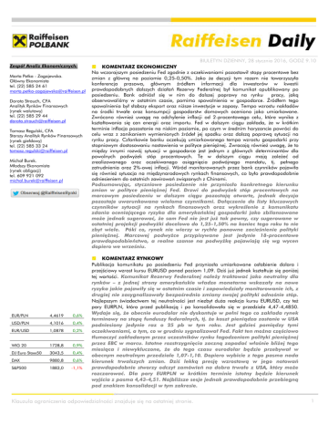 Zespół Analiz Ekonomicznych: Marta Petka - Zagajewska. Główny Ekonomista tel. (22) 585 24 61 [email protected] Dorota Strauch, CFA Analityk Rynków Finansowych (rynek walutowy) tel. (22) 585 29 44 [email protected] Tomasz Regulski, CFA Starszy Analityk Rynków Finansowych (rynek giełdowy) tel. (22) 585 33 24 [email protected] Michał Burek. Młodszy Ekonomista (rynek obligacji) tel. 609 921 092 [email protected] EUR/PLN 4,4619 0,6% USD/PLN 4,1016 0,4% EUR/USD 1,0878 0,2% WIG 20 1728,8 0,9% DJ Euro Stoxx50 3043,5 0,4% DAX 9880,8 0,6% S&P500 1883,0 -1,1% BIULETYN DZIENNY, 28 stycznia 2016, GODZ 9.10 KOMENTARZ EKONOMICZNY Na wczorajszym posiedzeniu Fed zgodnie z oczekiwaniami pozostawił stopy procentowe bez zmian z główną na poziomie 0,25-0,50%. Jako że decyzji tym razem nie towarzyszyła konferencja prasowa, głównym źródłem informacji dla inwestorów w kwestii prawdopodobnych dalszych działań Rezerwy Federalnej był komunikat opublikowany po posiedzeniu. Bank odniósł się w nim do dalszej poprawy na rynku pracy, jaką obserwowaliśmy w ostatnim czasie, pomimo spowolnienia w gospodarce. Źródłem tego spowolnienia był słabszy eksport oraz niższe inwestycje w zapasy. Tempo wzrostu nakładów na środki trwałe oraz konsumpcji gospodarstw domowych oceniono jako umiarkowane. Zwrócono również uwagę na odchylenie inflacji od 2-procentowego celu, które wynika z kształtowania się cen energii oraz importu. Fed w dalszym ciągu zakłada, że w krótkim terminie inflacja pozostanie na niskim poziomie, po czym w średnim horyzoncie powróci do celu wraz z zanikaniem wymienionych źródeł jej spadku oraz dalszą poprawą sytuacji na rynku pracy. Członkowie banku oczekują umiarkowanego tempa wzrostu gospodarki przy stopniowym dostosowaniu nastawienia w polityce pieniężnej. Zwracają również uwagę, że to między innymi rozwój sytuacji w gospodarce jest jednym z głównych determinantów dla powolnych podwyżek stóp procentowych. Te w dalszym ciągu mają zależeć od zrealizowanego oraz oczekiwanego osiągnięcia podwójnego mandatu, tj. pełnego zatrudnienia oraz 2%-owej inflacji. Wśród monitorowanych przez bank czynników pojawiła się również sytuacja na międzynarodowych rynkach finansowych, co było prawdopodobnie odniesieniem do ostatnich zawirowań związanych z Chinami. Podsumowując, styczniowe posiedzenie nie przyniosło konkretnego kierunku zmian w polityce pieniężnej Fed. Drzwi do podwyżek stóp procentowych na marcowym posiedzeniu w dalszym ciągu pozostają otwarte, jednak decyzja pozostaje uwarunkowana wieloma czynnikami. Dołączenie do listy kluczowych czynników sytuacji na rynkach finansowych oraz wykreślenie z komunikatu zdania oceniającego ryzyka dla amerykańskiej gospodarki jako zbilansowane może jednak sugerować, że sam Fed nie jest już tak pewny, czy sugerowane w ostatniej projekcji podwyżki docelowo do 1,25-1,50% na koniec tego roku to nie zbyt wiele. Póki co, rynek nie wierzy w rychłe ponowne zacieśnienie polityki pieniężnej. Marcowej podwyżce przypisywane jest jedynie 18-procentowe prawdopodobieństwo, a realne szanse na podwyżkę pojawiają się wg wycen dopiero we wrześniu. KOMENTARZ RYNKOWY Publikacja komunikatu po posiedzeniu Fed przyniosła umiarkowane osłabienie dolara i przejściowy wzrost kursu EURUSD ponad poziom 1,09. Dziś już jednak kształtuje się poniżej tej wartości. Komunikat Rezerwy Federalnej należy traktować jako neutralny dla rynków – z jednej strony amerykańskie władze monetarne wskazały na nowe ryzyka jakie pojawiły się w ostatnim czasie i zapowiedziały monitorowanie ich, z drugiej nie zasygnalizowały bezpośrednio zmiany swojej polityki odnośnie stóp. Najlepszym świadectwem tej neutralności jest niezbyt duża reakcja kursu EURUSD, czy też pary EURPLN, która przed publikacją i po konsolidowała się w przedziale 4,47-4,4850. Wydaje się, że obecnie eurodolar nie dyskontuje w pełni tego co zakłada rynek terminowy na stopę funduszy federalnych, tj. że koszt pieniądza zostanie w USA podniesiony jedynie raz o 25 pb w tym roku. Jest gdzieś pomiędzy tymi oczekiwaniami, a tym, co w grudniu sygnalizował Fed. Fakt ten można częściowo tłumaczyć zakładanym przez uczestników rynku łagodzeniem polityki pieniężnej przez EBC w marcu. Istotne rozstrzygnięcia zaczną zapadać właśnie bliżej tego miesiąca i niewykluczone, że do tego czasu eurodolar będzie przebywał w obecnym neutralnym przedziale 1,07-1,10. Dopiero wybicie z tego pasma nada kierunek trwalszych zmian. Dziś lekką presję wzrostową w jego notowań prawdopodobnie stworzy odczyt zamówień na dobra trwałe z USA, który może rozczarować. Dla pary EURPLN w krótkim terminie istotny będzie kierunek wyjścia z pasma 4,43-4,51. Najbliższe sesje jednak prawdopodobnie przebiegną pod znakiem konsolidacji w tym zakresie. Klauzula ograniczenia odpowiedzialności znajduje się na ostatniej stronie. 1 BIULETYN DZIENNY, 28 stycznia 2016, GODZ 9.10 Amerykańskie indeksy giełdowe zareagowały spadkami na komunikat Fed. Można to tłumaczyć sygnałami odnośnie spowolnienia amerykańskiej gospodarki w końcu roku, choć raczej był to tylko pretekst do przeprowadzenia kolejnego zwrotu kierunku notowań. S&P500 stracił 1,1%, jednak nie stracił jeszcze szansy na kontynuację odbicia po zeszłotygodniowej obronie istotnych średnioterminowych wsparć. Wczoraj inwestorzy reagowali również negatywnie na prognozy przedstawione przez spółki Apple i Boeing. Po sesji jednak pozytywnie zaskoczył kwartalny raport Facebooka, który dziś może wspierać notowania na całym rynku. Rynek ropy dzisiaj nie notuje dużych zmian, w związku z czym powinien być dzisiaj raczej neutralny dla amerykańskich giełd. Wczoraj notowaniom surowca nie zaszkodził znaczny wzrost jego zapasów w USA. Na GPW wczoraj podobnie jak na zachodnioeuropejskich parkietach dominowały umiarkowane wzrosty. WIG20 zyskał 0,9%. Kontynuuj
