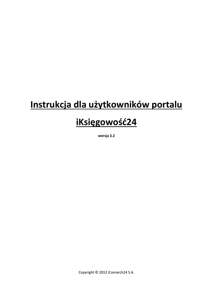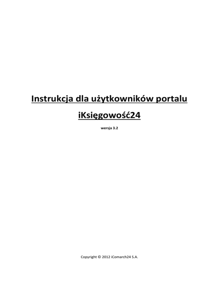 Instrukcja dla użytkowników portalu iKsięgowość24 wersja 3.2 Copyright © 2012 iComarch24 S.A. Spis treści 1. Obszar walidowany dla członków Społeczności Biur Rachunkowych ............................................. 3 1.1. 2. Logowanie ............................................................................................................................... 3 Wyszukiwarka .................................................................................................................................. 4 2.1. Ogólna wyszukiwarka – Znajdź Swojego Księgowego ............................................................. 4 2.2. Wyszukiwanie zaawansowane ................................................................................................ 4 3. Pozycjonowanie ............................................................................................................................... 6 4. Wizytówka ....................................................................................................................................... 7 5. 6. 4.1. Dane kontaktowe .................................................................................................................... 7 4.2. Panel Biura Rachunkowego – Ustawienia Konta ..................................................................... 8 4.3. Oddziały i zasięg prowadzonej działalności ........................................................................... 10 4.4. Panel Biura Rachunkowego – Kompetencje.......................................................................... 11 4.5. Oceny i komentarze Klientów ............................................................................................... 11 Zapytania ofertowe i wiadomości ................................................................................................. 12 5.1. Powiadomienie o ofercie ....................................................................................................... 12 5.2. Panel Biura Rachunkowego – Wiadomości ........................................................................... 12 5.3. Status zapytania ofertowego................................................................................................. 12 5.4. Status wiadomości................................................................................................................. 13 Internetowa Wymiana Dokumentów (IWD) ................................................................................. 14 6.1. Marketing .............................................................................................................................. 14 7. Cennik usługi ................................................................................................................................. 15 8. Panel Biura Rachunkowego – Do Pobrania ................................................................................... 15 9. Kontakt .......................................................................................................................................... 15 2 iComarch24 SA 1. Obszar walidowany Rachunkowych dla członków Społeczności Biur Portal iKsięgowość24 zawiera elementy przeznaczone dla potencjalnych Klientów Biur Rachunkowych oraz elementy dedykowane dla członków Społeczności Biur Rachunkowych. Obszar przeznaczony dla Biur Rachunkowych jest dostępny po zalogowaniu. 1.1. Logowanie Logowanie do serwisu jest dostępne na stronie głównej www.iKsiegowosc24.pl. Jako dane należy wprowadzić: Adres e-mail: indywidualny adres e-mail do konta Comarch Cloud; Hasło: hasło użytkownika do konta Comarch Cloud. Jeśli użytkownik nie posiada jeszcze konta Comarch Cloud lub nie skonfigurował swojego konta Comarch Cloud z usługą iKsięgowość24, należy skorzystać z rejestracji i połączyć adres e-mail z kontem Comarch Cloud z usługą iKsięgowość24. Uwaga! Jeśli użytkownik posiada już konto iKsięgowość24 i dokonuje jego spięcia z kontem Comarch Cloud, niezależnie od wybranego pakietu, konfigurowanie konta nie wpłynie na dotychczasowe parametry usługi. Dowiedz się więcej o pierwszym logowaniu » 3 iComarch24 SA 2. Wyszukiwarka W portalu wyszukiwarka Biur Rachunkowych jest dostępna w dwóch wersjach. 2.1. Ogólna wyszukiwarka – Znajdź Swojego Księgowego Wyszukiwarka dostępna pod interaktywną mapą Polski dostępną na stronie głównej portalu i na bocznym pasku menu na pozostałych stronach. Prezentowane są na niej wszystkie Biura zarejestrowane w Społeczności Biur Rachunkowych. Z listy Klient może wysłać uproszczoną wiadomość do wybranych Biur. 2.2. Wyszukiwanie zaawansowane Rozwijając opcję wyszukiwanie ‘zaawansowane’ można wyszukać podmiot stosując różne kryteria. 4 iComarch24 SA 5 iComarch24 SA 3. Pozycjonowanie Wyszukiwarka wyświetla listę Biur rachunkowych zarejestrowanych w Społeczności na podstawie ilości przyznanych punktów w ramach 8 kryteriów. Punkty są sumowane i na ich podstawie ustalana jest kolejność na liście. W przypadku uzyskania takiej samej liczby punktów podmioty są dodatkowo sortowane alfabetycznie.W Panelu Biura Rachunkowego w menu Pozycjonowanie można sprawdzić aktualną punktację dla zalogowanego Biura. Zakres punktacji przestawia tabela poniżej: Kryterium Obliczanie Punkty AKTYWNOŚĆ BIURA Przejmowanie oferty od Klient pozyskany 6 potencjalnych Klientów: Odpowiedź wysłana 3 0 Status zapytania Brak ofertowego Mnożone przez ilość Status wiadomości otrzymanych ofert i wiadomości Liczba zarejestrowanych Klient 4 Klientów Biura w ramach Comarch ERP Optima Internetowej Wymiany Dokumentów (IWD) Mnożone przez ilość Klientów POSIADANE OPROGRAMOWANIE COMARCH Licencje Comarch ERP Optima: Suma licencji 10 Księga Podatkowa Księga Handlowa Księga Handlowa Plus Płace i Kadry Płace i Kadry Plus 100 Licencja na Comarch ERP Posiadana licencja 0 Optima Pulpit Menadżera Brak licencji Licencje Comarch 