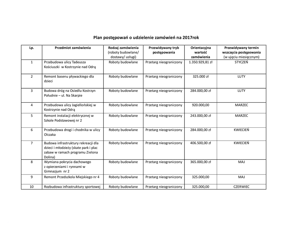 Plan postępowań o udzielenie zamówień na 2017rok Lp. Przedmiot zamówienia Rodzaj zamówienia (roboty budowlane/ dostawy/ usługi) Roboty budowlane Przewidywany tryb postępowania Przetarg nieograniczony Orientacyjna wartość zamówienia 1.350.929,81 zł Przewidywany termin wszczęcia postępowania (w ujęciu miesięcznym) STYCZEŃ 1 Przebudowa ulicy Tadeusza Kościuszki w Kostrzynie nad Odrą 2 Remont basenu pływackiego dla dzieci Roboty budowlane Przetarg nieograniczony 325.000 zł LUTY 3 Budowa dróg na Osiedlu Kostrzyn Południe – ul. Na Skarpie Roboty budowlane Przetarg nieograniczony 284.000,00 zł LUTY 4 Przebudowa ulicy Jagiellońskiej w Kostrzynie nad Odrą Roboty budowlane Przetarg nieograniczony 920.000,00 MARZEC 5 Remont instalacji elektrycznej w Szkole Podstawowej nr 2 Roboty budowlane Przetarg nieograniczony 243.000,00 zł MARZEC 6 Przebudowa drogi i chodnika w ulicy Olczaka Roboty budowlane Przetarg nieograniczony 284.000,00 zł KWIECIEŃ 7 Budowa infrastruktury rekreacji dla dzieci i młodzieży (skate park i plac zabaw w ramach programu Zielona Dolina) Wymiana pokrycia dachowego z opierzeniami i rynnami w Gimnazjum nr 2 Roboty budowlane Przetarg nieograniczony 406.500,00 zł KWIECIEŃ Roboty budowlane Przetarg nieograniczony 365.000,00 zł MAJ 9 Remont Przedszkola Miejskiego nr 4 Roboty budowlane Przetarg nieograniczony 325.000,00 MAJ 10 Rozbudowa infrastruktury sportowej Roboty budowlane Przetarg nieograniczony 325.000,00 CZERWIEC 8 11 obiektów MOSiR w Kostrzynie nad Odrą (budowa szatni i renowacja nawierzchni trawiastej płyty boiska) Budowa kanalizacji na Os. Drzewice Roboty budowlane Przetarg nieograniczony 406.000,00 zł CZERWIEC Roboty budowlane Przetarg nieograniczony 217.391,00 zł CZERWIEC 12 Ratunkowy remont muru oporowego w zespole Bastionu Filip 13 Realizacja usług komunalnych na terenie miasta w związku z organizacją festiwalu „Woodstock” Usługi Przetarg nieograniczony 200.000,00 zł CZERWIEC 14 Odbiór i zagospodarowanie odpadów komunalnych od właścicieli nieruchomości zamieszkałych Usługi Przetarg nieograniczony 3.888.000,00 zł CZERWIEC 15 Kostrzyńskie Centrum Szkolenia Zapaśniczego Roboty budowlane Przetarg nieograniczony 7.073.170,00 zł LIPIEC 16 Termomodernizacja budynków Urzędu Miasta (budynek Urzędu Miasta - Graniczna 2/ budynek Muzeum Twierdzy Graniczna 1) Organizacja i prowadzenie punktu selektywnej zbiórki odpadów komunalnych na terenie miasta Kostrzyn nad Odrą Zimowe utrzymanie dróg na terenie miasta Utrzymanie terenów zieleni miejskiej na obszarze miasta Kostrzyn nad Odrą Termomodernizacja budynku Przedszkola Miejskiego nr 3 1.138.000,00 zł SIERPIEŃ 17 18 19 20 Roboty budowlane Przetarg nieograniczony Usługi Przetarg nieograniczony 916.000.00 zł SIERPIEŃ Usługi Przetarg nieograniczony 1.111.110,00 zł SIERPIEŃ Usługi Przetarg nieograniczony 1.203.703,00 zł WRZESIEŃ Roboty budowlane Przetarg nieograniczony 447.000,00 zł WRZESIEŃ 21 22 23 24 Utrzymanie w czystości ulic na terenie miasta Dostawa energii elektrycznej dla miasta Kostrzyn nad Odrą instytucji kultury i jednostek organizacyjnych miasta Udzielenie kredytu bankowego w wysokości 4.000.000 zł na sfinansowanie planowanego deficytu budżetu Zarządzanie i utrzymanie Cmentarza Komunalnego Usługi Przetarg nieograniczony 740.740,00 zł WRZESIEŃ Dostawy Przetarg nieograniczony 720.000,00 zł WRZESIEŃ Usługi Przetarg nieograniczony 1.060.468 zł WRZESIEŃ Usługi Przetarg nieograniczony 250.000,00 zł PAŻDZIERNIK 25 Dostawa oleju opałowego dla potrzeb Urzędu Miasta Kostrzyn nad Odrą dwie oddzielne kotłownie znajdujące się przy ul. Granicznej Dostawy Przetarg nieograniczony 220.000,00 zł PAŻDZIERNIK 26 Kompleksowe sprzątanie pomieszczeń w budynkach Urzędu Miasta Kostrzyn nad Odrą ul. Graniczna 2, Graniczna 4, Pałac Ślubów Kopernika 1, pomieszczenia SM ul. Kopernika 4a Usługi Przetarg nieograniczony 288.000,00 zł PAŻDZIERNIK Z up. Burmistrza Miasta Kostrzyn nad Odrą Zbigniew Biedulski Z-ca Burmistrza Kostrzyn nad Odrą, dnia 19.01.2017r.