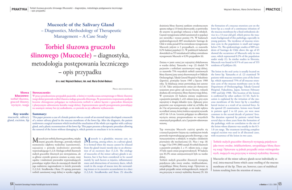 PRAKTYKA Torbiel śluzowa gruczołu ślinowego (Mucocele) – diagnostyka, metodologia postępowania leczniczego – opis przypadku Mucocele of the Salivary Gland – Diagnostics, Methodology of Therapeutic Management – A Case Study Torbiel śluzowa gruczołu ślinowego (Mucocele) – diagnostyka, metodologia postępowania leczniczego – opis przypadku dr n. med. Wojciech Bednarz, lek. med. Maria Orchel-Bednarz Praca recenzowana Słowa kluczowe: torbiel śluzowa, gruczoł ślinowy, wycięcie, warga Streszczenie: W pracy przedstawiono przypadek pacjentki, u której w wyniku urazu zewnętrznego w błonie śluzowej wargi dolnej powstała torbiel śluzowa małego gruczołu ślinowego. Po postawieniu rozpoznania podjęto leczenie chirurgiczne polegające na wyłuszczeniu torbieli w całości łącznie z gruczołem ślinowym i plastycznym odtworzeniu kształtu wargi dolnej. Zaprezentowano sposób postępowania pozwalający na usunięcie zmiany bez jej uszkodzenia, co pozwala na jej całkowite wyłuszczenie. Key words: mucocele, salivary gland, excision, lip Summary: This paper presents a case of a female patient who as a result of an external injury developed a mucocele of a minor salivary gland in the mucous membrane of the lower lip. After the diagnosis, the patient underwent a surgical treatment which involved the enucleation of the whole cyst together with a salivary gland, and a plastic reconstruction of the lower lip. This paper presents a therapeutic procedure allowing the removal of the lesion without damaging it, which permits to enucleate it in its entirety. M ucocele jest torbielą śluzową gruczołową, między innymi gruczołu ślinowego, powstałą wskutek niemożności odpływu wydzieliny (zastoinowość), najczęściej z powodu niedrożności przewodu wyprowadzającego (1,2,3). Etiologia torbieli śluzowych małych gruczołów ślinowych jest niewyjaśniona, ale za główne czynniki sprawcze uważane są urazy, stany zapalne i niedrożność przewodów wyprowadzających powodujące wypływ śluzu do otaczających tkanek lub jego nadmierne nagromadzenie w świetle przewodu (1,2,3,4). Strzałkowska i Kunc (5) opisują powstanie torbieli zastoinowej wargi dolnej w wyniku ciągłego 64 Kwartalnik Stomatologa Praktyka Polish&English Journal for Dentists M ucocele is a glandular, mucous cyst, occurring, among others, in a salivary gland. It is formed when the mucus cannot be released from the gland (stasis) mostly due to an obstruction of an excretory duct (1,2,3). The etiology of mucoceles of the minor salivary glands is unknown, but it has been considered to be caused mainly by such factors as injuries, inflammatory states and obstructions of excretory ducts, which result in the escape of mucus into the surrounding tissues or its excessive accumulation in a duct (1,2,3,4). Strzałkowska and Kunc (5) describe Wojciech Bednarz, Maria Orchel-Bednarz drażnienia błony śluzowej zamkiem ortodontycznym aparatu stałego u 13-letniej dziewczynki, co potwierdza tło urazowe tej patologii zwłaszcza u ludzi młodych. Częstość występowania torbieli zastoinowych w populacji jest niewielka i wynosi poniżej 1%. W badaniach epidemiologicznych 889 mieszkańców Santiago de Chile w wieku ponad 65 lat stwierdzono występowanie Mucocele jedynie w 2 przypadkach, co stanowiło 0,2% badanej populacji (1). W podobnych badaniach słoweńskich na 555 mieszkańcach Lublany stwierdzono występowanie Mucocele w 0,9% przypadków (6). Zmiana w jamie ustnej jest najczęściej zlokalizowana w wardze dolnej. Yamasoba i wsp. (2) zbadali 70 pacjentów z torbielami zastoinowymi wargi dolnej, co stanowiło 75% wszystkich torbieli zastoinowych błony śluzowej jamy ustnej obserwowanych w Oddziale Otolaryngologii, Takeda General Hospital w Fukushimie (Japonia), pomiędzy lutym 1985 a lipcem 1988 roku. Tę lokalizację zmian potwierdzają inni autorzy (3,7,8). Takie umiejscowienie zmian jest tłumaczone urażaniem przez górny ząb sieczny boczny, wskutek działania siły zewnętrznej, błony śluzowej wargi dolnej. W cytowanym (2) badaniu zmiany znajdowano u pacjentów pomiędzy 2. a 63. rokiem życia, przy czym najczęściej w drugiej dekadzie życia. Zgłaszany przez pacjentów czas występowania wahał się od kilku dni do 3 lat od powstania patologii, co nie miało wpływu na wielkość zmiany, której średnica najczęściej wynosiła od 0,5 do 1,0 cm. Leczenie polegające na całkowitym wycięciu zmiany przeprowadzono we wszystkich omawianych przypadkach, zaś u 2 pacjentów odnotowano wznowę. Typ retencyjny Mucocele częściej spotyka się u starszych pacjentów i kojarzy się z zamknięciem światła przewodu wyprowadzającego gruczołu ślinowego, a typ wynaczynieniowy u młodych, w związku z działaniem przeważnie siły mechanicznej (3). Nico i wsp. (8) w ciągu 15 lat (1991-2006) usunęli 36 torbieli śluzowych u pacjentów pomiędzy 2. a 15. rokiem życia, z czego 35 było typem zmian pozaprzewodowych. W badaniu tym 83,3% zmian umiejscowionych było na wardze dolnej. Torbiele małych gruczołów ślinowych występują pojedynczo jako twory owalne, śródśluzówkowe, uwypuklające błonę śluzową wargi. Opisywane są jednak przypadki zmian wieloogniskowych, mających swą przyczynę w retencji wydzieliny śluzowej (9). Ich PRACTICE the formation of a mucous retention cyst on the lower lip as a result of a continuous irritation of the mucous membrane by a fixed orthodontic device in a 13-year-old girl, which proves the traumatic background of this pathology, especially in young patients. The incidence of mucous retention cysts in the population is small and ranges below 1%. The epidemiologic studies of 889 residents of Santiago de Chile above the age of 65 showed the occurrence of Mucocele only in two cases, which represented 0.2% of the population under study (1). In similar studies in Slovenia, Mucocele was found in 0.9 % of cases out of 555 residents of Ljubljana (6). The lesion in the oral 