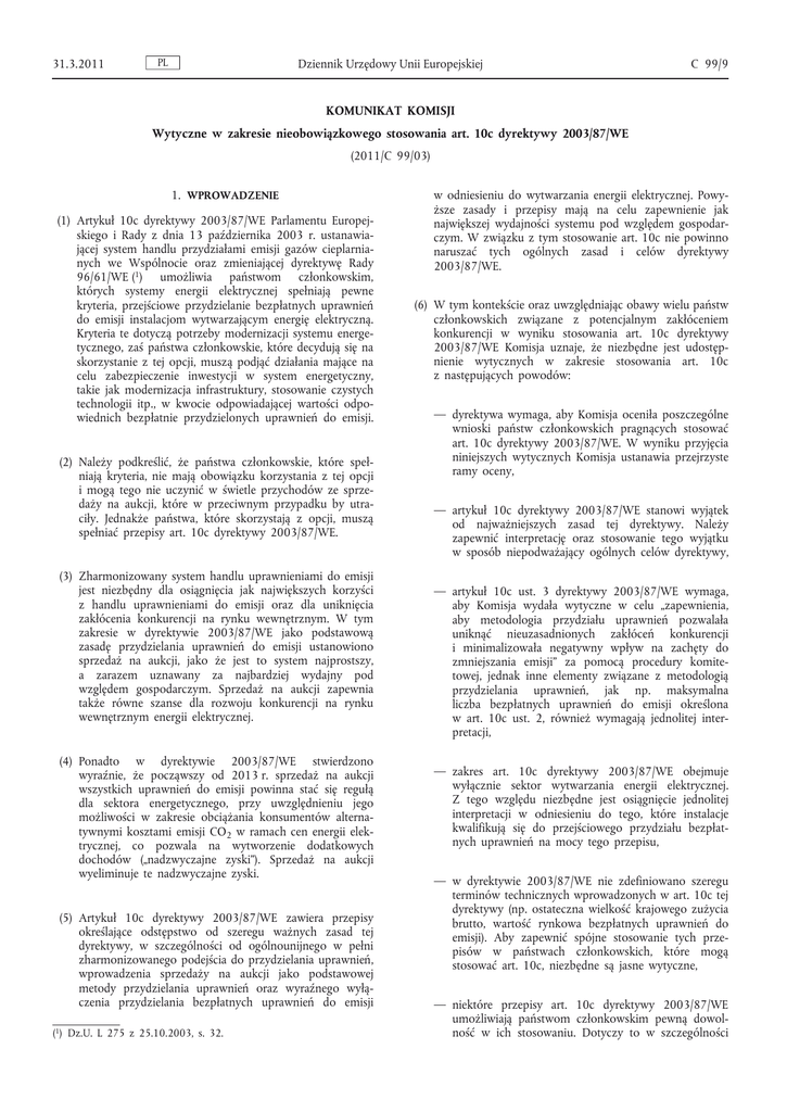(1) Artykuł 10c dyrektywy 2003/87/WE Parlamentu Europej