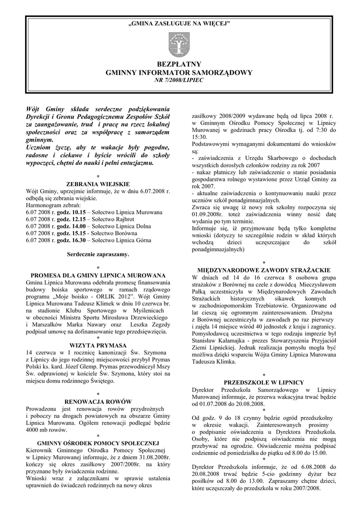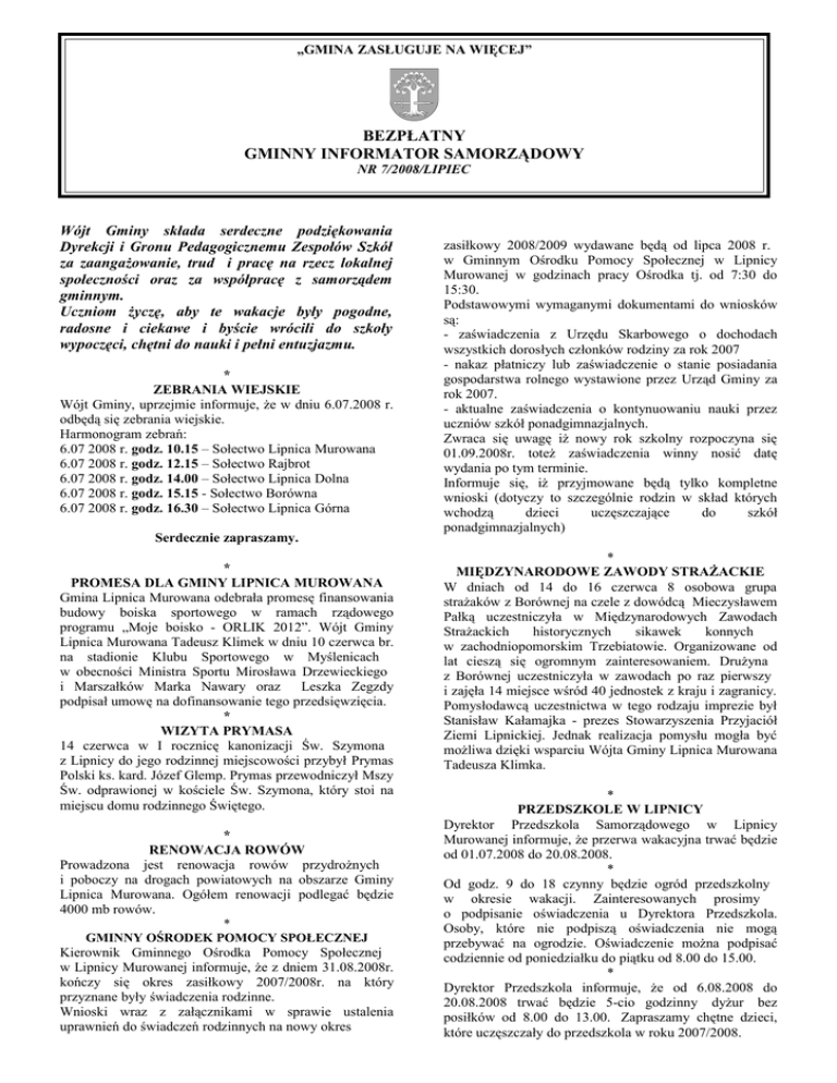 „GMINA ZASŁUGUJE NA WIĘCEJ” BEZPŁATNY GMINNY INFORMATOR SAMORZĄDOWY NR 7/2008/LIPIEC Wójt Gminy składa serdeczne podziękowania Dyrekcji i Gronu Pedagogicznemu Zespołów Szkół za zaangażowanie, trud i pracę na rzecz lokalnej społeczności oraz za współpracę z samorządem gminnym. Uczniom życzę, aby te wakacje były pogodne, radosne i ciekawe i byście wrócili do szkoły wypoczęci, chętni do nauki i pełni entuzjazmu. * ZEBRANIA WIEJSKIE Wójt Gminy, uprzejmie informuje, że w dniu 6.07.2008 r. odbędą się zebrania wiejskie. Harmonogram zebrań: 6.07 2008 r. godz. 10.15 – Sołectwo Lipnica Murowana 6.07 2008 r. godz. 12.15 – Sołectwo Rajbrot 6.07 2008 r. godz. 14.00 – Sołectwo Lipnica Dolna 6.07 2008 r. godz. 15.15 - Sołectwo Borówna 6.07 2008 r. godz. 16.30 – Sołectwo Lipnica Górna Serdecznie zapraszamy. * PROMESA DLA GMINY LIPNICA MUROWANA Gmina Lipnica Murowana odebrała promesę finansowania budowy boiska sportowego w ramach rządowego programu „Moje boisko - ORLIK 2012”. Wójt Gminy Lipnica Murowana Tadeusz Klimek w dniu 10 czerwca br. na stadionie Klubu Sportowego w Myślenicach w obecności Ministra Sportu Mirosława Drzewieckiego i Marszałków Marka Nawary oraz Leszka Zegzdy podpisał umowę na dofinansowanie tego przedsięwzięcia. * WIZYTA PRYMASA 14 czerwca w I rocznicę kanonizacji Św. Szymona z Lipnicy do jego rodzinnej miejscowości przybył Prymas Polski ks. kard. Józef Glemp. Prymas przewodniczył Mszy Św. odprawionej w kościele Św. Szymona, który stoi na miejscu domu rodzinnego Świętego. * RENOWACJA ROWÓW Prowadzona jest renowacja rowów przydrożnych i poboczy na drogach powiatowych na obszarze Gminy Lipnica Murowana. Ogółem renowacji podlegać będzie 4000 mb rowów. * GMINNY OŚRODEK POMOCY SPOŁECZNEJ Kierownik Gminnego Ośrodka Pomocy Społecznej w Lipnicy Murowanej informuje, że z dniem 31.08.2008r. kończy się okres zasiłkowy 2007/2008r. na który przyznane były świadczenia rodzinne. Wnioski wraz z załącznikami w sprawie ustalenia uprawnień do świadczeń rodzinnych na nowy okres zasiłkowy 2008/2009 wydawane będą od lipca 2008 r. w Gminnym Ośrodku Pomocy Społecznej w Lipnicy Murowanej w godzinach pracy Ośrodka tj. od 7:30 do 15:30. Podstawowymi wymaganymi dokumentami do wniosków są: - zaświadczenia z Urzędu Skarbowego o dochodach wszystkich dorosłych członków rodziny za rok 2007 - nakaz płatniczy lub zaświadczenie o stanie posiadania gospodarstwa rolnego wystawione przez Urząd Gminy za rok 2007. - aktualne zaświadczenia o kontynuowaniu nauki przez uczniów szkół ponadgimnazjalnych. Zwraca się uwagę iż nowy rok szkolny rozpoczyna się 01.09.2008r. toteż zaświadczenia winny nosić datę wydania po tym terminie. Informuje się, iż przyjmowane będą tylko kompletne wnioski (dotyczy to szczególnie rodzin w skład których wchodzą dzieci uczęszczające do szkół ponadgimnazjalnych) * MIĘDZYNARODOWE ZAWODY STRAŻACKIE W dniach od 14 do 16 czerwca 8 osobowa grupa strażaków z Borównej na czele z dowódcą Mieczysławem Pałką uczestniczyła w Międzynarodowych Zawodach Strażackich historycznych sikawek konnych w zachodniopomorskim Trzebiatowie. Organizowane od lat cieszą się ogromnym zainteresowaniem. Drużyna z Borównej uczestniczyła w zawodach po raz pierwszy i zajęła 14 miejsce wśród 40 jednostek z kraju i zagranicy. Pomysłodawcą uczestnictwa w tego rodzaju imprezie był Stanisław Kałamajka - prezes Stowarzyszenia Przyjaciół Ziemi Lipnickiej. Jednak realizacja pomysłu mogła być możliwa dzięki wsparciu Wójta Gminy Lipnica Murowana Tadeusza Klimka. * PRZEDSZKOLE W LIPNICY Dyrektor Przedszkola Samorządowego w Lipnicy Murowanej informuje, że przerwa wakacyjna trwać będzie od 01.07.2008 do 20.08.2008. * Od godz. 9 do 18 czynny będzie ogród przedszkolny w okresie wakacji. Zainteresowanych prosimy o podpisanie oświadczenia u Dyrektora Przedszkola. Osoby, które nie podpiszą oświadczenia nie mogą przebywać na ogrodzie. Oświadczenie można podpisać codziennie od poniedziałku do piątku od 8.00 do 15.00. * Dyrektor Przedszkola informuje, że od 6.08.2008 do 20.08.2008 trwać będzie 5-cio godzinny dyżur bez posiłków od 8.00 do 13.00. Zapraszamy chętne dzieci, które uczęszczały do przedszkola w roku 2007/2008. PRZEDSZKOLE W RAJBROCIE Dyrektor Przedszkola Samorządowego w Rajbrocie informuje, że przerwa wakacyjna będzie trwać od 1 lipca 2008 do 20 sierpnia 2008 r. * W związku z planowanym remontem dachu na budynku przedszkola prosimy o nie korzystanie z terenu ogrodu przedszkolnego * ZESPÓŁ SZKÓŁ W LIPNICY Dyrekcja, Grono Pedagogiczne i uczniowie Zespołu Szkół w Lipnicy Murowanej serdecznie dziękują wszystkim osobom, które w roku szkolnym 2007/2008 współpracowały ze szkołą, wspierały nasze działania i ofiarowali nam swoją pomoc. * ZESPÓŁ SZKÓŁ W RAJBROCIE Zakończył się rok szkolny 2007/2008. Wszystkim tym, dzięki którym rok ten przeszedł do historii jako bardzo pracowity i owocny serdecznie dziękujemy. Nauczycielom za trud włożony w wychowanie młodego pokolenia, pracownikom za sprawne funkcjonowanie placówki, uczniom za rzetelną naukę, rodzicom za zaangażowanie się w pracę na rzecz szkoły. Dziękujemy władzom gminnym za owocną i rzetelną współpracę, władzom oświatowym za cenne wskazówki i miłą atmosferę, Poradni Psychologiczno – Pedagogicznej i Posterunkowi Policji w Nowym Wiśniczu za pomoc w rozwiązywaniu problemów wychowawczych. * W pierwszej połowie lipca w budynku domu parafialnego odbędzie się kiermasz podręczników szkolnych. * W okresie wakacji zajęcia na sali gimnastycznej w Zespole Szkół w Rajbrocie nie odbędą się z powodu remontów prowadzonych w budynku szkoły. * GMINNY DOM KULTURY 5 lipca oraz 26 lipca w ramach cyklu wakacyjnych imprez kulturalno - rozrywkowych, organizowanych dla mieszkańców gminy, na stadionie LKS „Macierz” odbędzie się festyn z muzyką