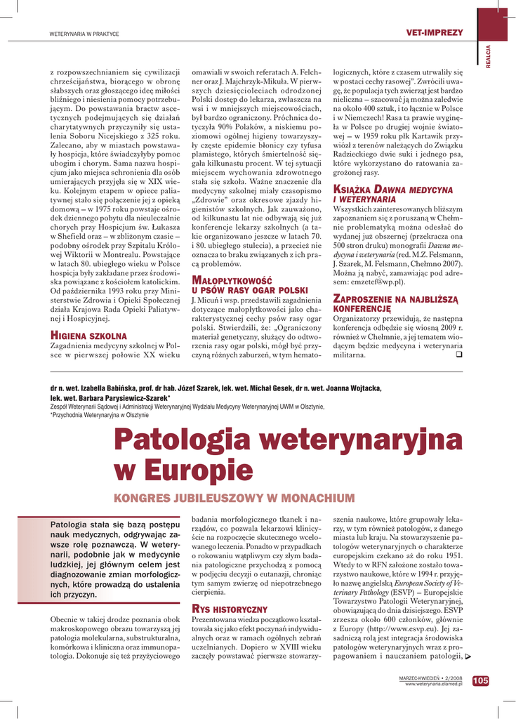 VET-IMPREZY REALCJA WETERYNARIA W PRAKTYCE z rozpowszechnianiem się cywilizacji chrześcijaństwa, biorącego w obronę słabszych oraz głoszącego ideę miłości bliźniego i niesienia pomocy potrzebującym. Do powstawania bractw ascetycznych podejmujących się działań charytatywnych przyczyniły się ustalenia Soboru Nicejskiego z 325 roku. Zalecano, aby w miastach powstawały hospicja, które świadczyłyby pomoc ubogim i chorym. Sama nazwa hospicjum jako miejsca schronienia dla osób umierających przyjęła się w XIX wieku. Kolejnym etapem w opiece paliatywnej stało się połączenie jej z opieką domową – w 1975 roku powstaje ośrodek dziennego pobytu dla nieuleczalnie chorych przy Hospicjum św. Łukasza w Shefield oraz – w zbliżonym czasie – podobny ośrodek przy Szpitalu Królowej Wiktorii w Montrealu. Powstające w latach 80. ubiegłego wieku w Polsce hospicja były zakładane przez środowiska powiązane z kościołem katolickim. Od października 1993 roku przy Ministerstwie Zdrowia i Opieki Społecznej działa Krajowa Rada Opieki Paliatywnej i Hospicyjnej. HIGIENA SZKOLNA Zagadnienia medycyny szkolnej w Polsce w pierwszej połowie XX wieku omawiali w swoich referatach A. Felchner oraz J. Majchrzyk-Mikuła. W pierwszych dziesięcioleciach odrodzonej Polski dostęp do lekarza, zwłaszcza na wsi i w mniejszych miejscowościach, był bardzo ograniczony. Próchnica dotyczyła 90% Polaków, a niskiemu poziomowi ogólnej higieny towarzyszyły częste epidemie błonicy czy tyfusa plamistego, których śmiertelność sięgała kilkunastu procent. W tej sytuacji miejscem wychowania zdrowotnego stała się szkoła. Ważne znaczenie dla medycyny szkolnej miały czasopismo „Zdrowie” oraz okresowe zjazdy higienistów szkolnych. Jak zauważono, od kilkunastu lat nie odbywają się już konferencje lekarzy szkolnych (a takie organizowano jeszcze w latach 70. i 80. ubiegłego stulecia), a przecież nie oznacza to braku związanych z ich pracą problemów. MAŁOPŁYTKOWOŚĆ U PSÓW RASY OGAR POLSKI J. Micuń i wsp. przedstawili zagadnienia dotyczące małopłytkowości jako charakterystycznej cechy psów rasy ogar polski. Stwierdzili, że: „Ograniczony materiał genetyczny, służący do odtworzenia rasy ogar polski, mógł być przyczyną różnych zaburzeń, w tym hemato- logicznych, które z czasem utrwaliły się w postaci cechy rasowej”. Zwrócili uwagę, że populacja tych zwierząt jest bardzo nieliczna – szacować ją można zaledwie na około 400 sztuk, i to łącznie w Polsce i w Niemczech! Rasa ta prawie wyginęła w Polsce po drugiej wojnie światowej – w 1959 roku płk Kartawik przywiózł z terenów należących do Związku Radzieckiego dwie suki i jednego psa, które wykorzystano do ratowania zagrożonej rasy. KSIĄŻKA DAWNA MEDYCYNA I WETERYNARIA Wszystkich zainteresowanych bliższym zapoznaniem się z poruszaną w Chełmnie problematyką można odesłać do wydanej już obszernej (przekracza ona 500 stron druku) monografii Dawna medycyna i weterynaria (red. M.Z. Felsmann, J. Szarek, M. Felsmann, Chełmno 2007). Można ją nabyć, zamawiając pod adresem: [email protected]). ZAPROSZENIE NA NAJBLIŻSZĄ KONFERENCJĘ Organizatorzy przewidują, że następna konferencja odbędzie się wiosną 2009 r. również w Chełmnie, a jej tematem wiodącym będzie medycyna i weterynaria militarna. dr n. wet. Izabella Babińska, prof. dr hab. Józef Szarek, lek. wet. Michał Gesek, dr n. wet. Joanna Wojtacka, lek. wet. Barbara Parysiewicz-Szarek* Zespół Weterynarii Sądowej i Administracji Weterynaryjnej Wydziału Medycyny Weterynaryjnej UWM w Olsztynie, *Przychodnia Weterynaryjna w Olsztynie Patologia weterynaryjna w Europie KONGRES JUBILEUSZOWY W MONACHIUM Patologia stała się bazą postępu nauk medycznych, odgrywając zawsze rolę poznawczą. W weterynarii, podobnie jak w medycynie ludzkiej, jej głównym celem jest diagnozowanie zmian morfologicznych, które prowadzą do ustalenia ich przyczyn. badania morfologicznego tkanek i narządów, co pozwala lekarzowi klinicyście na rozpoczęcie skutecznego wcelowanego leczenia. Ponadto w przypadkach o rokowaniu wątpliwym czy złym badania patologiczne przychodzą z pomocą w podjęciu decyzji o eutanazji, chroniąc tym samym zwierzę od niepotrzebnego cierpienia. RYS HISTORYCZNY Obecnie w takiej drodze poznania obok makroskopowego obrazu towarzyszą jej patologia molekularna, substrukturalna, komórkowa i kliniczna oraz immunopatologia. Dokonuje się też przyżyciowego Prezentowana wiedza początkowo kształtowała się jako efekt poczynań indywidualnych oraz w ramach ogólnych zebrań uczelnianych. Dopiero w XVIII wieku zaczęły powstawać pierwsze stowarzy- szenia naukowe, które grupowały lekarzy, w tym również patologów, z danego miasta lub kraju. Na stowarzyszenie patologów weterynaryjnych o charakterze europejskim czekano aż do roku 1951. Wtedy to w RFN założone zostało towarzystwo naukowe, które w 1994 r. przyjęło nazwę angielską European Society of Veterinary Pathology (ESVP) – Europejskie Towarzystwo Patologii Weterynaryjnej, obowiązującą do dnia dzisiejszego. ESVP zrzesza około 600 członków, głównie z Europy (http://www.esvp.eu). Jej zasadniczą rolą jest integracja środowiska patologów weterynaryjnych wraz z propagowaniem i nauczaniem patologii, MARZEC-KWIECIEŃ • 2/2008 www.weterynaria.elamed.pl 105 VET-IMPREZY a narzędziami służącymi do tego są m.in. doroczne kongresy. W ramach realizacji wymienionych celów odbył się w dniach od 29 sierpnia do 1 września 2007 r. już 25. jubileuszowy Kongres ESVP. Spotkanie miało miejsce w Monachium, na terenie Uniwersytetu Ludwig-Maximilians. Przewodniczącym Komitetu Organizacyjnego był prof. Walter Hermanns, kierownik Katedry Anatomii Patologicznej Wydziału Medycyny Weterynaryjnej Uniwersytetu w Monachium. W skład komitetu Naukowego wchodzili: Anja Kipar (Liverpool), Lluis Luján (Zaragoza), Brian Sheahan (Dublin), F