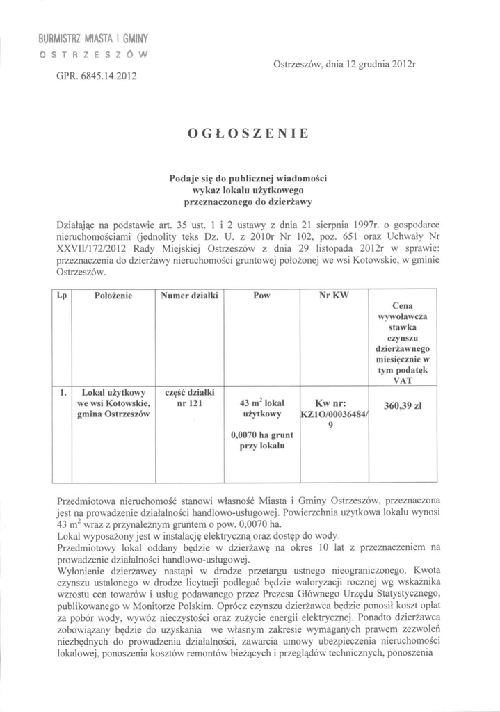Ostrzesz6w, dnia l2 grudnia 2012r