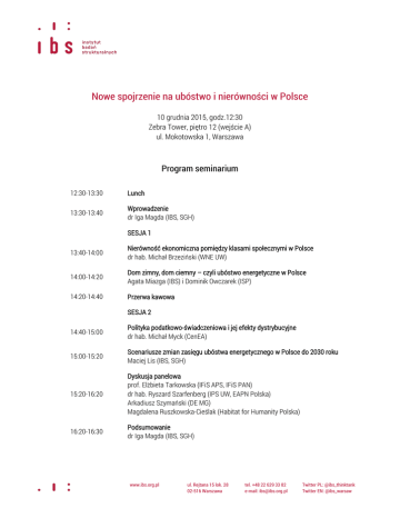 1 Nowe spojrzenie na ubóstwo i nierówności w Polsce 10 grudnia 2015, godz.12:30 Zebra Tower, piętro 12 (wejście A) ul. Mokotowska 1, Warszawa Program seminarium 12:30-13:30 Lunch 13:30-13:40 Wprowadzenie dr Iga Magda (IBS, SGH) SESJA 1 13:40-14:00 Nierówność ekonomiczna pomiędzy klasami społecznymi w Polsce dr hab. Michał Brzeziński (WNE UW) 14:00-14:20 Dom zimny, dom ciemny – czyli ubóstwo energetyczne w Polsce Agata Miazga (IBS) i Dominik Owczarek (ISP) 14:20-14:40 Przerwa kawowa SESJA 2 14:40-15:00 Polityka podatkowo-świadczeniowa i jej efekty dystrybucyjne dr hab. Michał Myck (CenEA) 15:00-15:20 Scenariusze zmian zasięgu ubóstwa energetycznego w Polsce do 2030 roku Maciej Lis (IBS, SGH) 15:20-16:20 Dyskusja panelowa prof. Elżbieta Tarkowska (IFiS APS, IFiS PAN) dr hab. Ryszard Szarfenberg (IPS UW, EAPN Polska) Arkadiusz Szymański (DE MG) Magdalena Ruszkowska-Cieślak (Habitat for Humanity Polska) 16:20-16:30 Podsumowanie dr Iga Magda (IBS, SGH) www.ibs.org.pl ul. Rejtana 15 lok. 28 02-516 Warszawa tel. +48 22 629 33 82 e-mail: [email protected] Twitter PL: @ibs_thinktank Twitter EN: @ibs_warsaw