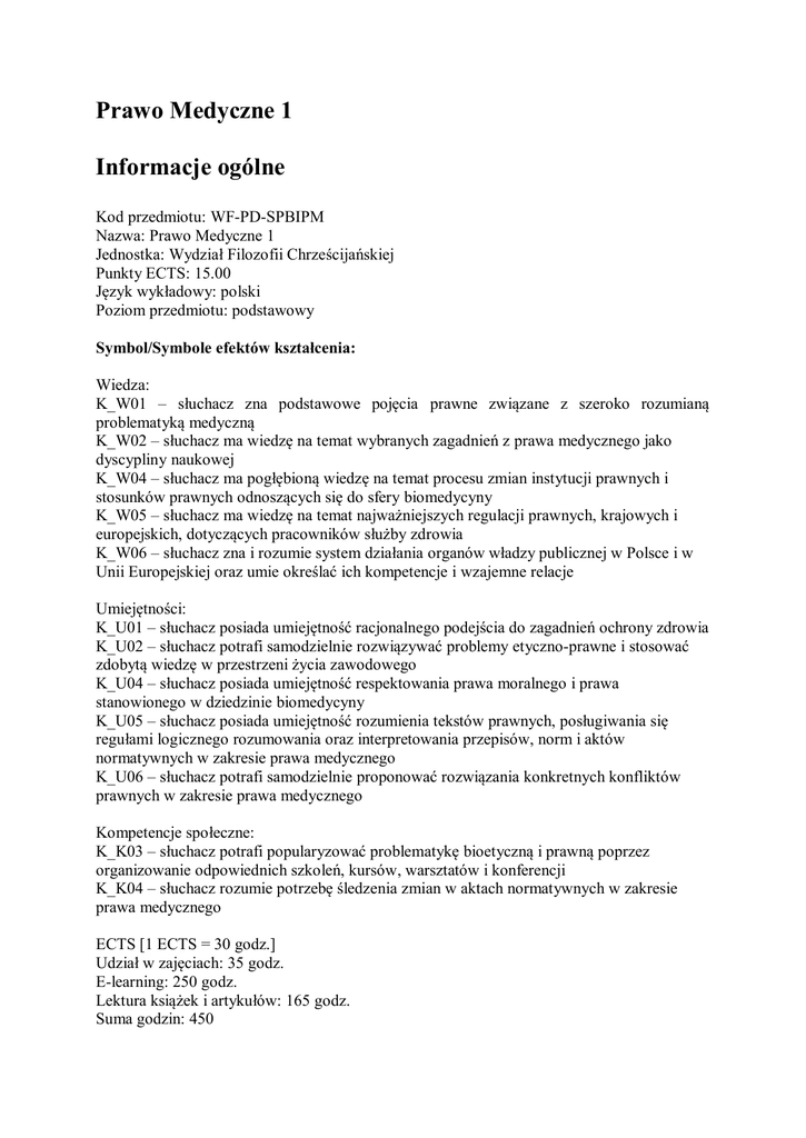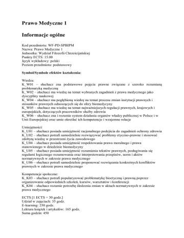 Prawo Medyczne 1 Informacje ogólne Kod przedmiotu: WF-PD-SPBIPM Nazwa: Prawo Medyczne 1 Jednostka: Wydział Filozofii Chrześcijańskiej Punkty ECTS: 15.00 Język wykładowy: polski Poziom przedmiotu: podstawowy Symbol/Symbole efektów kształcenia: Wiedza: K_W01 – słuchacz zna podstawowe pojęcia prawne związane z szeroko rozumianą problematyką medyczną K_W02 – słuchacz ma wiedzę na temat wybranych zagadnień z prawa medycznego jako dyscypliny naukowej K_W04 – słuchacz ma pogłębioną wiedzę na temat procesu zmian instytucji prawnych i stosunków prawnych odnoszących się do sfery biomedycyny K_W05 – słuchacz ma wiedzę na temat najważniejszych regulacji prawnych, krajowych i europejskich, dotyczących pracowników służby zdrowia K_W06 – słuchacz zna i rozumie system działania organów władzy publicznej w Polsce i w Unii Europejskiej oraz umie określać ich kompetencje i wzajemne relacje Umiejętności: K_U01 – słuchacz posiada umiejętność racjonalnego podejścia do zagadnień ochrony zdrowia K_U02 – słuchacz potrafi samodzielnie rozwiązywać problemy etyczno-prawne i stosować zdobytą wiedzę w przestrzeni życia zawodowego K_U04 – słuchacz posiada umiejętność respektowania prawa moralnego i prawa stanowionego w dziedzinie biomedycyny K_U05 – słuchacz posiada umiejętność rozumienia tekstów prawnych, posługiwania się regułami logicznego rozumowania oraz interpretowania przepisów, norm i aktów normatywnych w zakresie prawa medycznego K_U06 – słuchacz potrafi samodzielnie proponować rozwiązania konkretnych konfliktów prawnych w zakresie prawa medycznego Kompetencje społeczne: K_K03 – słuchacz potrafi popularyzować problematykę bioetyczną i prawną poprzez organizowanie odpowiednich szkoleń, kursów, warsztatów i konferencji K_K04 – słuchacz rozumie potrzebę śledzenia zmian w aktach normatywnych w zakresie prawa medycznego ECTS [1 ECTS = 30 godz.] Udział w zajęciach: 35 godz. E-learning: 250 godz. Lektura książek i artykułów: 165 godz. Suma godzin: 450 2 Liczba ECTS: 15 Informacje o zajęciach w cyklu Semestr zimowy 2016/17 Rok / Semestr / Trymestr studiów: 2016-10-01 - 2017-01-30 Metody nauczania: Wykład – 35 godzin Koordynatorzy: Andrzej Kobyliński Prowadzący grup: Leszek Bosek, Piotr Iwanowski, Urszula Drozdowska, Anna Jacek, Leszek Karski, Błażej Kmieciak, Jacek Potulski, Anna Pszenny Zaliczenie: Egzaminacyjny (na zakończenie semestru letniego) Wymagania wstępne: podstawowa znajomość prawa medycznego Zajęcia: Wykład Informacje wspólne dla wszystkich grup Typ zajęć: wykład Liczba godzin: 35 Literatura: M. Kowalski, B. Kmieciak, Bioetyka. Między prawem a pedagogiką, Kraków 2016. L. Kubicki, Prawo medyczne, Warszawa 2003. M. Nestorowicz, Prawo medyczne, Toruń 2005. M. Safjan (red.), Prawo wobec medycyny i biotechnologii, Warszawa 2011. E. Sarnacka, A. Jacek, Prawo medyczne i orzecznictwo lekarskie, Warszawa 2015. R. Tymiński, Prawo medyczne, Warszawa 2014. J. Zajdel, Kompendium prawa medycznego, Łódź 2008. Kryteria oceniania: Wiedza: – na ocenę 2 (ndst.): słuchacz nie zna podstawowych terminów i pojęć z prawa medycznego – na ocenę 3 (dst.): słuchacz zna podstawową terminologię w zakresie prawa medycznego, ale nie potrafi szczegółowo omówić i rozwinąć poszczególnych zagadnień – na ocenę 4 (db.): słuchacz właściwie rozpoznaje podstawowe zagadnienia prawa medycznego i charakteryzuje je w poprawny sposób – na ocenę 5 (bdb.): słuchacz doskonale orientuje się w problematyce prawa medycznego oraz posługuje się wiedzą zawartą we wskazanym piśmiennictwie Umiejętności: – na ocenę 2 (nast.): słuchacz nie potrafi charakteryzować podstawowych terminów i pojęć z prawa medycznego – na ocenę 3 (dst.): słuchacz umie scharakteryzować podstawowe terminy i pojęcia z prawa medycznego, ale nie potrafi ich odnieść do praktyki życia – na ocenę 4 (db.): słuchacz właściwie analizuje i interpretuje przepisy prawa medycznego – na ocenę 5 (bdb.): słuchacz właściwie analizuje i interpretuje przepisy prawa medycznego oraz potrafi je zastosować w praktyce życia codziennego 3 Kompetencje: Słuchacz zna najważniejsze elementy aktualnego stan prawnego, w Polsce oraz w Unii Europejskiej, w zakresie prawa medycznego. Wykazuje racjonalne podejście w stosunku do informacji dostępnych na ten temat w literaturze naukowej i mass mediach. Potrafi oceniać zjawiska życia medycznego pod kątem obowiązujących przepisów prawnych. Zakres tematów: 1. Źródła prawa medycznego 2. Definicja śmierci człowieka w kontekście transplantacji narządów 3. Etyczno-prawne aspekty pobierania narządów. Bariery rozwoju transplantacji w Polsce 4. Prawa i obowiązki lekarza i pielęgniarki 5. Prawa pacjenta 6. Odpowiedzialność cywilna personelu medycznego 7. Prawna ochrona prawa do życia 8. Badania kliniczne i rozwój kliniczny leków 9. Eksperyment medyczny 10. Ochrona praw pacjenta szpitala psychiatrycznego 11. Dostęp do świadczeń medycznych Informacje o grupach Informacje o grupie 1 Zajęcia: Semestr zimowy 2016/17 Wykład, grupa 1 Koordynator: Andrzej Kobyliński Metody dydaktyczne i weryfikacja efektów kształcenia: Efekty wiedzy: Metoda dydaktyczna – wykład informacyjny, wykład problemowy, prezentacja multimedialna Weryfikacja – egzamin końcowy w postaci testu zaliczeniowego jednokrotnego wyboru Efekty umiejętności: Metoda dydaktyczna – wykład informacyjny, wykład problemowy, prezentacja Weryfikacja – egzamin końcowy w postaci testu zaliczeniowego jednokrotnego wyboru Efekt kompetencji: Metoda dydaktyczna – wykład informacyjny, wykład problemowy, prezentacja Weryfikacja – egzamin końcowy w postaci testu zaliczeniowego jednokrotnego wyboru Opis metod dydaktycznych: Wykład informacyjny – służy przedstawieniu problematyki zajęć i zapoznaniu uczestników z podstawowymi zagadnieniami prawa medycznego 4 Wykład problemowy 