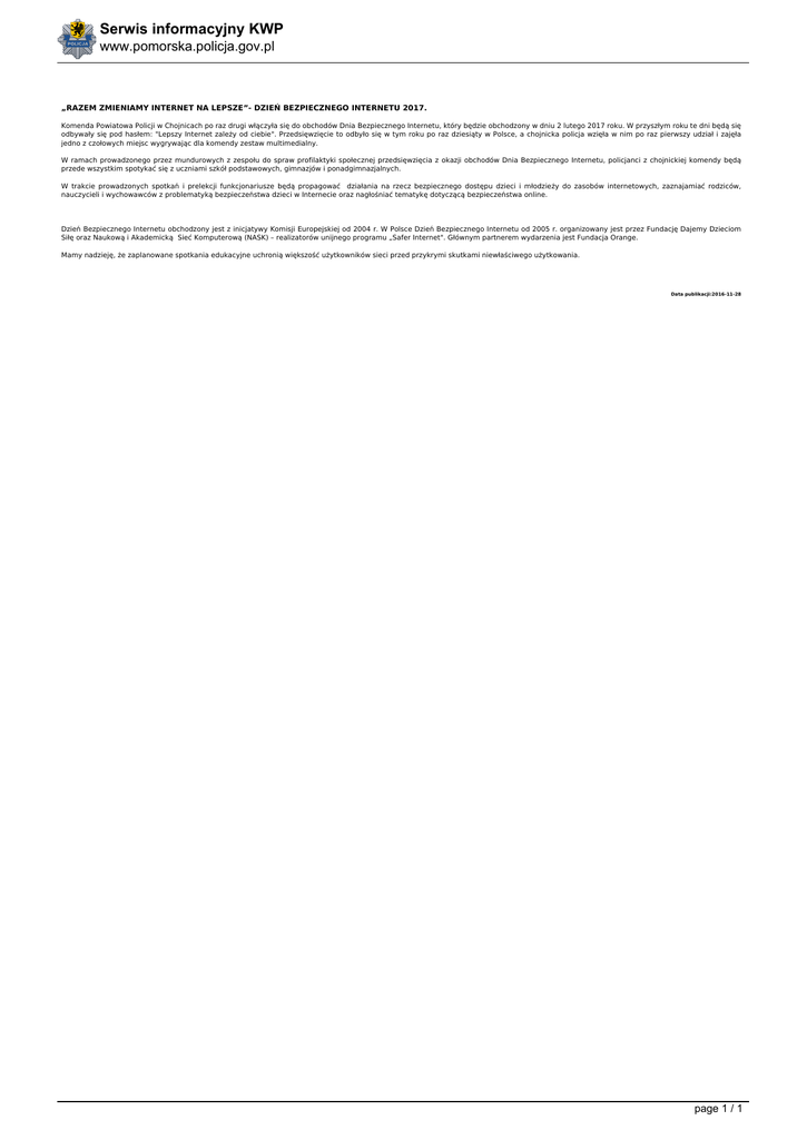 Serwis informacyjny KWP www.pomorska.policja.gov.pl „RAZEM ZMIENIAMY INTERNET NA LEPSZE”- DZIEŃ BEZPIECZNEGO INTERNETU 2017. Komenda Powiatowa Policji w Chojnicach po raz drugi włączyła się do obchodów Dnia Bezpiecznego Internetu, który będzie obchodzony w dniu 2 lutego 2017 roku. W przyszłym roku te dni będą się odbywały się pod hasłem: "Lepszy Internet zależy od ciebie". Przedsięwzięcie to odbyło się w tym roku po raz dziesiąty w Polsce, a chojnicka policja wzięła w nim po raz pierwszy udział i zajęła jedno z czołowych miejsc wygrywając dla komendy zestaw multimedialny. W ramach prowadzonego przez mundurowych z zespołu do spraw profilaktyki społecznej przedsięwzięcia z okazji obchodów Dnia Bezpiecznego Internetu, policjanci z chojnickiej komendy będą przede wszystkim spotykać się z uczniami szkół podstawowych, gimnazjów i ponadgimnazjalnych. W trakcie prowadzonych spotkań i prelekcji funkcjonariusze będą propagować działania na rzecz bezpiecznego dostępu dzieci i młodzieży do zasobów internetowych, zaznajamiać rodziców, nauczycieli i wychowawców z problematyką bezpieczeństwa dzieci w Internecie oraz nagłośniać tematykę dotyczącą bezpieczeństwa online. Dzień Bezpiecznego Internetu obchodzony jest z inicjatywy Komisji Europejskiej od 2004 r. W Polsce Dzień Bezpiecznego Internetu od 2005 r. organizowany jest przez Fundację Dajemy Dzieciom Siłę oraz Naukową i Akademicką Sieć Komputerową (NASK) – realizatorów unijnego programu „Safer Internet". Głównym partnerem wydarzenia jest Fundacja Orange. Mamy nadzieję, że zaplanowane spotkania edukacyjne uchronią większość użytkowników sieci przed przykrymi skutkami niewłaściwego użytkowania. Data publikacji:2016-11-28 page 1 / 1 Powered by TCPDF (www.tcpdf.org)