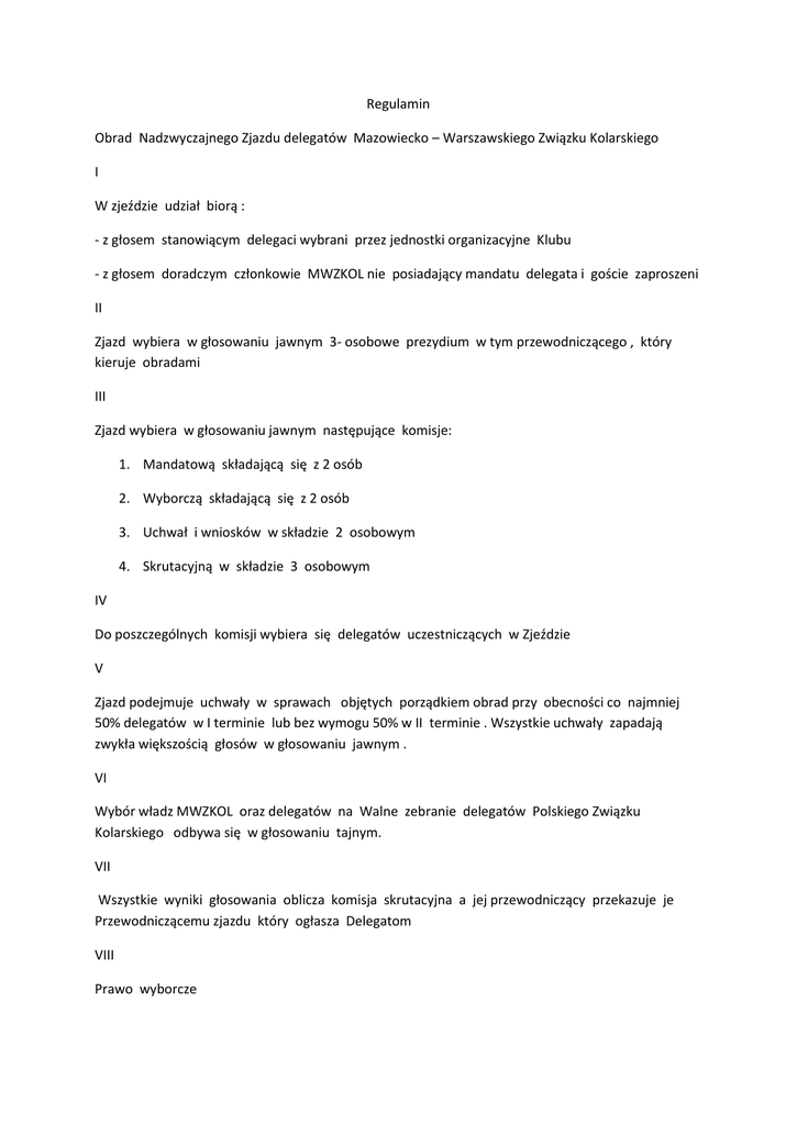 Regulamin Obrad Nadzwyczajnego Zjazdu delegatów Mazowiecko – Warszawskiego Związku Kolarskiego I W zjeździe udział biorą : - z głosem stanowiącym delegaci wybrani przez jednostki organizacyjne Klubu - z głosem doradczym członkowie MWZKOL nie posiadający mandatu delegata i goście zaproszeni II Zjazd wybiera w głosowaniu jawnym 3- osobowe prezydium w tym przewodniczącego , który kieruje obradami III Zjazd wybiera w głosowaniu jawnym następujące komisje: 1. Mandatową składającą się z 2 osób 2. Wyborczą składającą się z 2 osób 3. Uchwał i wniosków w składzie 2 osobowym 4. Skrutacyjną w składzie 3 osobowym IV Do poszczególnych komisji wybiera się delegatów uczestniczących w Zjeździe V Zjazd podejmuje uchwały w sprawach objętych porządkiem obrad przy obecności co najmniej 50% delegatów w I terminie lub bez wymogu 50% w II terminie . Wszystkie uchwały zapadają zwykła większością głosów w głosowaniu jawnym . VI Wybór władz MWZKOL oraz delegatów na Walne zebranie delegatów Polskiego Związku Kolarskiego odbywa się w głosowaniu tajnym. VII Wszystkie wyniki głosowania oblicza komisja skrutacyjna a jej przewodniczący przekazuje je Przewodniczącemu zjazdu który ogłasza Delegatom VIII Prawo wyborcze Czynne prawo wyborcze posiadają delegaci na Zjazd Mazowiecko Warszawskiego Związku Kolarskiego wydelegowani przez Kluby zarejestrowanie w MWZKOL na podstawie pisemnego upoważnienia. Zjazd wybiera : 1 Prezesa Mazowiecko Warszawskiego Związku Kolarskiego 2 Zarząd Mazowiecko Warszawskiego Związku Kolarskiego w ilości 5-8 osób 3. Komisje Rewizyjna Mazowiecko Warszawskiego Związku Kolarskiego w ilości 3 osoby 4. Delegatów na Walne Zgromadzenie Delegatów Polskiego Związku Kolarskiego 6 osób + 2 rezerwowych IX Komisja skrutacyjna przygotowuje listę kandydatów na podstawie zgłoszeń z sali na: Prezesa MWZKOL Członków Zarządu Komisję Rewizyjną Delegatów na Walne Zebranie Delegatów Polskiego Związku Kolarskiego X Prezentacja kandydatów na Prezesa MWZKOL Prezentacja na kandydatów do Zarządu MWZKOL Prezentacja kandydatów do Komisji Rewizyjnej Dyskusja nad programem rozwoju kolarstwa na Mazowszu XI Przewodniczący Zjazdu Delegatów MWZKOL udziel głosu wg. kolejności zgłoszeń , dba o odpowiednią atmosferę obrad i ich sprawny przebieg. Podejmuje decyzje w sprawach porządkowych nie przewidzianych w regulaminie obrad. XII Każdy delegat jest obowiązany do ściśle przestrzegania regulaminu.