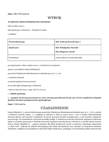 Sygn. akt I ACa 515/14 WYROK W IMIENIU RZECZYPOSPOLITEJ POLSKIEJ Dnia 24 lipca 2014 r. Sąd Apelacyjny w Krakowie – Wydział I Cywilny w składzie: Przewodniczący: SSA Andrzej Struzik (spr.) Sędziowie: SSA Władysław Pawlak SSA Zbigniew Ducki Protokolant: st.sekr.sądowy Urszula Kłosińska po rozpoznaniu w dniu 24 lipca 2014 r. w Krakowie na rozprawie sprawy z powództwa Gminy Miejskiej K. przeciwko Wspólnocie Mieszkaniowej w budynku przy ul. (...) w K. o uchylenie uchwały na skutek apelacji strony pozwanej od wyroku Sądu Okręgowego w Krakowie z dnia 30 stycznia 2014 r. sygn. akt I C 1707/13 1. oddala apelację; 2. zasądza od strony pozwanej na rzecz strony powodowej kwotę 130 zł (sto trzydzieści złotych) tytułem kosztów postępowania apelacyjnego. Sygn. I ACa 515/14 UZASADNIENIE Gmina Miejska K., w pozwie skierowanym przeciwko Wspólnocie Mieszkaniowej budynku przy ul. (...) w K., wniosła o uchylenie uchwały numer (...) podjętej na zebraniu w dniu 14 marca 2014 r. oraz w drodze indywidualnego zbierania głosów, jak również o zasądzenie od strony pozwanej kosztów postępowania, w tym kosztów zastępstwa procesowego. Na uzasadnienie roszczenia powódka podała, iż zaskarżona uchwała zatwierdza regulamin rozliczania opłat za centralne ogrzewanie w budynku pozwanej wspólnoty mieszkaniowej. Uchwała ta w sposób istotny narusza interes Gminy Miejskiej K. – poprzez przyjęcie dla lokali użytkowych stawki za dostawę centralnego ogrzewania „o około 60%” większej od zaliczki obowiązującej dla lokali mieszkalnych oraz wskazuje na bezprawne działania Wspólnoty względem poszczególnych właścicieli lokali użytkowych, polegające na bezzasadnej próbie przerzucenia na nich ciężaru odpowiedzialności za ewentualne zwiększone zużycie mediów. Ponadto, użyte w regulaminie sformułowanie „około 60%” jest nieprecyzyjne i w konsekwencji doprowadzić może do samowolnego, dowolnego określania wysokości zaliczki dla lokali użytkowych. W odpowiedzi na pozew oraz w dalszym piśmie procesowym pozwana wniosła o oddalenie powództwa w całości oraz o zasądzenie od strony powodowej kosztów procesu. W uzasadnieniu wskazała, że podjęta uchwała przewiduje, że wobec braku ciepłomierzy lub innych urządzeń wskaźnikowych w lokalach, zaliczki na opłaty za centralne ogrzewanie ustalane będą z uwzględnieniem powierzchni lokalu na podstawie sporządzonego bilansu ciepła budynku. Strona powodowa również dotychczas wnosiła zaliczki na lokale użytkowe w wyższej kwocie niż zaliczki wnoszone przez właścicieli lokali mieszkalnych. Stawka za centralne ogrzewanie dla właścicieli lokali użytkowych wynosi 5,70 zł, podczas gdy za lokale mieszkalne stawka wynosi 3,54 zł. Opracowany bilans ciepła budynku wskazuje jednoznacznie, że w lokalach użytkowych zlokalizowanych na parterze następuje większe zużycie ciepła, a nadto z uwagi na ich przeznaczenie – usługową działalność gospodarczą – w dużo większym stopniu dochodzi w nich do utraty ciepła. Nie jest również prawdą twierdzenie, że wysokość zaliczek za dostawę ciepła została ukształtowana w sposób dowolny – w treści regulaminu wskazano jakie czynniki będą uwzględniane przy ustalaniu wysokości zaliczki, jako podstawę wskazując bilans ciepła. Strona pozwana wskazała, że nie jest możliwe precyzyjne określenie całkowitych kosztów za dostawę ciepła – jedyną wskazówką dla potrzeb obliczania wysokości zaliczki może być wykaz kosztów ogrzewania za ostatnie 12 miesięcy. Wyrokiem z dnia 30 stycznia 2014 r. Sąd Okręgowy uwzględnił powództwo w całości i zasądzić od pozwanej na rzecz powódki kwotę 380 złotych tytułem zwrotu kosztów procesu. Orzeczenie swoje Sąd Okręgowy oparł na następujących ustaleniach faktycznych: Wspólnota Mieszkaniowa budynku przy ul. (...) w K. składa się z 57 lokali, w tym 44 lokali mieszkalnych stanowiących własność osób fizycznych o łącznej pow. użytkowej 2.277,63 m( 2), co stanowi 77,26% udziału we własności oraz 13 lokali będących własnością Gminy Miejskiej K., w tym 9 lokali mieszkalnych i 4 lokali użytkowych, których łączna powierzchnia użytkowa wynosi 670,75 m( 2), co stanowi 22,74% udziału we własności. W czerwcu 2006 r. na zlecenie pozwanej zostało wykonane opracowanie dotyczące zmniejszenia strat ciepła z tytułu docieplenia budynku. W treści opracowania szczegółowo przedstawiono bilans cieplny dla poszczególnych pomieszczeń oraz wyliczono zapotrzebowanie ciepła dla budynku w rozbiciu na poszczególnych użytkowników. Łączne zapotrzebowanie zostało ustalone na 169.136 watów, w tym dla mieszkań i części wspólnych 104.829 watów. Stosownie do regulaminu rozliczania zaliczek na opłaty za energię cieplną, przyjętego zaskarżoną uchwałą, wysokość miesięcznej zaliczki na opłaty centralnego ogrzewania za 1 m( 2) powierzchni grzewczej lokalu ustalana miała być na podstawie bilansu ciepła sporządzonego dla każdego budynku, kosztów centralnego ogrzewania za ostatnie 12 miesięcy, informacji o przewidywanym wzroście cen wytwarzania i dostawy ciepła przez Miejskie Przedsiębiorstwo (...) S.A. w K., długości sezonu grzewczego oraz rezerwy na wzrost zużycia ciepła ze względu na warunki pogodowe. W punkcie drugim regulaminu ustalono, że zaliczka na opłaty za centralne ogrzewanie dla lokali użytkowych (sklepy, garaże, zakłady usługowe) będzie „o około 60%” większa od zaliczki dla lokali mieszkalnych, co wynika z ich kubatury, ilości przeszkleń, bezpośredniego wyjścia z zewnątrz, częstotliwości otwierania drzwi, wychładzania. Nad uchwałą głosowało 31 właścicieli o łącznym udziale 56,40% - wszyscy głosujący opowiedzieli się za przyjęciem uchwały. Powiadomienie o podjętych przez Wspólnotę Mieszkaniową uchwałach zostało skierowane do strony powodowej w dniu 8 sierpnia 2013 r. W ocenie Sądu Okręgowego powództw