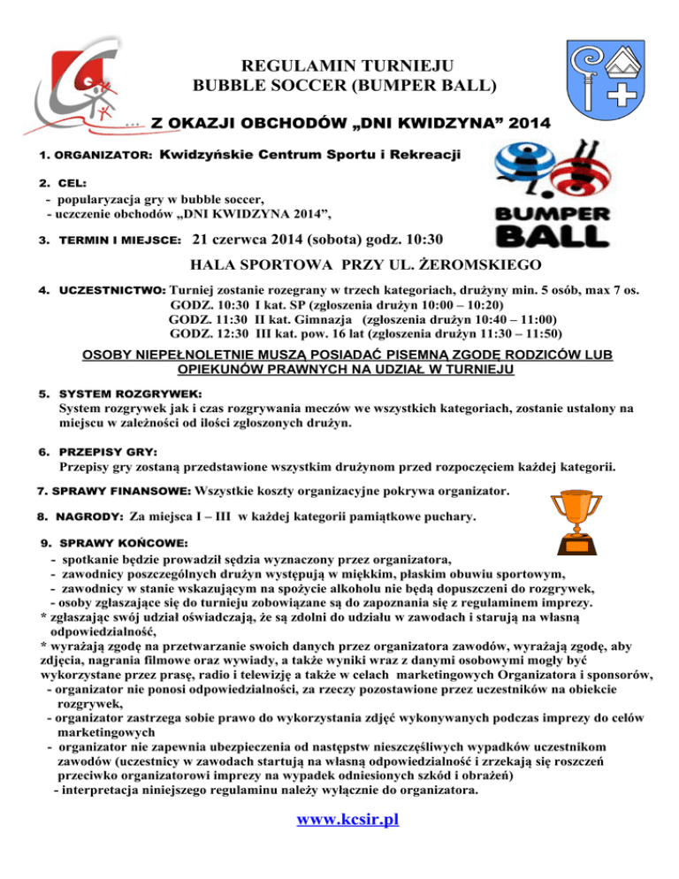 REGULAMIN TURNIEJU BUBBLE SOCCER (BUMPER BALL) Z OKAZJI OBCHODÓW „DNI KWIDZYNA” 2014 1. ORGANIZATOR: Kwidzyńskie Centrum Sportu i Rekreacji 2. CEL: - popularyzacja gry w bubble soccer, - uczczenie obchodów „DNI KWIDZYNA 2014”, 3. TERMIN I MIEJSCE: 21 czerwca 2014 (sobota) godz. 10:30 HALA SPORTOWA PRZY UL. ŻEROMSKIEGO 4. UCZESTNICTWO: Turniej zostanie rozegrany w trzech kategoriach, drużyny min. 5 osób, max 7 os. GODZ. 10:30 I kat. SP (zgłoszenia drużyn 10:00 – 10:20) GODZ. 11:30 II kat. Gimnazja (zgłoszenia drużyn 10:40 – 11:00) GODZ. 12:30 III kat. pow. 16 lat (zgłoszenia drużyn 11:30 – 11:50) OSOBY NIEPEŁNOLETNIE MUSZĄ POSIADAĆ PISEMNĄ ZGODĘ RODZICÓW LUB OPIEKUNÓW PRAWNYCH NA UDZIAŁ W TURNIEJU 5. SYSTEM ROZGRYWEK: System rozgrywek jak i czas rozgrywania meczów we wszystkich kategoriach, zostanie ustalony na miejscu w zależności od ilości zgłoszonych drużyn. 6. PRZEPISY GRY: Przepisy gry zostaną przedstawione wszystkim drużynom przed rozpoczęciem każdej kategorii. 7. SPRAWY FINANSOWE: Wszystkie koszty 8. NAGRODY: organizacyjne pokrywa organizator. Za miejsca I – III w każdej kategorii pamiątkowe puchary. 9. SPRAWY KOŃCOWE: - spotkanie będzie prowadził sędzia wyznaczony przez organizatora, - zawodnicy poszczególnych drużyn występują w miękkim, płaskim obuwiu sportowym, - zawodnicy w stanie wskazującym na spożycie alkoholu nie będą dopuszczeni do rozgrywek, - osoby zgłaszające się do turnieju zobowiązane są do zapoznania się z regulaminem imprezy. * zgłaszając swój udział oświadczają, że są zdolni do udziału w zawodach i starują na własną odpowiedzialność, * wyrażają zgodę na przetwarzanie swoich danych przez organizatora zawodów, wyrażają zgodę, aby zdjęcia, nagrania filmowe oraz wywiady, a także wyniki wraz z danymi osobowymi mogły być wykorzystane przez prasę, radio i telewizję a także w celach marketingowych Organizatora i sponsorów, - organizator nie ponosi odpowiedzialności, za rzeczy pozostawione przez uczestników na obiekcie rozgrywek, - organizator zastrzega sobie prawo do wykorzystania zdjęć wykonywanych podczas imprezy do celów marketingowych - organizator nie zapewnia ubezpieczenia od następstw nieszczęśliwych wypadków uczestnikom zawodów (uczestnicy w zawodach startują na własną odpowiedzialność i zrzekają się roszczeń przeciwko organizatorowi imprezy na wypadek odniesionych szkód i obrażeń) - interpretacja niniejszego regulaminu należy wyłącznie do organizatora. www.kcsir.pl