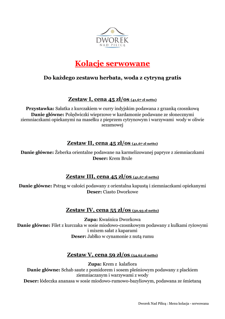 Kolacje serwowane Do każdego zestawu herbata, woda z cytryną gratis Zestaw I, cena 45 zł/os (41,67 zł netto) Przystawka: Sałatka z kurczakiem w curry indyjskim podawana z grzanką czosnkową Danie główne: Polędwiczki wieprzowe w kardamonie podawane ze słonecznymi ziemniaczkami opiekanymi na masełku z pieprzem cytrynowym i warzywami wody w oliwie sezamowej Zestaw II, cena 45 zł/os (41,67 zł netto) Danie główne: Żeberka orientalne podawane na karmelizowanej papryce z ziemniaczkami Deser: Krem Brule Zestaw III, cena 45 zł/os (41,67 zł netto) Danie główne: Pstrąg w całości podawany z orientalna kapustą i ziemniaczkami opiekanymi Deser: Ciasto Dworkowe Zestaw IV, cena 55 zł/os (50,93 zł netto) Zupa: Kwaśnica Dworkowa Danie główne: Filet z kurczaka w sosie miodowo-czosnkowym podawany z kulkami ryżowymi i mixem sałat z kaparami Deser: Jabłko w cynamonie z nutą rumu Zestaw V, cena 59 zł/os (54,63 zł netto) Zupa: Krem z kalafiora Danie główne: Schab saute z pomidorem i sosem pleśniowym podawany z plackiem ziemniaczanym i warzywami z wody Deser: łódeczka ananasa w sosie miodowo-rumowo-bazyliowym, podawana ze śmietaną Dworek Nad Pilicą : Menu kolacja - serwowana