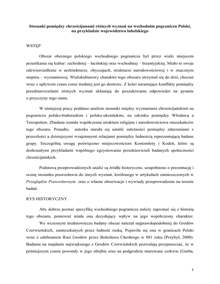 Stosunki pomiędzy chrześcijanami różnych wyznań na wschodnim pograniczu Polski, na przykładzie województwa lubelskiego WSTĘP Obszar obecnego polskiego wschodniego pogranicza był przez wieki miejscem przenikania się kultur: zachodniej – łacińskiej oraz wschodniej – bizantyjskiej. Miało to swoje odzwierciedlenie w architekturze, obyczajach, strukturze narodowościowej i w znacznym stopniu – wyznaniowej. Wielokulturowy charakter tego obszaru utrzymał się do dziś, chociaż wraz z upływem czasu coraz trudniej jest go dostrzec. Z kolei narastające konflikty pomiędzy przedstawicielami różnych wyznań skłaniają do poszukiwania odpowiedzi na pytanie o przyczyny tego stanu. W niniejszej pracy poddano analizie stosunki między wyznaniami chrześcijańskimi na pograniczu polsko-białoruskim i polsko-ukraińskim, na odcinku pomiędzy Włodawą a Terespolem. Zbadana została współczesna struktura religijna i narodowościowa mieszkańców tego obszaru. Ponadto, autorka starała się ustalić zależności pomiędzy zdarzeniami z przeszłości a dzisiejszymi wzajemnymi relacjami pomiędzy ludnością reprezentującą badane grupy. Szczególną uwagę poświęcono miejscowościom Kostomłoty i Kodeń, które są doskonałymi przykładami wspólnego egzystowania przedstawicieli badanych społeczności chrześcijańskich. Podstawą przeprowadzonych analiz są źródła historyczne, uzupełnione o prezentację i ocenę stosunku prawosławia do innych wyznań, kreślonego w artykułach zamieszczonych w Przeglądzie Prawosławnym oraz o własne obserwacje i wywiady przeprowadzone na terenie badań. RYS HISTORYCZNY Aby dobrze poznać specyfikę wschodniego pogranicza należy zapoznać się z historią tego obszaru, ponieważ miała ona decydujący wpływ na jego współczesny charakter. We wczesnym średniowieczu badany obszar należał najprawdopodobniej do Grodów Czerwieńskich, zamieszkanych przez ludność ruską. Pojawiła się ona w granicach Polski wraz z odebraniem Rusi Grodów przez Bolesława Chrobrego w 981 roku (Przybył, 2000). Badania na majdanie największego z Grodów Czerwieńskich pozwalają przypuszczać, że w późniejszym czasie powstały w jego obrębie oraz na podgrodziu murowane cerkwie (Gurba, 1 2004). Wydarzeniem, które miało niezwykle istotne konsekwencje dla dalszej historii badanego obszaru oraz tamtejszych stosunków międzywyznaniowych było podpisanie unii brzeskiej. Na przestrzeni dziejów zarówno duchowieństwo katolickie, jak i władcy polscy dążyli do przyłączenia Cerkwi prawosławnej do Kościoła katolickiego. Przejawem tych dążeń było prowadzenie polityki zmierzającej do ograniczenia wpływów duchowieństwa prawosławnego i osłabienia jego ekonomicznego zaplecza. Cerkiew prawosławną w Polsce postrzegano bowiem jako potencjalne zagrożenie wewnętrzne wynikające z jej silnych związków z Cerkwią rosyjską (Przybył, 2000). Zdecydowana większość biskupów prawosławnych także popierała ideę stworzenia unii obu wyznań. Za najważniejszą przyczynę podpisania na synodzie w Brześciu w 1595 r. unii pomiędzy Kościołem prawosławnym a rzymskokatolickim było dążenie duchowieństwa prawosławnego do gruntownej reformy Cerkwi w Polsce (Pulcyn, 1998). Jej głęboki kryzys, w znaczącym stopniu wywołany działalnością państwa polskiego, niechętnego prawosławiu, stał się bodźcem do nawiązania kontaktów z Kościołem katolickim. Jak uważali niektórzy biskupi prawosławni, poddanie się pod zwierzchnictwo Rzymu mogło pomóc w naprawie Cerkwi. Kolejną przyczyną podpisania unii było dążenie duchownych prawosławnych do uzyskania takich samych przywilejów, jakimi cieszyła się hierarchia katolicka. Jeszcze innym powodem była próba ograniczenia wpływów bractw cerkiewnych posiadających stauropigię1 i kontrolujących zarządzanie diecezjami, oraz aktywna i skuteczna działalność misyjna zakonów katolickich prowadzona wśród ludności prawosławnej (Przybył, 2000). Unia Brzeska została zaaprobowana przez polskiego króla Zygmunta III Wazę, co spowodowało marginalizację Cerkwi prawosławnej w Polsce. Wszystkie przywileje i majątek Cerkwi zostały przekazane nowopowstałemu Kościołowi unickiemu, a biskupi prawosławni przestali być uznawani przez władze świeckie za przedstawicieli społeczności wyznaniowej. W następnych latach na obszarze dzisiejszego wschodniego pogranicza Polski zaczęto budować świątynie unickie. Jedna z nich powstała w 1631 r. w Kostomłotach. Pomimo kasaty majątku cerkiewnego, w niektórych miejscowościach nadal funkcjonowały parafie prawosławne. W sąsiadującym z Kostomłotami Kodniu, równolegle istniały prawosławna 1 Stauropigia – wyłączenie klasztoru spod władzy biskupa i podanie go bezpośrednio najwyższemu zwierzchnikowi danej Cerkwi (wg Przybył, 2000). 2 cerkiew pw. św. Mikołaja oraz kościół katolicki pw. św. Anny. W innych częściach Podlasia2 świątynie często zmieniały opiekunów w zależności od przekonań religijnych właściciela danego majątku. Próby ustabilizowania sytuacji religijnej przerwało zamordowanie unickiego arcybiskupa Jozafata Kuncewicza. Jego śmierć doprowadziła do wzmożenia konfliktów wyznaniowych. Ostatecznie w 1633 r. władze Rzeczypospolitej zalegalizowały Cerkiew prawosławną, co uspokoiło sytuację w kraju (Przybył, 2000). Po załagodzeniu początkowych konfliktów narosłych wokół stworzenia Kościoła unickiego katolicyzm, prawosławie i Kościół unicki rozwijały się bez przeszkód, aż do momentu ostatecznego rozbioru Polski w 1795 r. Cerkiew prawosławna w Polsce została wówczas ujednolicona z patriarchatem moskiewskim, a Kościół unicki został wcielony do Kościoła prawosławnego. Był to jeden z elementów prowadzonej przez carat na ziemiach polskich akcji rusyfikacyjnej. Przebiegała ona bardzo powoli ze względu na liczne protesty ludności unickiej, która nie chciała zmie