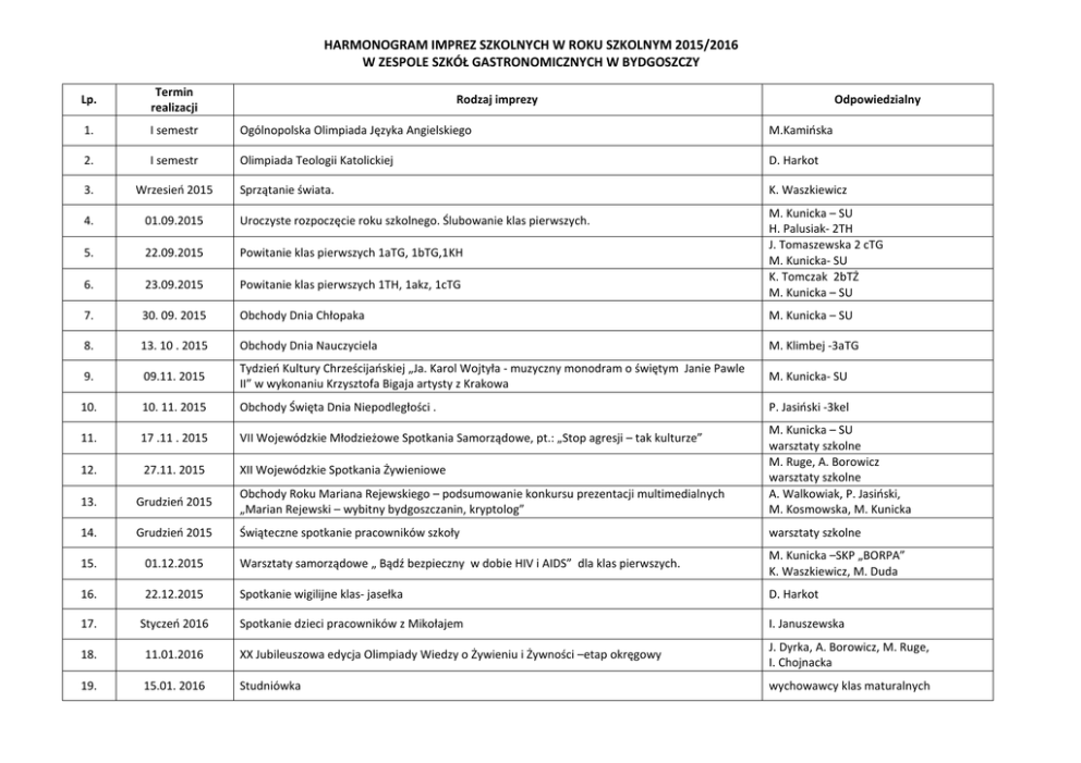 HARMONOGRAM IMPREZ SZKOLNYCH W ROKU SZKOLNYM 2015/2016 W ZESPOLE SZKÓŁ GASTRONOMICZNYCH W BYDGOSZCZY Lp. Termin realizacji 1. I semestr Ogólnopolska Olimpiada Języka Angielskiego M.Kamińska 2. I semestr Olimpiada Teologii Katolickiej D. Harkot 3. Wrzesień 2015 Sprzątanie świata. K. Waszkiewicz 4. 01.09.2015 Uroczyste rozpoczęcie roku szkolnego. Ślubowanie klas pierwszych. 5. 22.09.2015 Powitanie klas pierwszych 1aTG, 1bTG,1KH 6. 23.09.2015 Powitanie klas pierwszych 1TH, 1akz, 1cTG 7. 30. 09. 2015 Obchody Dnia Chłopaka M. Kunicka – SU 8. 13. 10 . 2015 Obchody Dnia Nauczyciela M. Klimbej -3aTG 9. 09.11. 2015 Tydzień Kultury Chrześcijańskiej „Ja. Karol Wojtyła - muzyczny monodram o świętym Janie Pawle II” w wykonaniu Krzysztofa Bigaja artysty z Krakowa M. Kunicka- SU 10. 10. 11. 2015 Obchody Święta Dnia Niepodległości . P. Jasiński -3kel 11. 17 .11 . 2015 VII Wojewódzkie Młodzieżowe Spotkania Samorządowe, pt.: „Stop agresji – tak kulturze” 12. 27.11. 2015 XII Wojewódzkie Spotkania Żywieniowe 13. Grudzień 2015 Obchody Roku Mariana Rejewskiego – podsumowanie konkursu prezentacji multimedialnych „Marian Rejewski – wybitny bydgoszczanin, kryptolog” M. Kunicka – SU warsztaty szkolne M. Ruge, A. Borowicz warsztaty szkolne A. Walkowiak, P. Jasiński, M. Kosmowska, M. Kunicka 14. Grudzień 2015 Świąteczne spotkanie pracowników szkoły warsztaty szkolne 15. 01.12.2015 Warsztaty samorządowe „ Bądź bezpieczny w dobie HIV i AIDS” dla klas pierwszych. M. Kunicka –SKP „BORPA” K. Waszkiewicz, M. Duda 16. 22.12.2015 Spotkanie wigilijne klas- jasełka D. Harkot 17. Styczeń 2016 Spotkanie dzieci pracowników z Mikołajem I. Januszewska 18. 11.01.2016 XX Jubileuszowa edycja Olimpiady Wiedzy o Żywieniu i Żywności –etap okręgowy J. Dyrka, A. Borowicz, M. Ruge, I. Chojnacka 19. 15.01. 2016 Studniówka wychowawcy klas maturalnych Rodzaj imprezy Odpowiedzialny M. Kunicka – SU H. Palusiak- 2TH J. Tomaszewska 2 cTG M. Kunicka- SU K. Tomczak 2bTŻ M. Kunicka – SU 20. Luty 2016 Obchody Dnia Patrona szkoły J. Tomaszewska, J. Kozińska 21. Luty 2016 Walentynki H. Palusiak – Kotlarz - 2 TH 22. Marzec 2016 Dzień Języków Obcych Nauczyciele języków obcych 23. Marzec 2016 Obchody Dnia Kobiet K. Siwka – 1KH 24. Kwiecień 2016 V Forum Samorządów Uczniowskich Szkół Ponadgimnazjalnych woj. kuj-pom. M. Kunicka – SU 25. Kwiecień 2016 Warsztaty Samorządu Uczniowskiego – „ Dobre maniery” M. Kunicka – SU 26. Kwiecień 2016 Targi Edukacyjne „ ŁUCZNICZKA „ I. Chojnacka, M. Kunicka, K. Siwka 27. Kwiecień 2016 Dzień Ziemi , Dzień Zdrowia 28. Kwiecień 2016 Montaż słowno –muzyczny poświecony św. JP II 29. Kwiecień 2016 Uroczyste pożegnanie klas maturalnych 30. 23.04.2016 31. Maj 2016 „Nie bierz narkotyków, nie bierz dopalaczy” scenki profilaktyczne 32. Maj 2016 Święto Konstytucji 3 –go maja – Ogólnoszkolny Konkurs Hymnu Państwowego 33. Drzwi Otwarte ZSG Maj \Czerwiec 2016 Warsztaty pt. „ ARS – czyli jak dbać o miłość” Uroczyste pożegnanie klas zawodowych K. Waszkiewicz, M. Duda, M. Czekajewska - Stańczyk D. Harkot, K. Rolle M. Hellak – 1TH M. Kunicka - SU, I. Januszewska – 3TH K. Siwka –zesp. tan., Wych. Kl. Matural. nauczyciele szkoły J. Tomaszewska zespół wychowawczy J. Kowalska , M. Kunicka – SU P. Jasiński , wychowawcy klas pierwszych K. Waszkiewicz, M. Kunicka M. Duda M. Kunicka - SU wychowawcy klas trzecich zawodowych 34. Czerwiec 2016 35. 2015/2016 Olimpiada Wiedzy Hotelarskiej S. Wagner 36. 2015/2016 Olimpiada Wiedzy o Żywieniu i Żywności A. Borowicz 37. 2015/2016 Olimpiada Wiedzy o Bezpieczeństwie H. Pasera 38. 2015/2016 Olimpiada Ekonomiczna i Przedsiębiorczości 39. Luty/kwiecień Mistrzostwa szkoły w piłce siatkowej dziewcząt 40. Luty/kwiecień Mistrzostwa szkoły w piłce siatkowej chłopców 41. Luty/kwiecień Mistrzostwa szkoły w koszykówce chłopców M. Duda M. Brzeźniak B. Wojciechowska G. Banach G. Banach W. Sowiński S. Rabiej 42. 23.04.2016 Opracowała Małgorzata Kunicka Mecze pokazowe piłki siatkowej dziewcząt i chłopców i piłki koszykowej chłopców Nauczyciele w-f