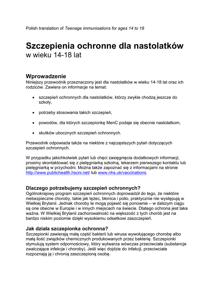 Polish translation of Teenage immunisations for ages 14 to 18 Szczepienia ochronne dla nastolatków w wieku 14-18 lat Wprowadzenie Niniejszy przewodnik przeznaczony jest dla nastolatków w wieku 14-18 lat oraz ich rodziców. Zawiera on informacje na temat: • szczepień ochronnych dla nastolatków, którzy zwykle chodzą jeszcze do szkoły, • potrzeby stosowania takich szczepień, • powodów, dla których szczepionkę MenC podaje się obecnie nastolatkom, • skutków ubocznych szczepień ochronnych. Przewodnik odpowiada także na niektóre z najczęstszych pytań dotyczących szczepień ochronnych. W przypadku jakichkolwiek pytań lub chęci zasięgnięcia dodatkowych informacji, prosimy skontaktować się z pielęgniarką szkolną, lekarzem pierwszego kontaktu lub pielęgniarką w przychodni. Można także zapoznać się z informacjami na stronie http://www.publichealth.hscni.net/ lub www.nhs.uk/vaccinations. Dlaczego potrzebujemy szczepień ochronnych? Ogólnokrajowy program szczepień ochronnych doprowadził do tego, że niektóre niebezpieczne choroby, takie jak tężec, błonica i polio, praktycznie nie występują w Wielkiej Brytanii. Jednak choroby te mogą pojawić się ponownie – w dalszym ciągu są one obecne w Europie i w innych miejscach na świecie. Dlatego ochrona jest taka ważna. W Wielkiej Brytanii zachorowalność na większość z tych chorób jest na bardzo niskim poziomie dzięki wysokiemu odsetkowi zaszczepień. Jak działa szczepionka ochronna? Szczepionki zawierają małą część bakterii lub wirusa wywołującego chorobę albo małą ilość związków chemicznych produkowanych przez bakterię. Szczepionki stymulują system odpornościowy, który wytwarza wówczas przeciwciała (substancje zwalczające infekcje i choroby). Jeśli więc dojdzie do infekcji, przeciwciała rozpoznają ją i chronią zaszczepioną osobę. Szczepionka Td/IPV Szczepionka Td/IPV, podawana w postaci jednego zastrzyku, wzmacnia nabytą w wieku dziecięcym ochronę przeciwko tężcowi (tetanus, T), błonicy (diphteria, d) oraz polio (IPV – inaktywowana szczepionka przeciwko polio). Przed jakimi chorobami chroni szczepionka Td/IPV? Tężec Tężec to bolesna choroba, która atakuje mięśnie i może spowodować problemy z oddychaniem. Oddziałuje na system nerwowy i może doprowadzić do śmierci. Tężcem można się zarazić, jeśli zarazki, które znajdują się w glebie lub w nawozie, dostaną się do organizmu przez otwarte skaleczenie lub poparzenie. Zarażona osoba nie może zarazić nikogo innego, ale zarazki tej choroby można znaleźć w glebie, także w naszym kraju. Błonica Błonica to poważna choroba, która zwykle rozpoczyna się od bolącego gardła i może szybko się rozwinąć, prowadząc do problemów z oddychaniem. Może uszkodzić serce i system nerwowy, a w poważnych przypadkach nawet doprowadzić do śmierci. Przed wprowadzeniem szczepionki na błonicę w Irlandii Północnej rocznie chorowało na nią nawet 1500 osób. Polio Polio to wirus, który atakuje system nerwowy i może doprowadzić do nieodwracalnego paraliżu mięśni. Jeśli zaatakuje mięśnie klatki piersiowej lub mózg, może spowodować śmierć. Przed wprowadzeniem szczepionki przeciwko polio w Irlandii Północnej odnotowywano rocznie nawet 1500 przypadków postaci porażennej tej choroby. Jeśli zostałem(-am) zaszczepiony(-a) przeciwko tężcowi, błonicy i polio jako dziecko, czy jestem w dalszym ciągu odporny(-a)? Organizm w dalszym ciągu może być częściowo odporny. Potrzebna jest jednak dawka przypominająca, aby zakończyć serię szczepień i uzyskać długoterminową ochronę. Ile dawek przypominających należy przyjąć? Aby wytworzyć i utrzymać odporność na tężec, błonicę i polio, trzeba przyjąć 5 dawek szczepionek. Każdy powinien otrzymać: • • • pierwsze 3 dawki, będąc małym dzieckiem, 4. dawkę pomiędzy 3. i 5. rokiem życia, przed rozpoczęciem nauki w szkole, 5. dawkę obecnie. Zwykle przez całe życie nie trzeba przyjąć więcej niż 5 dawek szczepionki przeciwko tężcowi, błonicy i polio, ale dodatkowe dawki mogą być potrzebne, jeśli wyjeżdża się za granicę. W konkretnych przypadkach należy zapytać o to pielęgniarkę w swojej przychodni. Jeśli sądzisz, że nie zostały podane wszystkie dawki szczepionki, należy porozmawiać o tym z pielęgniarką szkolną lub lekarzem. Szczepionka MenC Co to jest zapalenie opon mózgowych typu C? Zapalenie opon mózgowych typu C było kiedyś częstą przyczyną zapalenia opon mózgowych i posocznicy (sepsy). Od momentu wprowadzenia szczepionki MenC liczba przypadków zapalenia opon mózgowych typu C znacząco spadła. Dlaczego oferuje się mi obecnie szczepionkę MenC? Badania wykazały, że chociaż szczepionki podawane małym dzieciom zapewniają im ochronę, to zaczyna ona słabnąć, gdy dzieci stają się nastolatkami. Dawka przypominająca podana w tym czasie przedłuży ochronę przed zapaleniem opon mózgowych typu C na wiele lat. Ochrona nastolatków jest szczególnie ważna, gdyż w tym wieku niebezpieczeństwo zachorowania na tę chorobę jest podwyższone. Częste pytania W jaki sposób podaje się szczepionki? Każda szczepionka podawana jest w postaci jednego zastrzyku w górną część ramienia. Nikt nie lubi zastrzyków, ale to trwa bardzo krótko. Igła jest mała i odczuwa się tylko drobne ukłucie. Jeśli boisz się zastrzyku, wcześniej powiedz o tym pielęgniarce lub lekarzowi. Czy są jakieś przeciwwskazania do podania szczepionek? Istnieje niewiele przeciwwskazań do szczepień ochronnych. Należy poinformować lekarza pierwszego kontaktu lub pielęgniarkę, jeśli: • • • • • • • • • • masz bardzo wysoką temperaturę, miałeś/miałaś konwulsje lub drgawki gorączkowe, miałeś/miałaś niepożądaną reakcję na wcześniejsze szczepienia, cierpisz na silną alergię, cierpisz na zaburzenia krzepnięcia krwi, byłeś/byłaś leczony(-a) na no