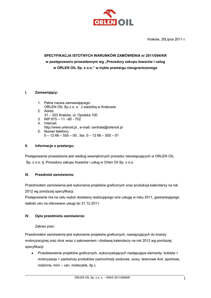 Kraków, 20Lipca 2011 r. SPECYFIKACJA ISTOTNYCH WARUNKÓW ZAMÓWIENIA nr 2011/094/KR w postępowaniu prowadzonym wg „Procedury zakupu towarów i usług w ORLEN OIL Sp. z o.o.” w trybie przetargu nieograniczonego I. Zamawiający: 1. Pełna nazwa zamawiającego: ORLEN OIL Sp z o. o. z siedzibą w Krakowie 2. Adres: 31 – 323 Kraków, ul. Opolska 100 3. NIP 675 – 11 –90 - 702 4. Internet: http://www.orlenoil.pl., e-mail: [email protected] 5. Numer telefonu: 0 – 12 66 – 555 – 00 , fax: 0 – 12 66 – 555 – 01 II. Informacje o przetargu: Postępowanie prowadzone jest według wewnętrznych procedur obowiązujących w ORLEN OIL Sp. z o.o. tj. Procedury zakupu towarów i usług w Orlen Oil Sp. z o.o. III. Przedmiot zamówienia: Przedmiotem zamówienia jest wykonania projektów graficznych oraz produkcja kalendarzy na rok 2012 wg poniższej specyfikacji. Postępowanie ma na celu wybór dostawcy realizującego w/w usługę w roku 2011, gwarantującego stałość cen na oferowane usługi do 31.12.2011. IV. Opis przedmiotu zamówienia: Zakres prac: Przedmiotem zamówienia jest wykonanie projektów graficznych, nawiązujących do branży motoryzacyjnej oraz druk wraz z pakowaniem i dostawą kalendarzy na rok 2012 wg poniższej specyfikacji. Przedstawienie projektów graficznych, wykorzystujących następujące elementy: kobieta + motoryzacja + packshoty produktów (samochody osobowe, suwy, terenowe 4x4, sportowe, rodzinne, mini – van, motocykle, itp.). ORLEN OIL Sp. z o. o. – SIWZ 2011/094KR 1 W projekcie uwzględnienie zamieszczenia logotypu: Wymień Olej na Platinum na każdej karcie, a na kartach okładkowych danych teleadresowych: ORLEN OIL (LOGO) ul. Opolska 100, 31-323 Kraków, Tel.(+48) 12 66 55 500, fax (+48) 12 66 55 501, infolinia 0 801 102 103, [email protected], www.orlenoil.pl Kalendarze w następujących wariantach i nakładach: 1) Kalendarz trzynastostronicowy + koperta z logo Wymień Olej na Platinum (full color) – B2 poziom - nakład 2000 szt. 2) Kalendarz trójdzielny + koperta z logo Wymień Olej na Platinum (full color)- rozmiar standardowy - nakład 5000 szt. 3) Kalendarz plakatowy (full color) – B1 -nakład 5000 szt. 4) Biuwar (maks.3 kolory) - 54 karty - nakład 1000 szt. Wykonanie kalendarzy – na materiałach (papier, folia itp.) o najwyższych parametrach jakościowych, które będą analizowane szczegółowo w II etapie postępowania. Oferta winna być opracowana dla wszystkich typów kalendarzy – nie dopuszcza się składania ofert częściowych. V. Sposób przygotowania oferty: 1. Oferta powinna składać się z dwóch oddzielnych części: merytorycznej i handlowej w oddzielnych zapieczętowanych kopertach z właściwym dopiskiem na kopertach: „Cześć merytoryczna oferty”, „Część handlowa oferty”. Koperty z częściami merytoryczną i handlową powinny być właściwie opisane. 2. Część merytoryczna oferty powinna zawierać dokumenty i informacje wymienione w rozdziale VI Specyfikacji Istotnych Warunków Zamówienia. 3. Część handlowa oferty powinna zawierać dokumenty i informacje wymienione w rozdziale VII Specyfikacji Istotnych Warunków Zamówienia. 4. Sposób przygotowania oferty: a. Oferta powinna być napisana czytelnie w języku polskim. b. Wszystkie strony oferty wraz z załącznikami powinny być podpisane przez osobę (osoby) uprawnioną do występowania w imieniu oferenta. c. Wszystkie strony oferty wraz z załącznikami powinny być spięte w sposób zapobiegający jej dekompletacji. d. Wszelkie poprawki lub zmiany w tekście oferty muszą być parafowane i datowane własnoręcznie przez osobę podpisującą ofertę lub przez osobę upoważnioną. 5. Do oferty należy załączyć płytę DVD (opisana: nazwa firmy + dopisek: „Projekty kalendarzy 2012”) ze wszystkimi dokumentami i załącznikami wchodzącymi w skład oferty w tym projektami graficznymi w formacie PDF/JPG, oraz Załącznik nr 2 Szablon oferty w formacie *.xls oraz oferta całościowa w formie papierowej - drukowanej (wydrukowane projekty). 6. Opakowanie i oznakowanie ofert: Ofertę należy złożyć/ przesłać w zamkniętym opakowaniu w miejscu wskazanym w pkt. X 7. Zamawiający nie bierze odpowiedzialności za skutki braku zachowania powyższych warunków przez Oferenta. Nie spełnienie wymagań j/w spowoduje odrzucenie oferty. 8. Oferent poniesie wszelkie koszty związane z przygotowaniem i złożeniem oferty. ORLEN OIL Sp. z o. o. – SIWZ 2011/094KR 2 VI. Informacja o dokumentach, jakie mają dostarczyć dostawcy w części merytorycznej oferty: Oferenci w części merytorycznej oferty obowiązani są złożyć następujące dokumenty: 1. Propozycje projektów graficznych kalendarzy na 2012 rok, wzory wcześniejszych produkcji, przykładowe zdjęcia z poprzednich sesji fotograficznych –w formie elektronicznej. 2. Szczegółowy harmonogram realizacji prac oraz gwarantowany termin dostawy od zaakceptowanego projektu graficznego. 3. Aktualny odpis z właściwego rejestru albo aktualne zaświadczenie o wpisie do ewidencji działalności gospodarczej, jeżeli odrębne przepisy wymagają wpisu do rejestru lub zgłoszenia do ewidencji działalności gospodarczej, wystawiony nie wcześniej niż 6 miesięcy przed upływem terminu składania ofert (lub dokument potwierdzony w tym terminie przez organ wydający), 4. Pełnomocnictwo, jeżeli ofertę podpisują inne osoby niż uprawnione do zaciągania zobowiązań w imieniu oferenta; 5. Koncesję, zezwolenie lub licencję, (jeżeli ustawy nakładają obowiązek posiadania koncesji, zezwolenia lub licencji na podjęcie działalności gospodarczej w zakresie objętym zamówieniem). 6. Dokumenty stwierdzające, że osoby, które będą wykonywać zamówienie, posiadają wymagane uprawnienia, jeżeli ustawy nakładają obowiązek posiadania takich uprawnień. 7. Oświadczenie oferenta, że nie podlega wykluczeniu z następujących powodów: nie wywiązanie się wobec ORLEN OIL z należytą staranności