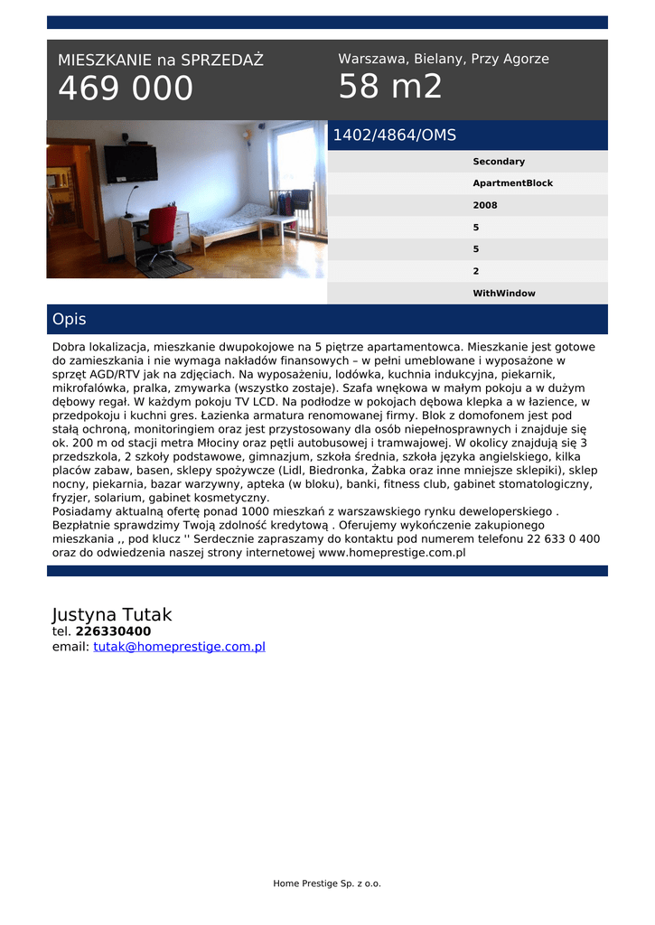 MIESZKANIE na SPRZEDAŻ 469 000 Warszawa, Bielany, Przy Agorze 58 m2 1402/4864/OMS Secondary ApartmentBlock 2008 5 5 2 WithWindow Opis Dobra lokalizacja, mieszkanie dwupokojowe na 5 piętrze apartamentowca. Mieszkanie jest gotowe do zamieszkania i nie wymaga nakładów finansowych – w pełni umeblowane i wyposażone w sprzęt AGD/RTV jak na zdjęciach. Na wyposażeniu, lodówka, kuchnia indukcyjna, piekarnik, mikrofalówka, pralka, zmywarka (wszystko zostaje). Szafa wnękowa w małym pokoju a w dużym dębowy regał. W każdym pokoju TV LCD. Na podłodze w pokojach dębowa klepka a w łazience, w przedpokoju i kuchni gres. Łazienka armatura renomowanej firmy. Blok z domofonem jest pod stałą ochroną, monitoringiem oraz jest przystosowany dla osób niepełnosprawnych i znajduje się ok. 200 m od stacji metra Młociny oraz pętli autobusowej i tramwajowej. W okolicy znajdują się 3 przedszkola, 2 szkoły podstawowe, gimnazjum, szkoła średnia, szkoła języka angielskiego, kilka placów zabaw, basen, sklepy spożywcze (Lidl, Biedronka, Żabka oraz inne mniejsze sklepiki), sklep nocny, piekarnia, bazar warzywny, apteka (w bloku), banki, fitness club, gabinet stomatologiczny, fryzjer, solarium, gabinet kosmetyczny. Posiadamy aktualną ofertę ponad 1000 mieszkań z warszawskiego rynku deweloperskiego . Bezpłatnie sprawdzimy Twoją zdolność kredytową . Oferujemy wykończenie zakupionego mieszkania ,, pod klucz '' Serdecznie zapraszamy do kontaktu pod numerem telefonu 22 633 0 400 oraz do odwiedzenia naszej strony internetowej www.homeprestige.com.pl Justyna Tutak tel. 226330400 email: [email protected] Home Prestige Sp. z o.o. Powered by TCPDF (www.tcpdf.org)