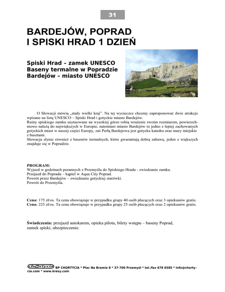 31 BARDEJÓW, POPRAD I SPISKI HRAD 1 DZIEŃ Spiski Hrad – zamek UNESCO Baseny termalne w Popradzie Bardejów – miasto UNESCO O Słowacji mówią „mały wielki kraj”. Na tej wycieczce chcemy zaproponować dwie atrakcje wpisane na listę UNESCO – Spiski Hrad i gotyckie miasto Bardejów. Ruiny spiskiego zamku usytuowane na wysokiej górze robią wrażenie swoim rozmiarem, powierzchniowo należą do największych w Europie, natomiast miasto Bardejów to jedno z lepiej zachowanych gotyckich miast w naszej części Europy, zaś Perłą Bardejowa jest gotycka katedra oraz mury miejskie z basztami. Słowacja słynie również z basenów termalnych, które gwarantują dobrą zabawę, jeden z większych znajduje się w Popradzie. PROGRAM: Wyjazd w godzinach porannych z Przemyśla do Spiskiego Hradu - zwiedzanie zamku. Przejazd do Popradu – kąpiel w Aqua City Poprad. Powrót przez Bardejów – zwiedzanie gotyckiej starówki. Powrót do Przemyśla. Cena: 175 zł/os. Ta cena obowiązuje w przypadku grupy 40 osób płacących oraz 3 opiekunów gratis. Cena: 225 zł/os. Ta cena obowiązuje w przypadku grupy 25 osób płacących oraz 2 opiekunów gratis. Świadczenia: przejazd autokarem, opieka pilota, bilety wstępu – baseny Poprad, zamek spiski, ubezpieczenie. BP CHORTYCIA * Plac Na Bramie 8 * 37-700 Przemyśl * tel./fax 678 6585 * [email protected] * www.kresy.com