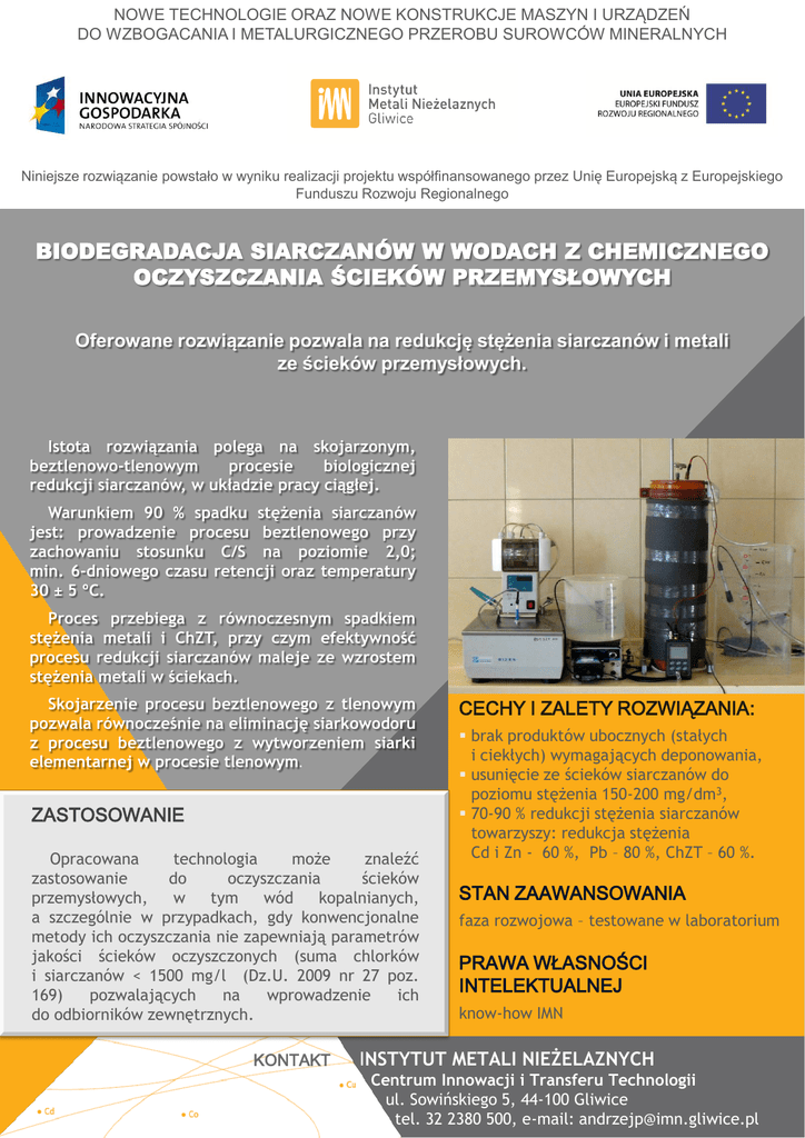 NOWE TECHNOLOGIE ORAZ NOWE KONSTRUKCJE MASZYN I URZĄDZEŃ DO WZBOGACANIA I METALURGICZNEGO PRZEROBU SUROWCÓW MINERALNYCH Niniejsze rozwiązanie powstało w wyniku realizacji projektu współfinansowanego przez Unię Europejską z Europejskiego Funduszu Rozwoju Regionalnego BIODEGRADACJA SIARCZANÓW W WODACH Z CHEMICZNEGO OCZYSZCZANIA ŚCIEKÓW PRZEMYSŁOWYCH Oferowane rozwiązanie pozwala na redukcję stężenia siarczanów i metali ze ścieków przemysłowych. Istota rozwiązania polega na skojarzonym, beztlenowo-tlenowym procesie biologicznej redukcji siarczanów, w układzie pracy ciągłej. Warunkiem 90 % spadku stężenia siarczanów jest: prowadzenie procesu beztlenowego przy zachowaniu stosunku C/S na poziomie 2,0; min. 6-dniowego czasu retencji oraz temperatury 30 ± 5 ºC. Proces przebiega z równoczesnym spadkiem stężenia metali i ChZT, przy czym efektywność procesu redukcji siarczanów maleje ze wzrostem stężenia metali w ściekach. Skojarzenie procesu beztlenowego z tlenowym pozwala równocześnie na eliminację siarkowodoru z procesu beztlenowego z wytworzeniem siarki elementarnej w procesie tlenowym. ZASTOSOWANIE Opracowana technologia może znaleźć zastosowanie do oczyszczania ścieków przemysłowych, w tym wód kopalnianych, a szczególnie w przypadkach, gdy konwencjonalne metody ich oczyszczania nie zapewniają parametrów jakości ścieków oczyszczonych (suma chlorków i siarczanów < 1500 mg/l (Dz.U. 2009 nr 27 poz. 169) pozwalających na wprowadzenie ich do odbiorników zewnętrznych. KONTAKT CECHY I ZALETY ROZWIĄZANIA: brak produktów ubocznych (stałych i ciekłych) wymagających deponowania, usunięcie ze ścieków siarczanów do poziomu stężenia 150-200 mg/dm3, 70-90 % redukcji stężenia siarczanów towarzyszy: redukcja stężenia Cd i Zn - 60 %, Pb – 80 %, ChZT – 60 %. STAN ZAAWANSOWANIA faza rozwojowa – testowane w laboratorium PRAWA WŁASNOŚCI INTELEKTUALNEJ know-how IMN INSTYTUT METALI NIEŻELAZNYCH Centrum Innowacji i Transferu Technologii ul. Sowińskiego 5, 44-100 Gliwice tel. 32 2380 500, e-mail: [email protected]
