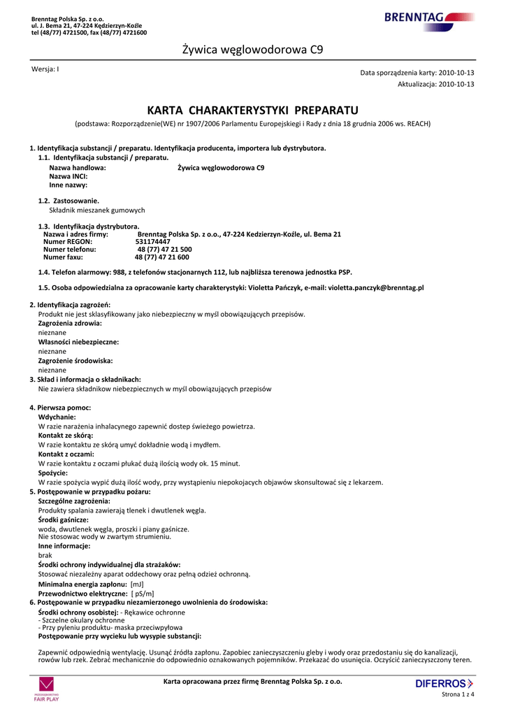 Brenntag Polska Sp. z o.o. ul. J. Bema 21, 47-224 Kędzierzyn-Koźle tel (48/77) 4721500, fax (48/77) 4721600 Żywica węglowodorowa C9 Wersja: I Data sporządzenia karty: 2010-10-13 Aktualizacja: 2010-10-13 KARTA CHARAKTERYSTYKI PREPARATU (podstawa: Rozporządzenie(WE) nr 1907/2006 Parlamentu Europejskiegi i Rady z dnia 18 grudnia 2006 ws. REACH) 1. Identyfikacja substancji / preparatu. Identyfikacja producenta, importera lub dystrybutora. 1.1. Identyfikacja substancji / preparatu. Nazwa handlowa: Żywica węglowodorowa C9 Nazwa INCI: Inne nazwy: 1.2. Zastosowanie. Składnik mieszanek gumowych 1.3. Identyfikacja dystrybutora. Nazwa i adres firmy: Brenntag Polska Sp. z o.o., 47-224 Kedzierzyn-Koźle, ul. Bema 21 Numer REGON: 531174447 Numer telefonu: 48 (77) 47 21 500 Numer faxu: 48 (77) 47 21 600 1.4. Telefon alarmowy: 988, z telefonów stacjonarnych 112, lub najbliższa terenowa jednostka PSP. 1.5. Osoba odpowiedzialna za opracowanie karty charakterystyki: Violetta Pańczyk, e-mail: [email protected] 2. Identyfikacja zagrożeń: Produkt nie jest sklasyfikowany jako niebezpieczny w myśl obowiązujących przepisów. Zagrożenia zdrowia: nieznane Własności niebezpieczne: nieznane Zagrożenie środowiska: nieznane 3. Skład i informacja o składnikach: Nie zawiera składnikow niebezpiecznych w myśl obowiązujących przepisów 4. Pierwsza pomoc: Wdychanie: W razie narażenia inhalacynego zapewnić dostep świeżego powietrza. Kontakt ze skórą: W razie kontaktu ze skórą umyć dokładnie wodą i mydłem. Kontakt z oczami: W razie kontaktu z oczami płukać dużą ilością wody ok. 15 minut. Spożycie: W razie spożycia wypić dużą ilość wody, przy wystąpieniu niepokojacych objawów skonsultować się z lekarzem. 5. Postępowanie w przypadku pożaru: Szczególne zagrożenia: Produkty spalania zawierają tlenek i dwutlenek węgla. Środki gaśnicze: woda, dwutlenek węgla, proszki i piany gaśnicze. Nie stosowac wody w zwartym strumieniu. Inne informacje: brak Środki ochrony indywidualnej dla strażaków: Stosować niezależny aparat oddechowy oraz pełną odzież ochronną. Minimalna energia zapłonu: [mJ] Przewodnictwo elektryczne: [ pS/m] 6. Postępowanie w przypadku niezamierzonego uwolnienia do środowiska: Środki ochrony osobistej: - Rękawice ochronne - Szczelne okulary ochronne - Przy pyleniu produktu- maska przeciwpyłowa Postępowanie przy wycieku lub wysypie substancji: Zapewnić odpowiednią wentylację. Usunąć źródła zapłonu. Zapobiec zanieczyszczeniu gleby i wody oraz przedostaniu się do kanalizacji, rowów lub rzek. Zebrać mechanicznie do odpowiednio oznakowanych pojemników. Przekazać do usunięcia. Oczyścić zanieczyszczony teren. Karta opracowana przez firmę Brenntag Polska Sp. z o.o. Strona 1 z 4 Brenntag Polska Sp. z o.o. ul. J. Bema 21, 47-224 Kędzierzyn-Koźle tel (48/77) 4721500, fax (48/77) 4721600 Żywica węglowodorowa C9 7. Postępowanie z substancją / preparatem i magazynowanie: Magazynowanie: Przechowywać w suchych, chłodnych, dobrze wentylowanych pomieszczeniach. Chronic przed bezpośrednim nasłonecznieniem. Postępowanie z substancją lub preparatem: Unikać kontaktu z oczami i skórą. Nie wdychać pyłu. Unikać wzniecania pyłu. Zapewnić odpowiednią wentylację pomieszczenia. Zapobiegać gromadzeniu się ładunków elektrostatycznych - stosować uziemienie. 8. Kontrola narażenia i środki ochrony indywidualnej: Stosowane środki ochrony osobistej powinny spełniać wymogi Rozporządzenia Ministra Gospodarki z dnia 21 grudnia 2005 r. w sprawie zasadniczych wymagań dla środków ochrony indywidualnej (Dz.U. Nr 259, poz. 2173). Ochrona dróg oddechowych: w przypadku dużego stężenia pyłu – maska ochronna Ochrona oczu: szczelne okulary ochronne z osłoną boczną Ochrona rąk: Rękawice ochronne Techniczne środki ochronne: wentylacja ogólna pomieszczeń Inne wyposażenie ochronne: odzież ochronna Kontrola zagrożenia: Najwyższe dopuszczalne stężenia: NDS, NDSCh - nie oznaczono (wg Rozporządzenia MPiPS z dn. 29 listopada 2002 ; Dz.U. Nr 217, poz. 1833 z późniejszymi zmianami) Zalecenia dotyczące procedury monitoringu zawartości składników niebezpiecznych w powietrzu – metodyka pomiarów: -Rozporządzenie Ministra Zdrowia z dnia 20 kwietnia 2005 r. w sprawie badań i pomiarów czynników szkodliwych dla zdrowia w środowisku pracy (Dz.U. Nr 73, poz.645) -PN-89/Z-01001/06. Ochrona czystości powietrza. Nazwy, określenia i jednostki. Terminologia dotycząca badań jakości powietrza na stanowiskach pracy. -PN Z-04008-7:2002. Ochrona czystości powietrza. Pobieranie próbek. Zasady pobierania próbek powietrza w środowisku pracy i interpretacja wyników. -PN-EN-689: 2002. Powietrze na stanowiskach pracy – wytyczne oceny narażenia inhalacyjnego na czynniki chemiczne przez porównanie z wartościami dopuszczalnymi i strategia pomiarowa. Uwaga: Gdy stężenie substancji jest ustalone i znane, doboru środków ochrony indywidualnej należy dokonywać z uwzględnieniem stężenia substancji występującego na danym stanowisku pracy, czasu ekspozycji oraz czynności wykonywanych przez pracownika. W sytuacji awaryjnej, jeżeli stężenie substancji na stanowisku pracy nie jest znane, stosować środki ochrony indywidualnej o najwyższej zalecanej klasie ochrony. Pracodawca jest obowiązany zapewnić, aby stosowane środki ochrony indywidualnej oraz odzież i obuwie robocze posiadały właściwości ochronne i użytkowe oraz zapewnić odpowiednie ich pranie, konserwacje, naprawę i odkażanie. Zalecane badania wstępne i okresowe pracowników należy przeprowadzać zgodnie z Rozporządzeniem Ministra Zdrowia i Opieki Społecznej z dnia 30 maja 1996 r. w sprawie przeprowadzania badań lekarskich pracowników, zakresu profilaktycznej opieki zdrowotnej nad pracownikami oraz orzeczeń lekarskich wydanych do celów przewidzianych w Kodeksie Pracy (Dz.U. Nr 69/1996r. poz. 332, ze zmianami Dz.U. Nr 37/2001r. poz. 451) 9. Wł