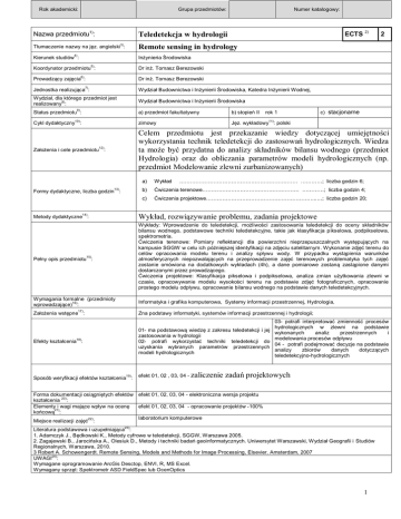 Grupa przedmiotów: Rok akademicki: Nazwa przedmiotu1): Numer katalogowy: ECTS 2) Teledetekcja w hydrologii 3) Tłumaczenie nazwy na jęz. angielski : 2 Remote sensing in hydrology 4) Kierunek studiów : Inżynieria Środowiska 5) Dr inż. Tomasz Berezowski Koordynator przedmiotu : 6) Prowadzący zajęcia : Dr inż. Tomasz Berezowski 7) Jednostka realizująca : Wydział Budownictwa i Inżynierii Środowiska, Katedra Inżynierii Wodnej, Wydział, dla którego przedmiot jest 8) realizowany : Wydział Budownictwa i Inżynierii Środowiska 9) Status przedmiotu : a) przedmiot fakultatywny 10) b) stopień II rok 1 c) stacjonarne 11) Jęz. wykładowy : polski Cykl dydaktyczny : zimowy Założenia i cele przedmiotu : Celem przedmiotu jest przekazanie wiedzy dotyczącej umiejętności wykorzystania technik teledetekcji do zastosowań hydrologicznych. Wiedza ta może być przydatna do analizy składników bilansu wodnego (przedmiot Hydrologia) oraz do obliczania parametrów modeli hydrologicznych (np. przedmiot Modelowanie zlewni zurbanizowanych) 12) 13) Formy dydaktyczne, liczba godzin : a) Wykład b) Ćwiczenia terenowe……………………………………………… …………; liczba godzin 4; ………………………………………………………… …………; liczba godzin 6; c) Ćwiczenia projektowe……………………………………………………..…; liczba godzin 20; Wykład, rozwiązywanie problemu, zadania projektowe 14) Metody dydaktyczne : Wykłady: Wprowadzenie do teledetekcji, możliwości zastosowania teledetekcji do oceny składników bilansu wodnego, podstawowe techniki teledetekcyjne, takie jak klasyfikacja pikselowa, podpikselowa, spektrometria. Ćwiczenia terenowe: Pomiary reflektancji dla powierzchni nieprzepuszczalnych występujących na kampusie SGGW w celu ich późniejszej identyfikacji na zdjęciu satelitarnym. Wykonanie zdjęć terenu do celów opracowania modelu terenu i analizy spływu wody. W przypadku wystąpienia warunków atmosferycznych niepozwalających na przeprowadzenie zajęć terenowych problematyka tych zajęć zostanie omówiona na dodatkowych wykładach (4h), a dane pomiarowe zostaną zastąpione danymi dostarczonymi przez prowadzącego. Ćwiczenia projektowe: Klasyfikacja pikselowa i podpikselowa, analiza zmian użytkowania zlewni w czasie, opracowywanie modelu wysokości terenu na podstawie zdjęć fotograficznych, opracowanie prostego modelu odpływu, opracowanie bilansu wodnego na podstawie danych teledetekcyjnych. 15) Pełny opis przedmiotu : Wymagania formalne (przedmioty 16) wprowadzające) : Informatyka i grafika komputerowa, Systemy informacji przestrzennej, Hydrologia, 17) Założenia wstępne : Zna podstawy informatyki, systemów informacji przestrzennej i hydrologii; 01- ma podstawową wiedzę z zakresu teledetekcji i jej zastosowania w hydrologii 02- potrafi wykorzystać techniki teledetekcji do uzyskania wybranych parametrów przestrzennych modeli hydrologicznych 18) Efekty kształcenia : 19) Sposób weryfikacji efektów kształcenia : efekt 01, 02 , 03, 04 - zaliczenie 03- potrafi interpretować zmienność procesów hydrologicznych w zlewni na podstawie wykonanych analiz przestrzennych i modelowania procesów odpływu 04 - potrafi podejmować decyzje na podstawie analizy zbiorów danych dotyczących teledetekcyjno-hydrologicznych zadań projektowych Forma dokumentacji osiągniętych efektów efekt 01, 02, 03, 04 - elektroniczna wersja projektu 20) kształcenia : Elementy i wagi mające wpływ na ocenę efekt 01, 02, 03, 04 - opracowanie projektów -100% 21) końcową : laboratorium komputerowe 22) Miejsce realizacji zajęć : 23) Literatura podstawowa i uzupełniająca : 1. Adamczyk J., Będkowski K., Metody cyfrowe w teledetekcji, SGGW, Warszawa 2005. 2. Zagajewski B., Jarocińska A., Olesiuk D., Metody i techniki badań geoinformatycznych. Uniwersytet Warszawski, Wydział Geografii i Studiów Regionalnych, Warszawa, 2010. 3 Robert A. Schowengerdt. Remote Sensing, Models and Methods for Image Processing, Elsevier, Amsterdam, 2007 24) UWAGI : Wymagane oprogramowanie ArcGis Desctop, ENVI, R, MS Excel. Wymagany sprzęt: Spektrometr ASD FieldSpec lub OcenOptics 1 IV. wzór opisu modułu kształcenia/przedmiotu (sylabus). Opis modułu kształcenia / przedmiotu (sylabus) Szacunkowa sumaryczna liczba godzin pracy studenta (kontaktowych i pracy własnej) niezbędna dla osiągnięcia zakładanych efekt ów 18) 2 kształcenia - na tej podstawie należy wypełnić pole ECTS : 60 h Łączna liczba punktów ECTS, którą student uzyskuje na zajęciach wymagających bezpośredniego udziału nauczycieli akademickich : 1 ECTS Łączna liczba punktów ECTS, którą student uzyskuje w ramach zajęć o charakterze praktycznym, takich jak zajęcia laboratoryjn e, projektowe, itp.: 1 ECTS Wskaźniki ilościowe charakteryzujące moduł/przedmiot 25) : Tabela zgodności kierunkowych efektów kształcenia efektami przedmiotu 26) Nr /symbol efektu 01 Wymienione w wierszu efekty kształcenia: ma podstawową wiedzę z zakresu teledetekcji i jej zastosowania w hydrologii Odniesienie do efektów dla programu kształcenia na kierunku K_W12 02 potrafi wykorzystać techniki teledetekcji do uzyskania wybranych parametrów K_U11, K_U05, K_U02, K_U01 przestrzennych modeli hydrologicznych 03 K_U05 . K_U02, K_U01 potrafi interpretować zmienność procesów hydrologicznych w zlewni na podstawie wykonanych analiz przestrzennych i modelowania procesów odpływu 04 potrafi podejmować decyzje na podstawie analizy zbiorów danych dotyczących teledetekcyjno-hydrologicznych K_W12 Całkowity nakład czasu pracy - przyporządkowania ECTS2): Wykłady Ćwiczenia laboratoryjne + terenowe Udział w konsultacjach (1/3 wszystkich konsultacji) Obecność na egzaminie Dokończenie sprawozdań z zadań prowadzonych w trakcie ćwiczeń laboratoryjnych Przygotowanie do kolokwium Przygotowanie pracy pisemnej Przygotowanie do egzaminu Razem: 15h 30h + 4h - 34h 5