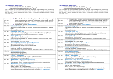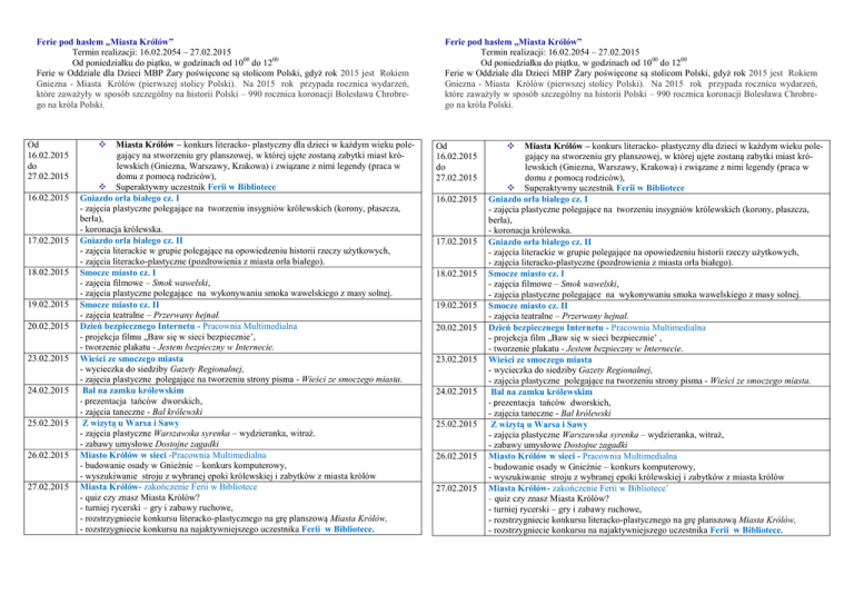 Ferie pod hasłem „Miasta Królów” Termin realizacji: 16.02.2054 – 27.02.2015 Od poniedziałku do piątku, w godzinach od 1000 do 1200 Ferie w Oddziale dla Dzieci MBP Żary poświęcone są stolicom Polski, gdyż rok 2015 jest Rokiem Gniezna - Miasta Królów (pierwszej stolicy Polski). Na 2015 rok przypada rocznica wydarzeń, które zaważyły w sposób szczególny na historii Polski – 990 rocznica koronacji Bolesława Chrobrego na króla Polski. Od 16.02.2015 do 27.02.2015 16.02.2015 17.02.2015 18.02.2015 19.02.2015 20.02.2015 23.02.2015 24.02.2015 25.02.2015 26.02.2015 27.02.2015 Miasta Królów – konkurs literacko- plastyczny dla dzieci w każdym wieku polegający na stworzeniu gry planszowej, w której ujęte zostaną zabytki miast królewskich (Gniezna, Warszawy, Krakowa) i związane z nimi legendy (praca w domu z pomocą rodziców), Superaktywny uczestnik Ferii w Bibliotece Gniazdo orła białego cz. I - zajęcia plastyczne polegające na tworzeniu insygniów królewskich (korony, płaszcza, berła), - koronacja królewska. Gniazdo orła białego cz. II - zajęcia literackie w grupie polegające na opowiedzeniu historii rzeczy użytkowych, - zajęcia literacko-plastyczne (pozdrowienia z miasta orła białego). Smocze miasto cz. I - zajęcia filmowe – Smok wawelski, - zajęcia plastyczne polegające na wykonywaniu smoka wawelskiego z masy solnej. Smocze miasto cz. II - zajęcia teatralne – Przerwany hejnał. Dzień bezpiecznego Internetu - Pracownia Multimedialna - projekcja filmu „Baw się w sieci bezpiecznie’, - tworzenie plakatu - Jestem bezpieczny w Internecie. Wieści ze smoczego miasta - wycieczka do siedziby Gazety Regionalnej, - zajęcia plastyczne polegające na tworzeniu strony pisma - Wieści ze smoczego miasta. Bal na zamku królewskim - prezentacja tańców dworskich, - zajęcia taneczne - Bal królewski Z wizytą u Warsa i Sawy - zajęcia plastyczne Warszawska syrenka – wydzieranka, witraż. - zabawy umysłowe Dostojne zagadki Miasto Królów w sieci -Pracownia Multimedialna - budowanie osady w Gnieźnie – konkurs komputerowy, - wyszukiwanie stroju z wybranej epoki królewskiej i zabytków z miasta królów Miasta Królów- zakończenie Ferii w Bibliotece - quiz czy znasz Miasta Królów? - turniej rycerski – gry i zabawy ruchowe, - rozstrzygniecie konkursu literacko-plastycznego na grę planszową Miasta Królów, - rozstrzygniecie konkursu na najaktywniejszego uczestnika Ferii w Bibliotece. Ferie pod hasłem „Miasta Królów” Termin realizacji: 16.02.2054 – 27.02.2015 Od poniedziałku do piątku, w godzinach od 1000 do 1200 Ferie w Oddziale dla Dzieci MBP Żary poświęcone są stolicom Polski, gdyż rok 2015 jest Rokiem Gniezna - Miasta Królów (pierwszej stolicy Polski). Na 2015 rok przypada rocznica wydarzeń, które zaważyły w sposób szczególny na historii Polski – 990 rocznica koronacji Bolesława Chrobrego na króla Polski. Od 16.02.2015 do 27.02.2015 16.02.2015 17.02.2015 18.02.2015 19.02.2015 20.02.2015 23.02.2015 24.02.2015 25.02.2015 26.02.2015 27.02.2015 Miasta Królów – konkurs literacko- plastyczny dla dzieci w każdym wieku polegający na stworzeniu gry planszowej, w której ujęte zostaną zabytki miast królewskich (Gniezna, Warszawy, Krakowa) i związane z nimi legendy (praca w domu z pomocą rodziców), Superaktywny uczestnik Ferii w Bibliotece Gniazdo orła białego cz. I - zajęcia plastyczne polegające na tworzeniu insygniów królewskich (korony, płaszcza, berła), - koronacja królewska. Gniazdo orła białego cz. II - zajęcia literackie w grupie polegające na opowiedzeniu historii rzeczy użytkowych, - zajęcia literacko-plastyczne (pozdrowienia z miasta orła białego). Smocze miasto cz. I - zajęcia filmowe – Smok wawelski, - zajęcia plastyczne polegające na wykonywaniu smoka wawelskiego z masy solnej. Smocze miasto cz. II - zajęcia teatralne – Przerwany hejnał. Dzień bezpiecznego Internetu - Pracownia Multimedialna - projekcja film „Baw się w sieci bezpiecznie’ , - tworzenie plakatu - Jestem bezpieczny w Internecie. Wieści ze smoczego miasta - wycieczka do siedziby Gazety Regionalnej, - zajęcia plastyczne polegające na tworzeniu strony pisma - Wieści ze smoczego miasta. Bal na zamku królewskim - prezentacja tańców dworskich, - zajęcia taneczne - Bal królewski Z wizytą u Warsa i Sawy - zajęcia plastyczne Warszawska syrenka – wydzieranka, witraż, - zabawy umysłowe Dostojne zagadki Miasto Królów w sieci - Pracownia Multimedialna - budowanie osady w Gnieźnie – konkurs komputerowy, - wyszukiwanie stroju z wybranej epoki królewskiej i zabytków z miasta królów Miasta Królów- zakończenie Ferii w Bibliotece’ - quiz czy znasz Miasta Królów? - turniej rycerski – gry i zabawy ruchowe, - rozstrzygniecie konkursu literacko-plastycznego na grę planszową Miasta Królów, - rozstrzygniecie konkursu na najaktywniejszego uczestnika Ferii w Bibliotece.