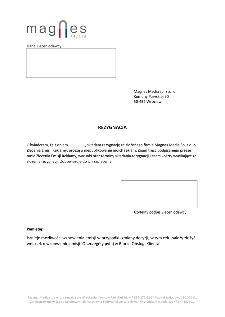 Dane Zleceniodawcy: Magnes Media sp. z .o. o. Komuny Paryskiej 90 50-452 Wrocław REZYGNACJA Oświadczam, że z dniem………………, składam rezygnację ze złożonego firmie Magnes Media Sp. z o. o. Zlecenia Emisji Reklamy, proszę o niepublikowanie moich reklam. Znam treść podpisanego przeze mnie Zlecenia Emisji Reklamy, warunki oraz terminy składania rezygnacji i znam koszty wynikające ze złożenia rezygnacji. Zobowiązuję do ich zapłacenia. Czytelny podpis Zleceniodawcy Pamiętaj: Istnieje możliwości wznowienia emisji w przypadku zmiany decyzji, w tym celu należy złożyć wniosek o wznowienie emisji. O szczegóły pytaj w Biurze Obsługi Klienta. Magnes Media sp. z o. o. z siedzibą we Wrocławiu, Komuny Paryskiej 90, NIP 899-271-91-34 Kapitał zakładowy 150.000 zł., Zarejestrowana w Sądzie Rejonowym dla Wrocławia-Fabrycznej we Wrocławiu, VI Wydział Gospodarczy KRS nr 387501,