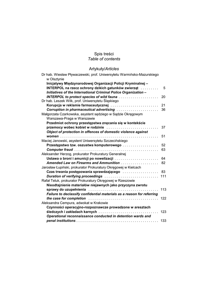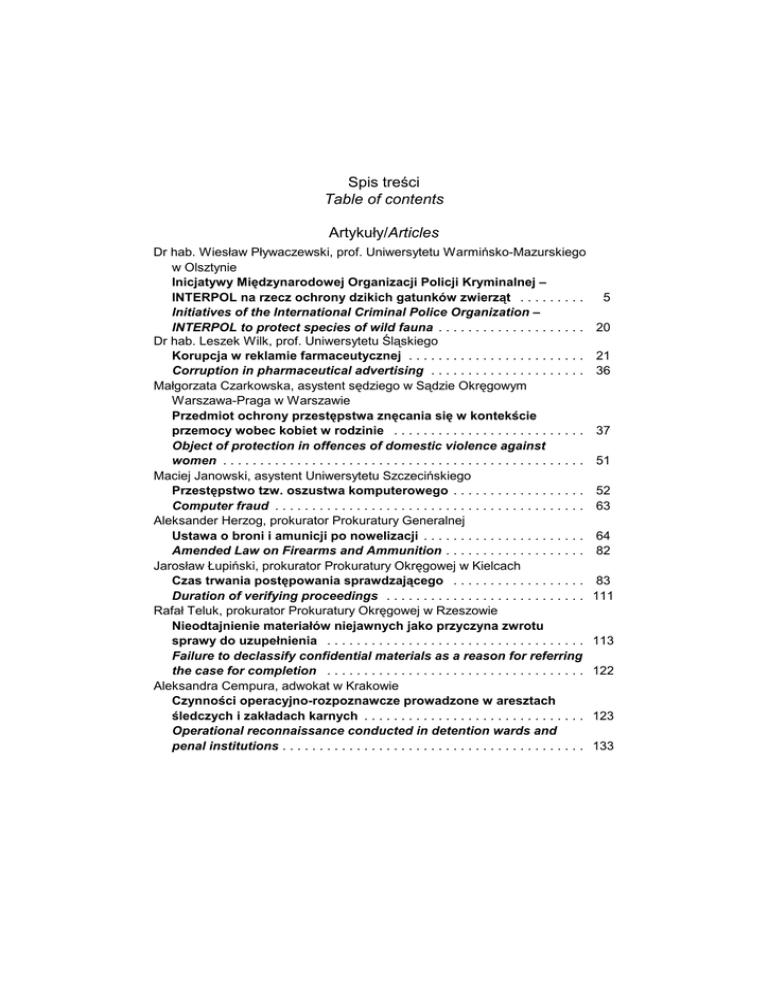 Spis treści Table of contents Artykuły/Articles Dr hab. Wiesław Pływaczewski, prof. Uniwersytetu Warmińsko-Mazurskiego w Olsztynie Inicjatywy Międzynarodowej Organizacji Policji Kryminalnej – INTERPOL na rzecz ochrony dzikich gatunków zwierząt . . . . . . . . . Initiatives of the International Criminal Police Organization – INTERPOL to protect species of wild fauna . . . . . . . . . . . . . . . . . . . . Dr hab. Leszek Wilk, prof. Uniwersytetu Śląskiego Korupcja w reklamie farmaceutycznej . . . . . . . . . . . . . . . . . . . . . . . . Corruption in pharmaceutical advertising . . . . . . . . . . . . . . . . . . . . . Małgorzata Czarkowska, asystent sędziego w Sądzie Okręgowym Warszawa-Praga w Warszawie Przedmiot ochrony przestępstwa znęcania się w kontekście przemocy wobec kobiet w rodzinie . . . . . . . . . . . . . . . . . . . . . . . . . . Object of protection in offences of domestic violence against women . . . . . . . . . . . . . . . . . . . . . . . . . . . . . . . . . . . . . . . . . . . . . . . . . Maciej Janowski, asystent Uniwersytetu Szczecińskiego Przestępstwo tzw. oszustwa komputerowego . . . . . . . . . . . . . . . . . . Computer fraud . . . . . . . . . . . . . . . . . . . . . . . . . . . . . . . . . . . . . . . . . . Aleksander Herzog, prokurator Prokuratury Generalnej Ustawa o broni i amunicji po nowelizacji . . . . . . . . . . . . . . . . . . . . . . Amended Law on Firearms and Ammunition . . . . . . . . . . . . . . . . . . . Jarosław Łupiński, prokurator Prokuratury Okręgowej w Kielcach Czas trwania postępowania sprawdzającego . . . . . . . . . . . . . . . . . . Duration of verifying proceedings . . . . . . . . . . . . . . . . . . . . . . . . . . . Rafał Teluk, prokurator Prokuratury Okręgowej w Rzeszowie Nieodtajnienie materiałów niejawnych jako przyczyna zwrotu sprawy do uzupełnienia . . . . . . . . . . . . . . . . . . . . . . . . . . . . . . . . . . . Failure to declassify confidential materials as a reason for referring the case for completion . . . . . . . . . . . . . . . . . . . . . . . . . . . . . . . . . . . Aleksandra Cempura, adwokat w Krakowie Czynności operacyjno-rozpoznawcze prowadzone w aresztach śledczych i zakładach karnych . . . . . . . . . . . . . . . . . . . . . . . . . . . . . . Operational reconnaissance conducted in detention wards and penal institutions . . . . . . . . . . . . . . . . . . . . . . . . . . . . . . . . . . . . . . . . . 5 20 21 36 37 51 52 63 64 82 83 111 113 122 123 133 Materiały szkoleniowe/Training materials Filip Radoniewicz, doktorant UMCS w Lublinie Przestępstwo handlu ludźmi . . . . . . . . . . . . . . . . . . . . . . . . . . . . . . . . 134 Human trafficking. . . . . . . . . . . . . . . . . . . . . . . . . . . . . . . . . . . . . . . . . 155 Recenzje/Reviews monografii Mariusza Korpalskiego, Bankowe umowy przedsiębiorców, Warszawa 2010 – oprac. Tomasz Radtke . . . . . . . . . . . . . . . . . . . . . . . 156 of mongograph by Mariusz Korpalski, Entrepreneurs’ bank agreements, Warsaw 2010 – by Tomasz Radtke . . . . . . . . . . . . . . . . 156 Glosy/Commentaries do uchwały Sądu NajwyŜszego z dnia 24 listopada 2010 r., sygn. I KZP 20/10 (dot. uchylenia postanowienia o przedłuŜeniu tymczasowego aresztowania) – oprac. Amadeusz Małolepszy . . . . . . . . . . . . . . . . . . . to the Supreme Court resolution of 24 November 2010, file no. I KZP 20/10 (concerns revoking a decision on prolongation of pre-trial detention) . . . . . . . . . . . . . . . . . . . . . . . . . . . . . . . . . . . . . . . . do wyroku Sądu NajwyŜszego z dnia 5 stycznia 2011 r., sygn. V KK 64/10 (dot. istoty czynu ciągłego) – oprac. dr Sławomir śółtek . . . . . . . . . . . to the Supreme Court judgment of 5 January, file no. V KK 64/10 (concerns merits of a continuing offence) . . . . . . . . . . . . . . . . . . . . . 166 175 176 182 Sprawozdania i informacje/Report and information VII Seminarium Kryminalistyczne nt. „Szara strefa gospodarcza – nowe wyzwanie dla nauk sądowych” (Jesionka, 9–11 maja 2011 r.) – oprac. Cezary Kąkol . . . . . . . . . . . . . . . . . . . . . . . . . . . . . . . . . . . . . . . . 183 7th Criminal Law Seminar entitled: “Grey economy – new challenges for forensic sciences” . . . . . . . . . . . . . . . . . . . . . . . . . . . . . . . . . . . . . 183 Co warto przeczytać/Reading matter Omówienie ksiąŜki pt. „Moralność i władza jako kategorie myśli politycznej”, pod redakcją Janusza Justyńskiego i Andrzeja Madei, Warszawa 2011 – oprac. dr Wincenty Grzeszczyk . . . . . . . . . . . . . . . . 193 Discussion on the book by Janusz Justyński & Andrzej Madeja, eds, “Morality and Power as Political Thought Categories”, Warsaw 2011 – by Wincenty Grzeszczyk, PhD . . . . . . . . . . . . . . . . . . 193