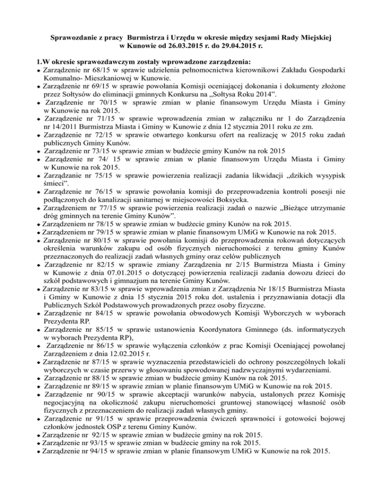 Sprawozdanie z pracy Burmistrza i Urzędu w okresie między sesjami Rady Miejskiej w Kunowie od 26.03.2015 r. do 29.04.2015 r. 1.W okresie sprawozdawczym zostały wprowadzone zarządzenia: Zarządzenie nr 68/15 w sprawie udzielenia pełnomocnictwa kierownikowi Zakładu Gospodarki Komunalno- Mieszkaniowej w Kunowie. Zarządzenie nr 69/15 w sprawie powołania Komisji oceniającej dokonania i dokumenty złożone przez Sołtysów do eliminacji gminnych Konkursu na „Sołtysa Roku 2014”. Zarządzenie nr 70/15 w sprawie zmian w planie finansowym Urzędu Miasta i Gminy w Kunowie na rok 2015. Zarządzenie nr 71/15 w sprawie wprowadzenia zmian w załączniku nr 1 do Zarządzenia nr 14/2011 Burmistrza Miasta i Gminy w Kunowie z dnia 12 stycznia 2011 roku ze zm. Zarządzenie nr 72/15 w sprawie otwartego konkursu ofert na realizację w 2015 roku zadań publicznych Gminy Kunów. Zarządzenie nr 73/15 w sprawie zmian w budżecie gminy Kunów na rok 2015 Zarządzenie nr 74/ 15 w sprawie zmian w planie finansowym Urzędu Miasta i Gminy w Kunowie na rok 2015. Zarządzanie nr 75/15 w sprawie powierzenia realizacji zadania likwidacji „dzikich wysypisk śmieci”. Zarządzenie nr 76/15 w sprawie powołania komisji do przeprowadzenia kontroli posesji nie podłączonych do kanalizacji sanitarnej w miejscowości Boksycka. Zarządzeniem nr 77/15 w sprawie powierzenia realizacji zadań o nazwie „Bieżące utrzymanie dróg gminnych na terenie Gminy Kunów”. Zarządzeniem nr 78/15 w sprawie zmian w budżecie gminy Kunów na rok 2015. Zarządzeniem nr 79/15 w sprawie zmian w planie finansowym UMiG w Kunowie na rok 2015. Zarządzenie nr 80/15 w sprawie powołania komisji do przeprowadzenia rokowań dotyczących określenia warunków zakupu od osób fizycznych nieruchomości z terenu gminy Kunów przeznaczonych do realizacji zadań własnych gminy oraz celów publicznych Zarządzenie nr 82/15 w sprawie zmiany Zarządzenia nr 2/15 Burmistrza Miasta i Gminy w Kunowie z dnia 07.01.2015 o dotyczącej powierzenia realizacji zadania dowozu dzieci do szkół podstawowych i gimnazjum na terenie Gminy Kunów. Zarządzenie nr 83/15 w sprawie wprowadzenia zmian z Zarządzenia Nr 18/15 Burmistrza Miasta i Gminy w Kunowie z dnia 15 stycznia 2015 roku dot. ustalenia i przyznawiania dotacji dla Publicznych Szkół Podstawowych prowadzonych przez osoby fizyczne. Zarządzenie nr 84/15 w sprawie powołania obwodowych Komisji Wyborczych w wyborach Prezydenta RP. Zarządzenie nr 85/15 w sprawie ustanowienia Koordynatora Gminnego (ds. informatyczych w wyborach Prezydenta RP), Zarządzenie nr 86/15 w sprawie wyłączenia członków z prac Komisji Oceniającej powołanej Zarządzeniem z dnia 12.02.2015 r. Zarządzenie nr 87/15 w sprawie wyznaczenia przedstawicieli do ochrony poszczególnych lokali wyborczych w czasie przerwy w głosowaniu spowodowanej nadzwyczajnymi wydarzeniami. Zarządzenie nr 88/15 w sprawie zmian w budżecie gminy Kunów na rok 2015. Zarządzenie nr 89/15 w sprawie zmian w planie finansowym UMiG w Kunowie na rok 2015. Zarządzenie nr 90/15 w sprawie akceptacji warunków nabycia, ustalonych przez Komisję negocjacyjną na okoliczność zakupu nieruchomości gruntowej stanowiącej własność osób fizycznych z przeznaczeniem do realizacji zadań własnych gminy. Zarządzenie nr 91/15 w sprawie przeprowadzenia ćwiczeń sprawności i gotowości bojowej członków jednostek OSP z terenu Gminy Kunów. Zarządzenie nr 92/15 w sprawie zmian w budżecie gminy na rok 2015. Zarządzenie nr 93/15 w sprawie zmian w budżecie gminy na rok 2015. Zarządzenie nr 94/15 w sprawie zmian w planie finansowym UMiG w Kunowie na rok 2015. Zarządzenie nr 95/15 w sprawie powołania Komisji Stypendialnej i ustalenia jej zadań i trybu pracy. Zarządzenie 96/15 w sprawie wyboru podmiotów, które uzyskują dotacje na realizacje zadań publicznych oraz wysokości tej dotacji. 2. Działania organizacyjne dot. pracy urzędu: Przygotowanie statutu wraz z załącznikami przyszłej Młodzieżowej Rady Miejskiej w Kunowie. Przygotowanie miesięcznego sprawozdania z działalności e-Centrum dla Fundacji Aktywizacja w Łodzi w ramach projektu: ,,Wsparcie środowiska osób niepełnoprawnych terenów wiejskich i małomiasteczkowych“, współfinansowanego ze środków Unii Europejskiej w ramach Europejskiego Funduszu Społecznego. 3. Ważne dla mieszkańców: 27.03.2015 r. Urząd Miasta i Gminy w Kunowie - spotkanie informacyjne dotyczące utworzenia Młodzieżowej Rady Miejskiej w Kunowie, 28 marca 2015 r. - wyjazd rolników na XXI Międzynarodowe Targi Techniki Rolniczej „AGROTECH” w Kielcach, 29 marca 2015 r. w Ostrowcu Św. - udział mieszkańców gminy Kunów w Kiermaszu Tradycji Wielkanocnych zorganizowanym przez Starostę Ostrowieckiego w Ostrowcu Św., 30.03.2015 r. Bałtów - pierwsze spotkanie dotyczące wypracowania Lokalnej Strategii Rozwoju na lata 2014-2020 dla LGD „Krzemienny Krąg”, 8, 10, 15, 17, 22 i 24.04.2015 r. kurs komputerowy podstawy w ramach projektu: ,,Sieć szerokopasmowa Polski Wschodniej – województwo świętokrzyskie, 8, 9.04.2015 r. Toporzysko - szkolenie pt: ,,Młodzieżowe Rady – edukacja obywatelska w praktyce” dla liderów zainteresowanych włączeniem się w działanie Młodzieżowych Rad (dwóch uczestników z Gimnazjum w Kunowie), 9.04.2015 r. uczestnictwo Klubu Kobiet Kreatywnych wraz z przedstawicielami Koła Gospodyń Wiejskich z Chocimowa, z Bukowia w VII Międzynarodowych Targach Turystki Agroturystyki AGROTRAVEL w Kielcach (Panie wzięły udział w konferencji ,,Świętokrzyska Kuźnia Smaków” podsumowującej osiągnięcia projektu o tej nazwie. Warto zaznaczyć że w wydanej publikacji pt:,,Potrawy tradycyjne z regionu Gór Świętokrzyskich” znalazły się przepisy pań z naszej gminy), 14.04.2015 r. - spotkanie grup wsparcia dla osób niepełnosprawnych w e-Centrum w ramach projektu: ,,Wsparcie środowiska osób niepełnoprawnych terenów wiejskich i małomiasteczkowych, współ