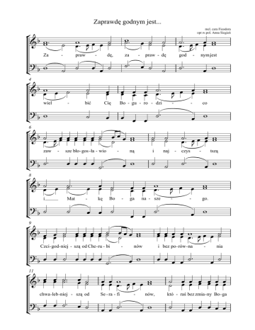 Zaprawdę godnym jest... Za - praw - dę, za - mel. cara Fieodora opr.w.pol. Anna Siegień praw - dę god - nym jest 4 wiel bić Cię Bo - gu - ro - dzi - 6 zaw - sze bło - gos - ła - wio - - i naj - co ną - czys - tszą 8 i Bo Mat - 9 kę - 11 chwa -leb -niej - szą od - nów go. i bez po - rów - na - - Se - ra - fi - na - sze Czci - god - niej - szą od Che - ru - bi ga nów, - nia któ - raś bez zmia - ny Bo - ga 2 14 Sło - wo zro - dzi - ła Cie - bie praw - dzi 16 Bo - gu - ro - dzi - - - cę 17 wys - ła - wia - - my wys - ła - wia - my. - wą