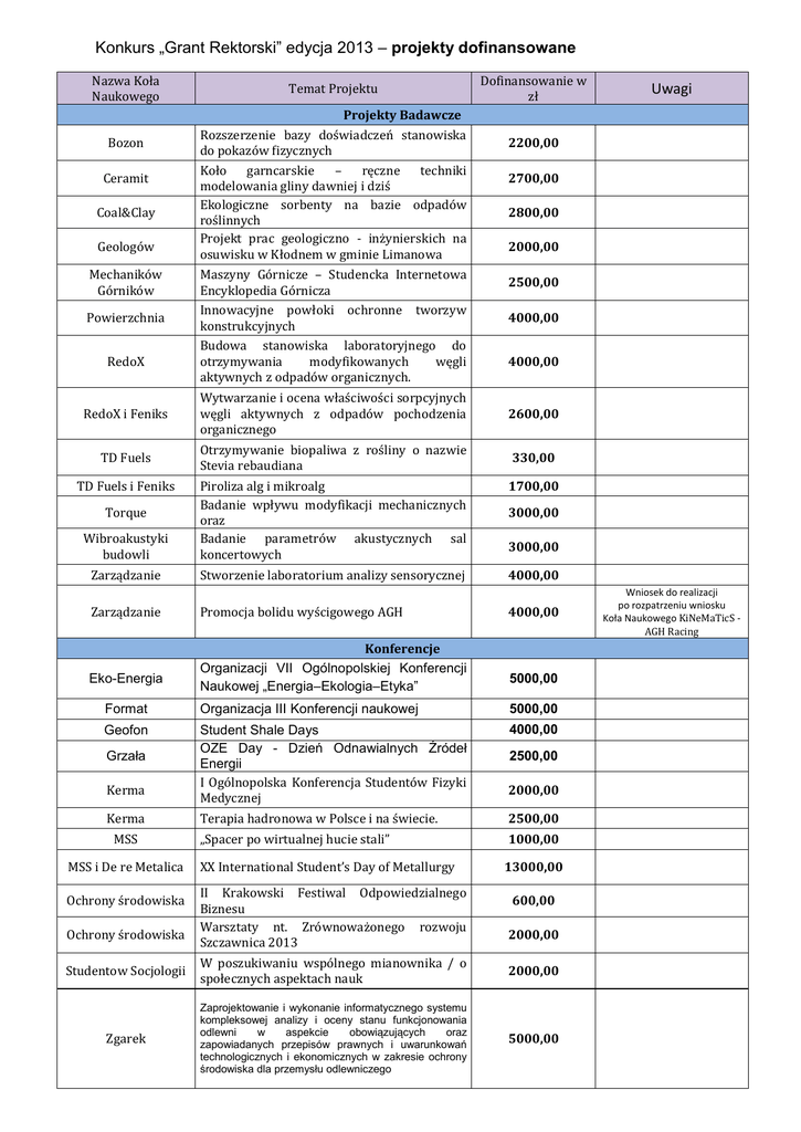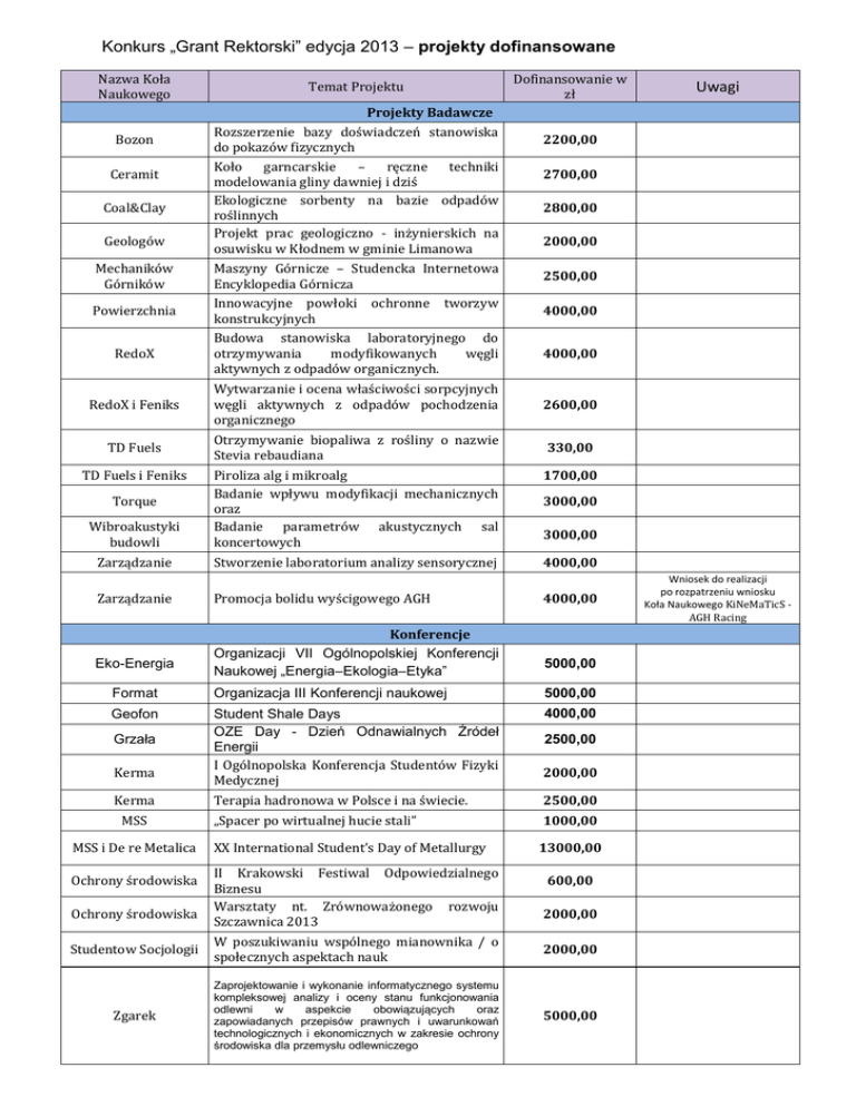 Konkurs „Grant Rektorski” edycja 2013 – projekty dofinansowane Nazwa Koła Naukowego Bozon Ceramit Coal&Clay Geologów Mechaników Górników Powierzchnia RedoX Temat Projektu Projekty Badawcze Rozszerzenie bazy doświadczeń stanowiska do pokazów fizycznych Koło garncarskie – ręczne techniki modelowania gliny dawniej i dziś Ekologiczne sorbenty na bazie odpadów roślinnych Projekt prac geologiczno - inżynierskich na osuwisku w Kłodnem w gminie Limanowa Maszyny Górnicze – Studencka Internetowa Encyklopedia Górnicza Innowacyjne powłoki ochronne tworzyw konstrukcyjnych Budowa stanowiska laboratoryjnego do otrzymywania modyfikowanych węgli aktywnych z odpadów organicznych. Dofinansowanie w zł 2200,00 2700,00 2800,00 2000,00 2500,00 4000,00 4000,00 RedoX i Feniks Wytwarzanie i ocena właściwości sorpcyjnych węgli aktywnych z odpadów pochodzenia organicznego 2600,00 TD Fuels Otrzymywanie biopaliwa z rośliny o nazwie Stevia rebaudiana 330,00 TD Fuels i Feniks 1700,00 Wibroakustyki budowli Piroliza alg i mikroalg Badanie wpływu modyfikacji mechanicznych oraz Badanie parametrów akustycznych sal koncertowych Zarządzanie Stworzenie laboratorium analizy sensorycznej 4000,00 Torque Zarządzanie Eko-Energia Promocja bolidu wyścigowego AGH Konferencje Organizacji VII Ogólnopolskiej Konferencji Naukowej „Energia–Ekologia–Etyka” 3000,00 3000,00 4000,00 5000,00 Format Organizacja III Konferencji naukowej 5000,00 Geofon Student Shale Days OZE Day - Dzień Odnawialnych Źródeł Energii I Ogólnopolska Konferencja Studentów Fizyki Medycznej 4000,00 Grzała Kerma Kerma MSS MSS i De re Metalica Ochrony środowiska Ochrony środowiska 2500,00 2000,00 Terapia hadronowa w Polsce i na świecie. 2500,00 „Spacer po wirtualnej hucie stali” 1000,00 XX International Student’s Day of Metallurgy II Krakowski Festiwal Odpowiedzialnego Biznesu Warsztaty nt. Zrównoważonego rozwoju Szczawnica 2013 Uwagi 13000,00 600,00 2000,00 Studentow Socjologii W poszukiwaniu wspólnego mianownika / o społecznych aspektach nauk 2000,00 Zgarek Zaprojektowanie i wykonanie informatycznego systemu kompleksowej analizy i oceny stanu funkcjonowania odlewni w aspekcie obowiązujących oraz zapowiadanych przepisów prawnych i uwarunkowań technologicznych i ekonomicznych w zakresie ochrony środowiska dla przemysłu odlewniczego 5000,00 Wniosek do realizacji po rozpatrzeniu wniosku Koła Naukowego KiNeMaTicS AGH Racing Projekty Konstrukcyjno - Badawcze Automatyków i Robotyków Focus Biometr Bozon Controllers De Re Metallica Eko-Energia Energon Geologów Grzała i Nucleus Ignis Ignis Implant Implant Kiwon Kiwon i Geowiert Kliwent Mechaników Górników MetalSoft Piorun Piorun i KN Wibroakustyki Budowli SKIP SKIP Autonomiczny Robot Rozpoznawczy 1600,00 Opracowanie prototypu lokalizatora 3D dla potrzeb nawigacji medycznej 5 fundamentalnych stałych fizycznych Inspekcyjny robot ułatwiający serwisowanie i lokalizację usterek turbin elektrowni wiatrowych. Stanowisko do pomiaru i sterowania temperaturą topienia w piecu indukcyjnym Zbiornik buforowy wykorzystujący ogrzewanie fazowe Interaktywna gablota informacyjnopomiarowa. Wyznaczenie obszarów perspektywicznych do poboru wody pitnej dla sołectw Kłodne i Męcina w gminie Limanowa Generator energii elektrycznej wykorzystujący źródła odnawialne Badanie mechanizmów wymiany ciepła w chłodziarce termoakustycznej. Wytwarzanie modeli łopatek wirnikowych metodami szybkiego prototypowania. Materac do pomiaru i analizy rytmu serca 5000,00 3100,00 4000,00 2800,00 3200,00 1600,00 1500,00 3600,00 1800,00 2000,00 3300,00 Elektroniczna nakładka na okulary Badania środowiska występowania węglowodorów na Szlaku Naftowym pomiędzy Krosnem a granicą Państwa Badania i analiza próbek ropy naftowej i gazu glebowego pod katem zawartości węglowodorów oraz wykonanie projektu rekonstrukcji i likwidacji otworów wiertniczych na złożu Polana Budowa prototypowego układu grzejąco chłodzącego w oparciu o panele fotowoltaiczne Kabinowe, mobilne stanowisko symulatora maszyn górniczych 1400,00 RehabKinect 1200,00 Drabina Jakubowa 800,00 Impulsowe źródło modelowych dźwięku do badań Sterowanie komputerem za pomocą fal mózgowych Autonomiczny robot mobilny realizujący funkcje ochrony i dozoru obiektu 4000,00 4500,00 3800,00 2400,00 3200,00 2800,00 1500,00 KiNeMaTicS Drukarka 3D – Badanie nowych możliwości druku wielkogabarytowego 3D 0,00 Wniosek nie spełnia wymogów formalnych. KiNeMaTicS AGH Racing – Udział w Międzynarodowych zawodach FORMULA STUDENT 0,00 Wniosek przekazany do dalszego rozpatrzenia przez JM Rektora.