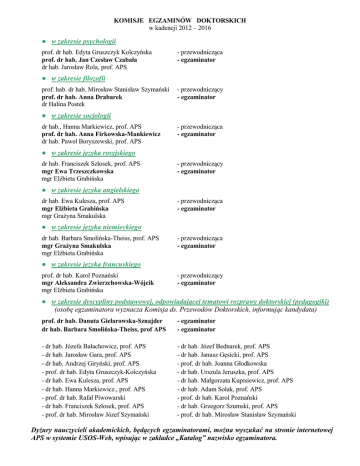KOMISJE EGZAMINÓW DOKTORSKICH w kadencji 2012 – 2016 ● w zakresie psychologii prof. dr hab. Edyta Gruszczyk Kolczyńska prof. dr hab. Jan Czesław Czabała dr hab. Jarosław Rola, prof. APS - przewodnicząca - egzaminator ● w zakresie filozofii prof. hab. dr hab. Mirosław Stanisław Szymański prof. dr hab. Anna Drabarek dr Halina Postek - przewodniczący - egzaminator ● w zakresie socjologii dr hab., Hanna Markiewicz, prof. APS prof. dr hab. Anna Firkowska-Mankiewicz dr hab. Paweł Boryszewski, prof. APS - przewodnicząca - egzaminator ● w zakresie języka rosyjskiego dr hab. Franciszek Szlosek, prof. APS mgr Ewa Trzeszczkowska mgr Elżbieta Grabińska - przewodniczący - egzaminator ● w zakresie języka angielskiego dr hab. Ewa Kulesza, prof. APS mgr Elżbieta Grabińska mgr Grażyna Smakulska - przewodnicząca - egzaminator ● w zakresie języka niemieckiego dr hab. Barbara Smolińska-Theiss, prof. APS mgr Grażyna Smakulska mgr Elżbieta Grabińska - przewodnicząca - egzaminator ● w zakresie języka francuskiego prof. dr hab. Karol Poznański mgr Aleksandra Zwierzchowska-Wójcik mgr Elżbieta Grabińska - przewodniczący - egzaminator ● w zakresie dyscypliny podstawowej, odpowiadającej tematowi rozprawy doktorskiej (pedagogiki) (osobę egzaminatora wyznacza Komisja ds. Przewodów Doktorskich, informując kandydata) prof. dr hab. Danuta Gielarowska-Sznajder dr hab. Barbara Smolińska-Theiss, prof APS - egzaminator - egzaminator - dr hab. Józefa Bałachowicz, prof. APS - dr hab. Jarosław Gara, prof. APS - dr hab. Andrzej Giryński, prof. APS - prof. dr hab. Edyta Gruszczyk-Kolczyńska - dr hab. Ewa Kulesza, prof. APS - dr hab. Hanna Markiewicz., prof. APS - prof. dr hab. Rafał Piwowarski - dr hab. Franciszek Szlosek, prof. APS - prof. dr hab. Mirosław Józef Szymański - dr hab. Józef Bednarek, prof. APS - dr hab. Janusz Gęsicki, prof. APS - prof. dr hab. Joanna Głodkowska - dr hab. Urszula Jeruszka, prof. APS - dr hab. Małgorzata Kupisiewicz, prof. APS - dr hab. Adam Solak, prof. APS - prof. dr hab. Karol Poznański - dr hab. Grzegorz Szumski, prof. APS - prof. dr hab. Mirosław Stanisław Szymański Dyżury nauczycieli akademickich, będących egzaminatorami, można wyszukać na stronie internetowej APS w systemie USOS-Web, wpisując w zakładce „Katalog” nazwisko egzaminatora.