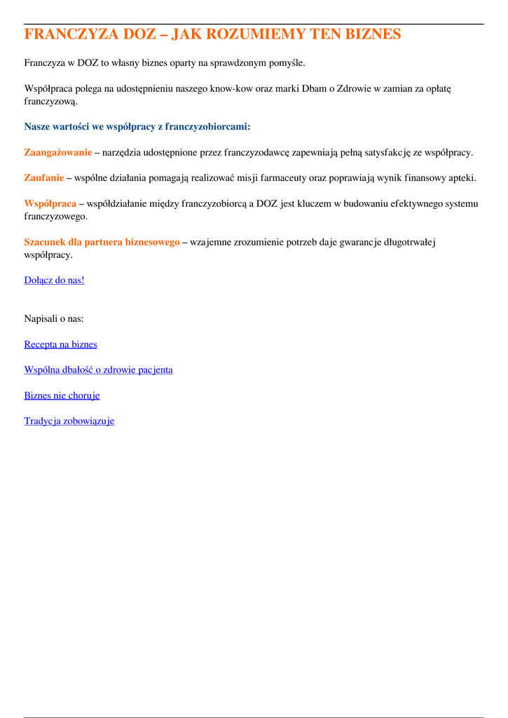 FRANCZYZA DOZ – JAK ROZUMIEMY TEN BIZNES Franczyza w DOZ to własny biznes oparty na sprawdzonym pomyśle. Współpraca polega na udostępnieniu naszego know-kow oraz marki Dbam o Zdrowie w zamian za opłatę franczyzową. Nasze wartości we współpracy z franczyzobiorcami: Zaangażowanie – narzędzia udostępnione przez franczyzodawcę zapewniają pełną satysfakcję ze współpracy. Zaufanie – wspólne działania pomagają realizować misji farmaceuty oraz poprawiają wynik finansowy apteki. Współpraca – współdziałanie między franczyzobiorcą a DOZ jest kluczem w budowaniu efektywnego systemu franczyzowego. Szacunek dla partnera biznesowego – wzajemne zrozumienie potrzeb daje gwarancje długotrwałej współpracy. Dołącz do nas! Napisali o nas: Recepta na biznes Wspólna dbałość o zdrowie pacjenta Biznes nie choruje Tradycja zobowiązuje Powered by TCPDF (www.tcpdf.org)
