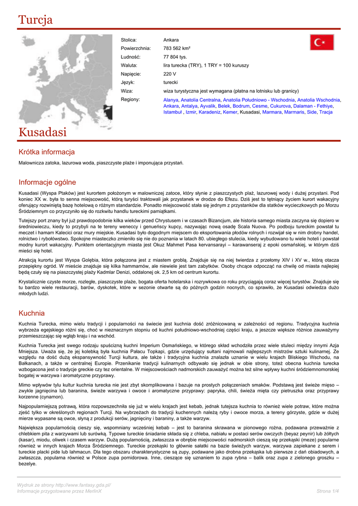 Turcja Stolica: Ankara Powierzchnia: 783 562 km² Ludność: 77 804 tys. Waluta: lira turecka (TRY), 1 TRY = 100 kuruszy Napięcie: 220 V Język: turecki Wiza: wiza turystyczna jest wymagana (płatna na lotnisku lub granicy) Regiony: Alanya, Anatolia Centralna, Anatolia Południowo - Wschodnia, Anatolia Wschodnia, Ankara, Antalya, Ayvalik, Belek, Bodrum, Cesme, Cukurova, Dalaman - Fethiye, Istambuł , Izmir, Karadeniz, Kemer, Kusadasi, Marmara, Marmaris, Side, Tracja Kusadasi Krótka informacja Malownicza zatoka, lazurowa woda, piaszczyste plaże i imponująca przystań. Informacje ogólne Kusadasi (Wyspa Ptaków) jest kurortem położonym w malowniczej zatoce, który słynie z piaszczystych plaż, lazurowej wody i dużej przystani. Pod koniec XX w. była to senna miejscowość, którą turyści traktowali jak przystanek w drodze do Efezu. Dziś jest to tętniący życiem kurort wakacyjny oferujący rozwiniętą bazę hotelową o różnym standardzie. Ponadto miejscowość stała się jednym z przystanków dla statków wycieczkowych po Morzu Śródziemnym co przyczyniło się do rozkwitu handlu tureckimi pamiątkami. Tutejszy port znany był już prawdopodobnie kilka wieków przed Chrystusem i w czasach Bizancjum, ale historia samego miasta zaczyna się dopiero w średniowieczu, kiedy to przybyli na te tereny weneccy i genueńscy kupcy, nazywając nową osadę Scala Nuova. Po podboju tureckim powstał tu meczet i hamam Kalecici oraz mury miejskie. Kusadasi było dogodnym miejscem do eksportowania płodów rolnych i rozwijał się w nim drobny handel, rolnictwo i rybołówstwo. Spokojne miasteczko zmieniło się nie do poznania w latach 80. ubiegłego stulecia, kiedy wybudowano tu wiele hoteli i powstał modny kurort wakacyjny. Punktem orientacyjnym miasta jest Okuz Mahmet Pasa kervansarayi – karawanseraj z epoki osmańskiej, w którym dziś mieści się hotel. Atrakcją kurortu jest Wyspa Golębia, która połączona jest z miastem groblą. Znajduje się na niej twierdza z przełomy XIV i XV w., którą otacza przepiękny ogród. W mieście znajduje się kilka hammamów, ale niewiele jest tam zabytków. Osoby chcące odpocząć na chwilę od miasta najlepiej będą czuły się na piaszczystej plaży Kadmlar Denizi, oddalonej ok. 2,5 km od centrum kurortu. Krystalicznie czyste morze, rozległe, piaszczyste plaże, bogata oferta hotelarska i rozrywkowa co roku przyciągają coraz więcej turystów. Znajduje się tu bardzo wiele restauracji, barów, dyskotek, które w sezonie otwarte są do późnych godzin nocnych, co sprawiło, że Kusadasi odwiedza dużo młodych ludzi. Kuchnia Kuchnia Turecka, mimo wielu tradycji i popularności na świecie jest kuchnia dość zróżnicowaną w zależności od regionu. Tradycyjna kuchnia wybrzeża egejskiego różni się, choć w nieznacznym stopniu od kuchni południowo-wschodniej części kraju, a jeszcze większe różnice zauważymy przemieszczając się wgłąb kraju i na wschód. Kuchnia Turecka jest swego rodzaju spuścizną kuchni Imperium Osmańskiego, w którego skład wchodziła przez wiele stuleci między innymi Azja Mniejsza. Uważa się, że jej kolebką była kuchnia Pałacu Topkapi, gdzie urzędujący sułtani najmowali najlepszych mistrzów sztuki kulinarnej. Ze względu na dość dużą ekspansywność Turcji kultura, ale także i tradycyjna kuchnia znalazła uznanie w wielu krajach Bliskiego Wschodu, na Bałkanach, a także w centralnej Europie. Przenikanie tradycji kulinarnych odbywało się jednak w obie strony, toteż obecna kuchnia turecka wzbogacona jest o tradycje greckie czy tez orientalne. W miejscowościach nadmorskich zauważyć można też silne wpływy kuchni śródziemnomorskiej bogatej w warzywa i aromatyczne przyprawy. Mimo wpływów tylu kultur kuchnia turecka nie jest zbyt skomplikowana i bazuje na prostych połączeniach smaków. Podstawą jest świeże mięso – zwykle jagnięcina lub baranina, świeże warzywa i owoce i aromatyczne przyprawy: papryka, chili, świeża mięta czy pietruszka oraz przyprawy korzenne (cynamon). Najpopularniejszą potrawą, która rozpowszechniła się już w wielu krajach jest kebab, jednak tutejsza kuchnia to również wiele potraw, które można zjeść tylko w określonych regionach Turcji. Na wybrzeżach do tradycji kuchennych należą ryby i owoce morza, a tereny górzyste, gdzie w dużej mierze wypasane są owce, słyną z produkcji serów, jagnięciny i baraniny, a także warzyw. Największa popularnością cieszy się, wspomniany wcześniej kebab – jest to baranina skrawana w pionowego rożna, podawana przeważnie z chlebkiem pita z warzywami lub surówką. Typowe tureckie śniadanie składa się z chleba, nabiału w postaci serów owczych (beyaz peynir) lub żółtych (kasar), miodu, oliwek i czasem warzyw. Dużą popularnością, zwłaszcza w obrębie miejscowości nadmorskich cieszą się przekąski (meze) popularne również w innych krajach Morza Śródziemnego. Tureckie przekąski to głównie sałatki na bazie świeżych warzyw, warzywa zapiekane z serem i tureckie placki pide lub lahmacun. Dla tego obszaru charakterystyczne są zupy, podawane jako drobna przekąska lub pierwsze z dań obiadowych, a zwłaszcza, popularna również w Polsce zupa pomidorowa. Inne, cieszące się uznaniem to zupa rybna – balik oraz zupa z zielonego groszku – bezelye. Wydruk ze strony http://www.fantasy.gda.pl/ Informacje przygotowane przez MerlinX Strona 1/4 Główny posiłek obiadowy opiera się na mięsie, do którego podawany jest ryż i warzywa. Ciekawym połączeniem jest też ryż duszony z mięsem jagnięcym w rosole z dodatkiem cynamonu oraz pistacji. Innym daniem mięsnym, które króluje w kuchni tureckiej są pulpeciki Kofte, serwowane z warzywami i chlebkiem pita, ryżem lub ziemniakami. Mimo wielu różnorodnych dań mięsnych uznaniem cieszą się tez gulasze warzywne. Najważniejszym ich składnikiem jest bakłażan, który ma zastosowanie w sałatkach, marynuje się 