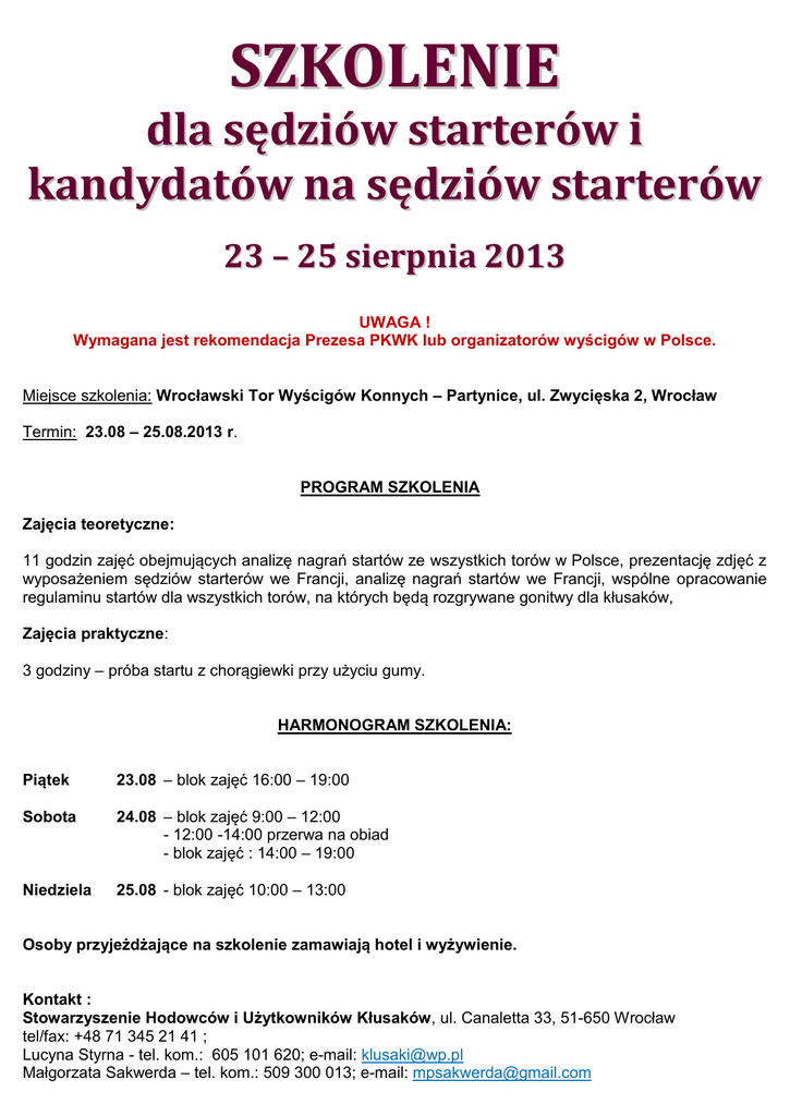 SZKOLENIE dla sędziów starterów i kandydatów na sędziów starterów 23 – 25 sierpnia 2013 UWAGA ! Wymagana jest rekomendacja Prezesa PKWK lub organizatorów wyścigów w Polsce. Miejsce szkolenia: Wrocławski Tor Wyścigów Konnych – Partynice, ul. Zwycięska 2, Wrocław Termin: 23.08 – 25.08.2013 r. PROGRAM SZKOLENIA Zajęcia teoretyczne: 11 godzin zajęć obejmujących analizę nagrań startów ze wszystkich torów w Polsce, prezentację zdjęć z wyposażeniem sędziów starterów we Francji, analizę nagrań startów we Francji, wspólne opracowanie regulaminu startów dla wszystkich torów, na których będą rozgrywane gonitwy dla kłusaków, Zajęcia praktyczne: 3 godziny – próba startu z chorągiewki przy użyciu gumy. HARMONOGRAM SZKOLENIA: Piątek 23.08 – blok zajęć 16:00 – 19:00 Sobota 24.08 – blok zajęć 9:00 – 12:00 - 12:00 -14:00 przerwa na obiad - blok zajęć : 14:00 – 19:00 Niedziela 25.08 - blok zajęć 10:00 – 13:00 Osoby przyjeżdżające na szkolenie zamawiają hotel i wyżywienie. Kontakt : Stowarzyszenie Hodowców i Użytkowników Kłusaków, ul. Canaletta 33, 51-650 Wrocław tel/fax: +48 71 345 21 41 ; Lucyna Styrna - tel. kom.: 605 101 620; e-mail: [email protected] Małgorzata Sakwerda – tel. kom.: 509 300 013; e-mail: [email protected]