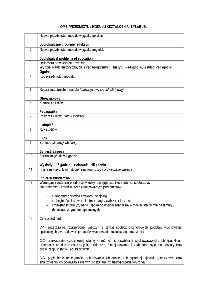 OPIS PRZEDMIOTU / MODUŁU KSZTAŁCENIA (SYLABUS) 1. Nazwa przedmiotu / modułu w języku polskim 2. Socjologiczne problemy edukacji Nazwa przedmiotu / modułu w języku angielskim 4. Sociological problems of education Jednostka prowadząca przedmiot Wydział Nauk Historycznych i Pedagogicznych, Instytut Pedagogiki, Zakład Pedagogiki Ogólnej Kod przedmiotu / modułu 5. Rodzaj przedmiotu / modułu (obowiązkowy lub fakultatywny) 6. Obowiązkowy Kierunek studiów 7. Pedagogika Poziom studiów (I lub II stopień) 8. II stopień Rok studiów 9. II rok Semestr (zimowy lub letni) 10. Semestr zimowy Forma zajęć i liczba godzin 11. Wykłady – 15 godzin, ćwiczenia - 15 godzin Imię, nazwisko, tytuł / stopień naukowy osoby prowadzącej zajęcia 3. 12. dr Rafał Włodarczyk Wymagania wstępne w zakresie wiedzy, umiejętności i kompetencji społecznych dla przedmiotu / modułu oraz zrealizowanych przedmiotów: − − − 13. elementarna wiedza z zakresu socjologii umiejętność obserwacji i interpretacji zjawisk społecznych umiejętność precyzyjnego i spójnego wypowiadania się w mowie i na piśmie na tematy dotyczące zagadnień społecznych Cele przedmiotu: C-1- przekazanie rozszerzonej wiedzy na temat społeczno-kulturowych podstaw wychowania, społecznych uwarunkowań procesów wychowania, uczenia się i nauczania C-2- przekazanie rozszerzonej wiedzy o różnych środowiskach wychowawczych, ich specyfice i procesach w nich zachodzących, strukturze, funkcjonowaniu i zadaniach systemu oświaty oraz organizacji i instytucji edukacyjnych C-3- pogłębienie umiejętności dokonywania obserwacji i interpretacji zjawisk społecznych oraz analizowania ich powiązań z różnymi obszarami działalności pedagogicznej C-4- pogłębienie umiejętności wykorzystywania podstawowej wiedzy teoretycznej z zakresu socjologii wychowania oraz pedagogiki w celu analizowania i interpretowania problemów edukacyjnych, wychowawczych, opiekuńczych, kulturalnych i pomocowych C-5 przygotowanie do aktywnego uczestnictwa w grupach, organizacjach i instytucjach społecznych 14. Zakładane efekty kształcenia: EK_01 ma rozszerzoną i uporządkowaną wiedzę na temat procesu edukacji i rządzących nim prawidłowościach, potrafi wyjaśnić mechanizmy socjalizacyjne i edukacyjne, potrafił przywołać rozszerzoną, uporządkowaną wiedzę o różnych środowiskach wychowawczych, ich specyfice i procesach w nich zachodzących EK_02 potrafi wykorzystać podstawową wiedzę teoretyczną z zakresu pedagogiki i powiązanych z nią dyscyplin w celu analizowania i interpretowania określonego rodzaju sytuacji edukacyjnych, potrafi dokonać analizy własnych działań i wskazać obszary wymagające modyfikacji w przyszłym działaniu, potrafi planować, organizować i realizować działania Symbole kierunkowych efektów kształcenia: K_W03, K_W06, K_U02, K_U10, K_U16, EK_03 jest przygotowany do aktywnego uczestnictwa w instytucjach K_K07 realizujących działania edukacyjne i zdolny do porozumiewania się ze wszystkimi uczestnikami procesu edukacji 15. Treści programowe: − 16. edukacja, praca i życie gospodarcze; edukacja formalna i nieformalna w różnych systemach społecznych i kulturach, − stratyfikacja i ruchliwość społeczna a kariera edukacyjna, − edukacja w kontekście nierówności społecznych, − środowiskowe zróżnicowanie szans edukacyjnych, − edukacja a płeć; przestrzenie edukacyjne, − kapitał kulturowy, społeczny i materialny a szanse edukacyjne, − ideologie edukacyjne i ideologie a edukacja; sfera publiczna i społeczny dyskurs o edukacji, − wychowanie a nowe media i technologie Literatura podstawowa: Giddens A., Socjologia, Warszawa 2004 Moore R., Socjologia edukacji, [w:] Pedagogika, tom 2, Pedagogika wobec edukacji, polityki oświatowej i badań naukowych, red. B.Śliwerski, Gdańsk 2006. Szymański M.J., Socjologia edukacji. Zarys problematyki, Kraków 2013 Woźniak R.B., Mikrosocjologia edukacji w zarysie, Toruń 2012 Szymański M.J., Studia i szkice z socjologii edukacji, Warszawa 2000. 17. Literatura uzupełniająca: Meighan R., Socjologia edukacji, Toruń 1993. Kołaczek B., Dostęp młodzieży do edukacji. Zróżnicowania. Uwarunkowania. Wyrównywanie szans, Warszawa 2004. Szacka B., Wprowadzenie do socjologii, Warszawa 2003, rozdz. IV. Forma zaliczenia poszczególnych komponentów przedmiotu / modułu, sposób sprawdzenia osiągnięcia zamierzonych efektów kształcenia: 1.Egzamin - ocena nabytej przez studenta wiedzy z zakresu socjologicznych problemów edukacji EK_01 (KW_03, KW_06) Kryteria oceny: -ocena bardzo dobra - student ma ugruntowaną wiedzę z zakresu socjologicznych problemów edukacji, wnikliwie analizuje, interpretuje i wnioskuje w zakresie problemów teorii i praktyki edukacyjnej związanej z zagadnieniami obowiązującymi w ramach przedmiotu. -ocena dobra - student ma wystarczającą wiedzę z zakresu socjologicznych problemów edukacji, która umożliwia mu analizowanie, interpretowanie i wnioskowanie w zakresie problemów teorii i praktyki edukacyjnej związanej z zagadnieniami obowiązującymi w ramach przedmiotu. -ocena dostateczna - student opanował jedynie podstawowy zakres wiedzy z zakresu socjologicznych problemów edukacji, poprawnie analizuje, interpretuje i wnioskuje w zakresie problemów teorii i praktyki społecznej związanej z zagadnieniami obowiązującymi w ramach przedmiotu. -ocena niedostateczna - student nie opanował wystarczającej wiedzy z zakresu współczesnych problemów socjologicznych, by poprawnie analizować, interpretować i wnioskować w zakresie problemów teorii i praktyki społecznej związanej z zagadnieniami obowiązującymi w ramach przedmiotu. Ocena pracy studenta przeprowadzona zostanie w oparciu o egzamin w formie pisemnej. 2.Ćwiczenia - ocena nabytej przez studenta wiedzy z zakresu socjologicznych problemów edukacji EK_01 (KW_03, KW_06) - ocena umiejętności wykorzystywania i integrowania wiedzy teoretycz