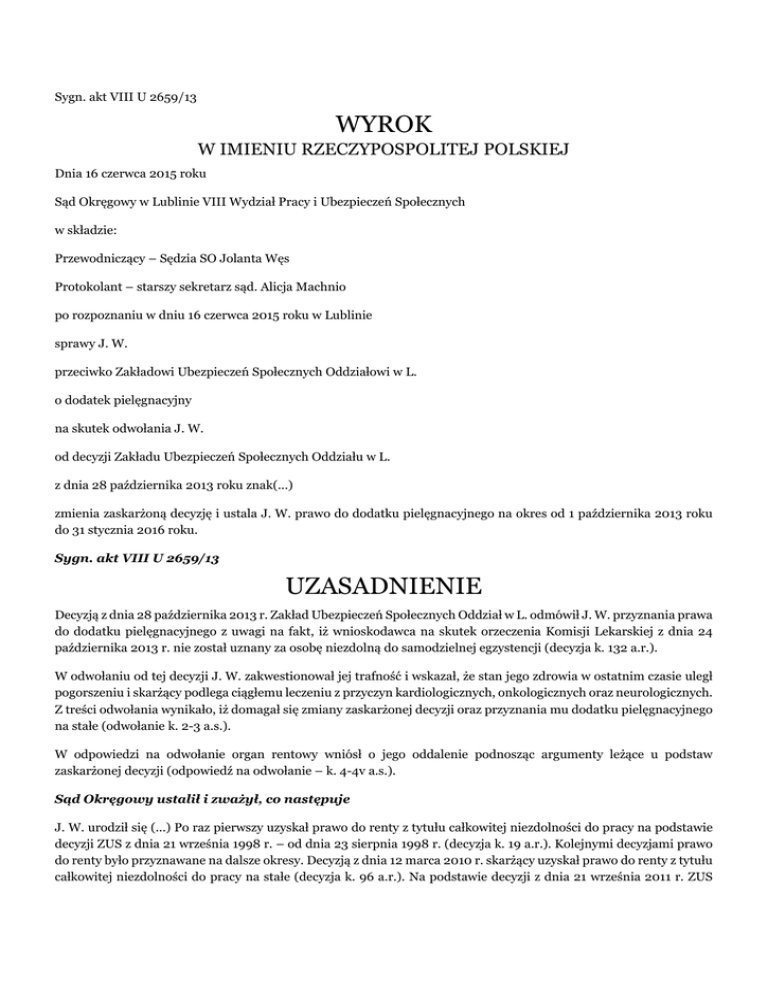 Sygn. akt VIII U 2659/13 WYROK W IMIENIU RZECZYPOSPOLITEJ POLSKIEJ Dnia 16 czerwca 2015 roku Sąd Okręgowy w Lublinie VIII Wydział Pracy i Ubezpieczeń Społecznych w składzie: Przewodniczący – Sędzia SO Jolanta Węs Protokolant – starszy sekretarz sąd. Alicja Machnio po rozpoznaniu w dniu 16 czerwca 2015 roku w Lublinie sprawy J. W. przeciwko Zakładowi Ubezpieczeń Społecznych Oddziałowi w L. o dodatek pielęgnacyjny na skutek odwołania J. W. od decyzji Zakładu Ubezpieczeń Społecznych Oddziału w L. z dnia 28 października 2013 roku znak(...) zmienia zaskarżoną decyzję i ustala J. W. prawo do dodatku pielęgnacyjnego na okres od 1 października 2013 roku do 31 stycznia 2016 roku. Sygn. akt VIII U 2659/13 UZASADNIENIE Decyzją z dnia 28 października 2013 r. Zakład Ubezpieczeń Społecznych Oddział w L. odmówił J. W. przyznania prawa do dodatku pielęgnacyjnego z uwagi na fakt, iż wnioskodawca na skutek orzeczenia Komisji Lekarskiej z dnia 24 października 2013 r. nie został uznany za osobę niezdolną do samodzielnej egzystencji (decyzja k. 132 a.r.). W odwołaniu od tej decyzji J. W. zakwestionował jej trafność i wskazał, że stan jego zdrowia w ostatnim czasie uległ pogorszeniu i skarżący podlega ciągłemu leczeniu z przyczyn kardiologicznych, onkologicznych oraz neurologicznych. Z treści odwołania wynikało, iż domagał się zmiany zaskarżonej decyzji oraz przyznania mu dodatku pielęgnacyjnego na stałe (odwołanie k. 2-3 a.s.). W odpowiedzi na odwołanie organ rentowy wniósł o jego oddalenie podnosząc argumenty leżące u podstaw zaskarżonej decyzji (odpowiedź na odwołanie – k. 4-4v a.s.). Sąd Okręgowy ustalił i zważył, co następuje J. W. urodził się (...) Po raz pierwszy uzyskał prawo do renty z tytułu całkowitej niezdolności do pracy na podstawie decyzji ZUS z dnia 21 września 1998 r. – od dnia 23 sierpnia 1998 r. (decyzja k. 19 a.r.). Kolejnymi decyzjami prawo do renty było przyznawane na dalsze okresy. Decyzją z dnia 12 marca 2010 r. skarżący uzyskał prawo do renty z tytułu całkowitej niezdolności do pracy na stałe (decyzja k. 96 a.r.). Na podstawie decyzji z dnia 21 września 2011 r. ZUS przyznał mu również prawo do dodatku pielęgnacyjnego – od dnia 1 lipca 2011 r. do dnia 30 września 2013 r. (decyzja k. 122 a.r.). W dniu 10 września 2013 r. skarżący złożył wniosek o przyznanie mu dodatku pielęgnacyjnego (podanie k. 123 a.r.). Badający go w dniu 27 września 2013 r. Lekarz Orzecznik ZUS rozpoznał: rak gruczołu krokowego leczony radioterapią i hormonoterapią w 2011 r., przewlekłą niewydolność krążenia NYHA II, stan po implantacji sztucznej zastawki mitralnej i aortalnej w 1998 r., stan po implantacji układu stymulującego, nadciśnienie tętnicze i padaczkę (dokumentacja orzecznicza) i stwierdził, że wnioskodawca nie jest niezdolny do samodzielnej egzystencji (orzeczenie k. 125 a.r.). Badająca skarżącego w dniu 24 października 2013 r. Komisja Lekarska ZUS rozpoznała: rak gruczołu krokowego leczony radioterapią i hormonoterapią w 2011 r., przewlekłą niewydolność krążenia NYHA II, stan po implantacji sztucznej zastawki mitralnej i aortalnej w 1998 r., stan po implantacji układu stymulującego serca z powodu bradyarytmii w 2011 r., stan po operacji przepukliny pachwinowej lewostronnej w 2011 r., kamicze zapalenie pęcherzyka żółciowego w 2012 r., kamicę nerki prawej (dokumentacja orzecznicza) i stwierdziła, że wnioskodawca nie jest niezdolny do samodzielnej egzystencji (orzeczenie Komisji k. 131 a.r.). Powyższe orzeczenie stało się podstawą wydania przez ZUS zaskarżonej decyzji (decyzja k. 132 a.r.). W toku postępowania, celem ustalenia czy odwołujący się jest niezdolny do samodzielnej egzystencji Sąd Okręgowy dopuścił dowód z opinii biegłych z zakresu kardiologii, onkologii, chirurgii, urologii i gastrologii (postanowienie k. 6-7 a.s.). W opinii z dnia 28 stycznia 2014 r. biegli: chirurg dr E. D., kardiolog dr A. M. (2), urolog dr W. L., onkolog dr A. C. rozpoznali u badanego: stan po wszczepieniu sztucznej zastawki aortalnej i mitralnej, stan po wszczepieniu stymulatora z powodu zaburzeń rytmu serca, stan po radioterapii z powodu raka prostaty, hormonoterapię w trakcie, kamicę nerki prawej w wywiadzie, kamicę pęcherzyka żółciowego, przewlekłe popromienne uszkodzenie narządów miednicy małej z krwotocznym zapaleniem błony śluzowej odbytnicy oraz szczelinę odbytu i stwierdzili, że skarżący jest całkowicie niezdolny do pracy i całkowicie niezdolny do samodzielnej egzystencji od dnia 1 października 2013 r. z ogólnego stanu zdrowia; całkowita niezdolność do pracy jest trwała, zaś niezdolność do samodzielnej egzystencji będzie trwała przez okres 2 lat – do dnia 31 stycznia 2016 r. W uzasadnieniu opinii biegli wskazali, że skarżący od 2012 r. był poddawany leczeniu z powodu wykrytego zaawansowanego miejscowo raka gruczołu krokowego. Otrzymał wówczas dawkę 7400 cGy podczas radioterapii na obszar podbrzusza, nadto włączono wówczas leczenie hormonalne, które jest kontynuowane. Aktualnie nie ma u skarżącego cech wznowy nowotworu, jednakże z powodu przeprowadzonej radioterapii aktualnie występują u niego cechy ciężkiego popromiennego uszkodzenia narządów miednicy małej, co objawia się powtarzającymi się krwotokami z odbytnicy, przewlekłym zespołem biegunowym z nietrzymaniem stolca, dolegliwościami bólowymi w podbrzuszu z okresowymi parciami na odbytnicę, nawracającymi stanami zapalnymi dróg moczowych. Biegli wskazali, iż stan ten potwierdza przeprowadzone w dniu 30 stycznia 2013 r. badanie kolonoskopii, które wykazało popromiennie krwotoczne zapalenie błony śluzowej odbytnicy i obecność szczeliny w kanale odbytu. Z kardiologicznego punktu widzenia biegli wskazali, że fakt przebycia przez opiniowanego operacji kardiochirurgicznej z następową koniecznością leczenia przeciwzakrzepowego 