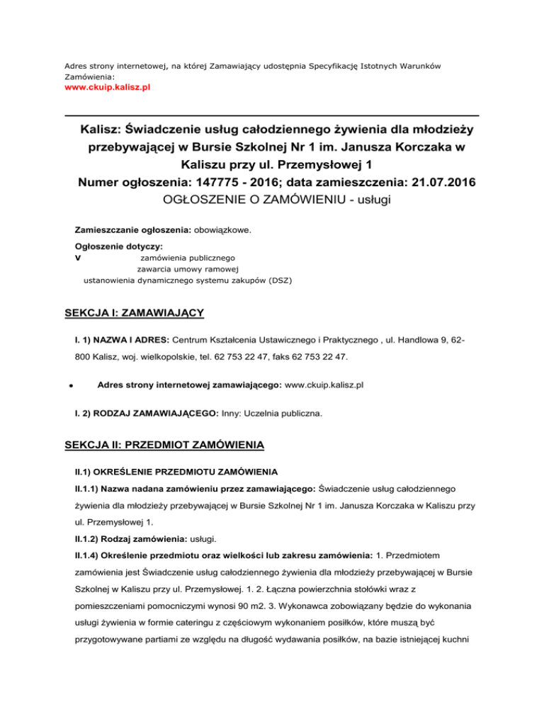 Adres strony internetowej, na której Zamawiający udostępnia Specyfikację Istotnych Warunków Zamówienia: www.ckuip.kalisz.pl Kalisz: Świadczenie usług całodziennego żywienia dla młodzieży przebywającej w Bursie Szkolnej Nr 1 im. Janusza Korczaka w Kaliszu przy ul. Przemysłowej 1 Numer ogłoszenia: 147775 - 2016; data zamieszczenia: 21.07.2016 OGŁOSZENIE O ZAMÓWIENIU - usługi Zamieszczanie ogłoszenia: obowiązkowe. Ogłoszenie dotyczy: V zamówienia publicznego zawarcia umowy ramowej ustanowienia dynamicznego systemu zakupów (DSZ) SEKCJA I: ZAMAWIAJĄCY I. 1) NAZWA I ADRES: Centrum Kształcenia Ustawicznego i Praktycznego , ul. Handlowa 9, 62800 Kalisz, woj. wielkopolskie, tel. 62 753 22 47, faks 62 753 22 47. Adres strony internetowej zamawiającego: www.ckuip.kalisz.pl I. 2) RODZAJ ZAMAWIAJĄCEGO: Inny: Uczelnia publiczna. SEKCJA II: PRZEDMIOT ZAMÓWIENIA II.1) OKREŚLENIE PRZEDMIOTU ZAMÓWIENIA II.1.1) Nazwa nadana zamówieniu przez zamawiającego: Świadczenie usług całodziennego żywienia dla młodzieży przebywającej w Bursie Szkolnej Nr 1 im. Janusza Korczaka w Kaliszu przy ul. Przemysłowej 1. II.1.2) Rodzaj zamówienia: usługi. II.1.4) Określenie przedmiotu oraz wielkości lub zakresu zamówienia: 1. Przedmiotem zamówienia jest Świadczenie usług całodziennego żywienia dla młodzieży przebywającej w Bursie Szkolnej w Kaliszu przy ul. Przemysłowej. 1. 2. Łączna powierzchnia stołówki wraz z pomieszczeniami pomocniczymi wynosi 90 m2. 3. Wykonawca zobowiązany będzie do wykonania usługi żywienia w formie cateringu z częściowym wykonaniem posiłków, które muszą być przygotowywane partiami ze względu na długość wydawania posiłków, na bazie istniejącej kuchni mieszczącej się przy ul. Przemysłowej 1. 4. Wykonawca zobowiązany jest do przygotowania i wydawania czterech posiłków dziennie przez 5 dni w tygodniu dla 120 wychowanków Bursy Szkolnej Nr 1 w dniach nauki szkolnej z uwzględnieniem przerw świątecznych, wakacji i ferii oraz absencji chorobowej ucznia. Wykonawca będzie przygotowywał posiłki, uwzględniając podstawowe składniki i produkty spożywcze wysokiej jakości, stosowane w żywieniu, zachowując wymogi sanitarno-epidemiologiczne w zakresie higieny osobistej personelu Wykonawcy, warunków przygotowywania i podawania posiłków zgodnie z Rozporządzeniem Ministra Zdrowia z dnia 26 sierpnia 2015r. w sprawie grup środków spożywczych przeznaczonych do sprzedaży dzieciom i młodzieży w jednostkach systemu oświaty oraz wymagań, jakie muszą spełniać środki spożywcze stosowane w ramach żywienia zbiorowego dzieci i młodzieży w tych jednostkach (Dz. U. 2015r. poz.1256) 5. Zamawiający zastrzega sobie prawo do składania zamówień na posiłki w sobotę i niedzielę po uprzednim zgłoszeniu. 6. Zamawiający zastrzega sobie prawo do składania zamówień na posiłki z podziałem na odpowiednie diety . 7. Wykonawca zobowiązany jest do przygotowania i wydawania ilości posiłków zgodnie z odpowiednią dietą oraz do opracowywania dekadowych jadłospisów z uwzględnieniem odpowiedniej diety.. 8. Koszt surowca przeznaczonego na wyżywienie na jedną osobę dziennie musi wynosić 11,00 zł. 9. Wykonawca zobowiązany jest do terminowego wydawania posiłków zgodnie z ustalonymi z Zamawiającym godzinami posiłków. Wydawanie posiłków przez Wykonawcę będzie odbywać się od poniedziałku do piątku zgodnie z organizacją roku szkolnego i zapotrzebowaniem w następujących godzinach: śniadanie w godz. 6:30 - 8:30, drugie śniadanie , (na wynos) przygotowane przez wychowanka, obiad w godz. 13:30 15.30, kolacja w godz. 18:30 - 20:00. Wydawanie posiłków może ulec zmianom, które wynikać będą z planów zajęć edukacyjnych wychowanków lub dotyczyć będą przerw świątecznych czy ferii. 10. Zapotrzebowanie na posiłki będzie składane codziennie przez osobę wyznaczoną do kontaktu z upoważnioną osobą ze strony Wykonawcy wg ustalonego harmonogramu. 11. Posiłki muszą być przygotowane estetycznie i wydawane w formie stołu szwedzkiego. Potrawy gorące wydawane mogą być w formie porcjowanej z wyłączeniem zimnych dodatków wchodzących w skład dania gorącego. Wszystkie posiłki muszą być podane na zastawie stołowej Wykonawcy. W trakcie trwania umowy Wykonawca na bieżąco uzupełnia braki w zastawie stołowej oraz usuwa z obiegu naczynia popękane i uszkodzone. 12. Posiłki obiadowe lub inne dania gorące muszą być wydawane z bemarów i podgrzewaczy oraz posiadać odpowiednią temperaturę zgodnie z obowiązującymi normami. 13. Wykonawca musi przedstawić Zamawiającemu z tygodniowym wyprzedzeniem dekadowy jadłospis autoryzowany przez dietetyka z określeniem składu posiłku, kaloryczności i gramatury oraz nazwy wędlin, serów, zup, potraw mięsnych, warzyw, owoców, głównych składników sałatek itp. do stwierdzenia zgodności z umową. Zamawiający w ciągu trzech dni od złożenia przez Wykonawcę dekadowego jadłospisu ma prawo do dokonywania w nim zmian w przypadku stwierdzenia niezgodności z umową. Wykonawca ma obowiązek uwzględnienia zmian. 14. Wykonawca zobowiązany jest do stosowania obowiązujących od 13 grudnia 2014 roku przepisów Rozporządzenia Parlamentu Europejskiego i Rady Nr 1169-2011 w sprawie informowania konsumentów żywienia zbiorowego o substancjach lub produktach powodujących alergie lub reakcje nietolerancji zwanych alergenami. Informacje o alergenach powinny być w sposób czytelny wykazywane w jadłospisach umieszczanych na stołówce. 15. Przygotowane posiłki muszą odpowiadać normom żywieniowym, obowiązującym w tzw. punktach zbiorowego żywienia, tj. posiłki powinny być przygotowane zgodnie z zasadami racjonalnego żywienia, sporządzone z pełnowartościowych, świeżych artykułów spożywczych posiadających aktualne terminy ważności wg wymogów sztuki kulinarnej i sanitarnej zgodnie z ustawą z dnia 25 sierpnia 2006r. o bezpieczeństwie ż