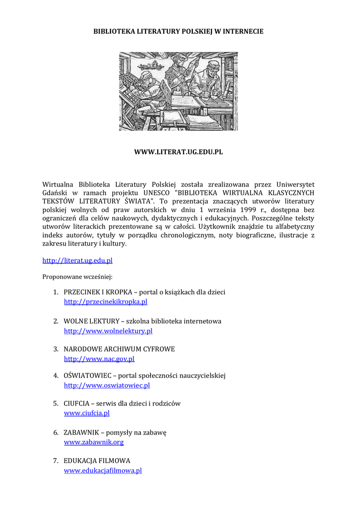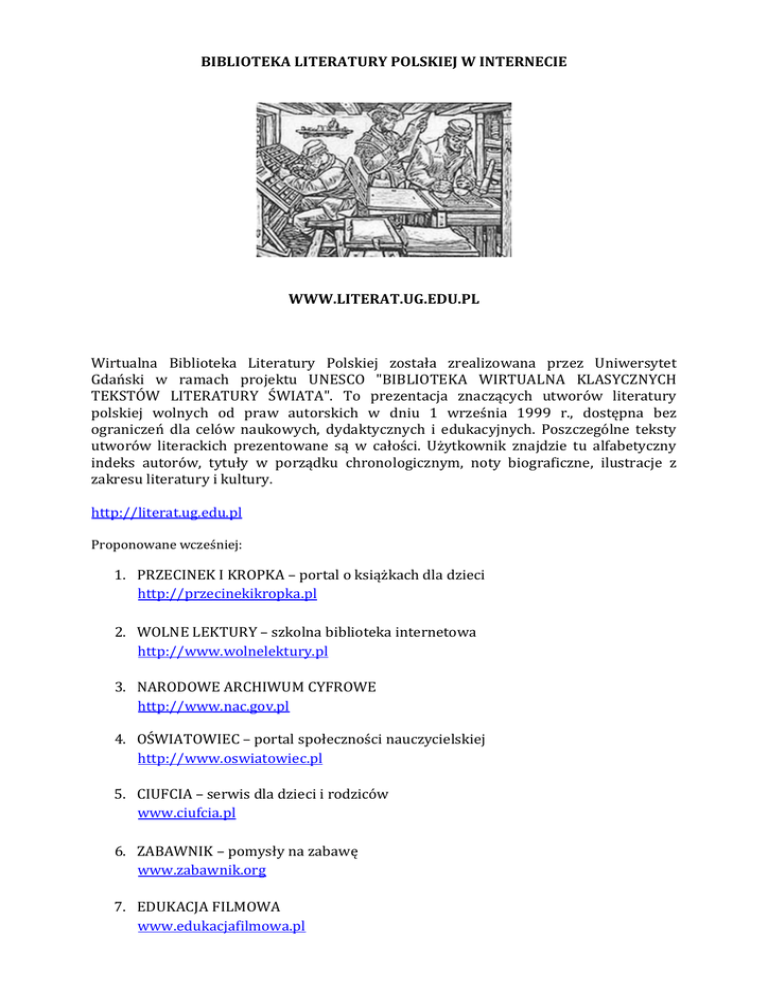 BIBLIOTEKA LITERATURY POLSKIEJ W INTERNECIE WWW.LITERAT.UG.EDU.PL Wirtualna Biblioteka Literatury Polskiej została zrealizowana przez Uniwersytet Gdański w ramach projektu UNESCO "BIBLIOTEKA WIRTUALNA KLASYCZNYCH TEKSTÓW LITERATURY ŚWIATA". To prezentacja znaczących utworów literatury polskiej wolnych od praw autorskich w dniu 1 września 1999 r., dostępna bez ograniczeń dla celów naukowych, dydaktycznych i edukacyjnych. Poszczególne teksty utworów literackich prezentowane są w całości. Użytkownik znajdzie tu alfabetyczny indeks autorów, tytuły w porządku chronologicznym, noty biograficzne, ilustracje z zakresu literatury i kultury. http://literat.ug.edu.pl Proponowane wcześniej: 1. PRZECINEK I KROPKA – portal o książkach dla dzieci http://przecinekikropka.pl 2. WOLNE LEKTURY – szkolna biblioteka internetowa http://www.wolnelektury.pl 3. NARODOWE ARCHIWUM CYFROWE http://www.nac.gov.pl 4. OŚWIATOWIEC – portal społeczności nauczycielskiej http://www.oswiatowiec.pl 5. CIUFCIA – serwis dla dzieci i rodziców www.ciufcia.pl 6. ZABAWNIK – pomysły na zabawę www.zabawnik.org 7. EDUKACJA FILMOWA www.edukacjafilmowa.pl